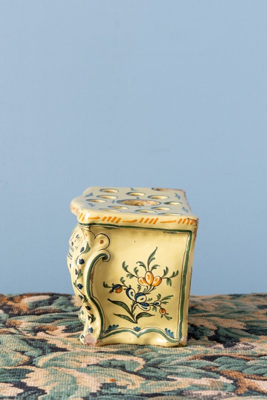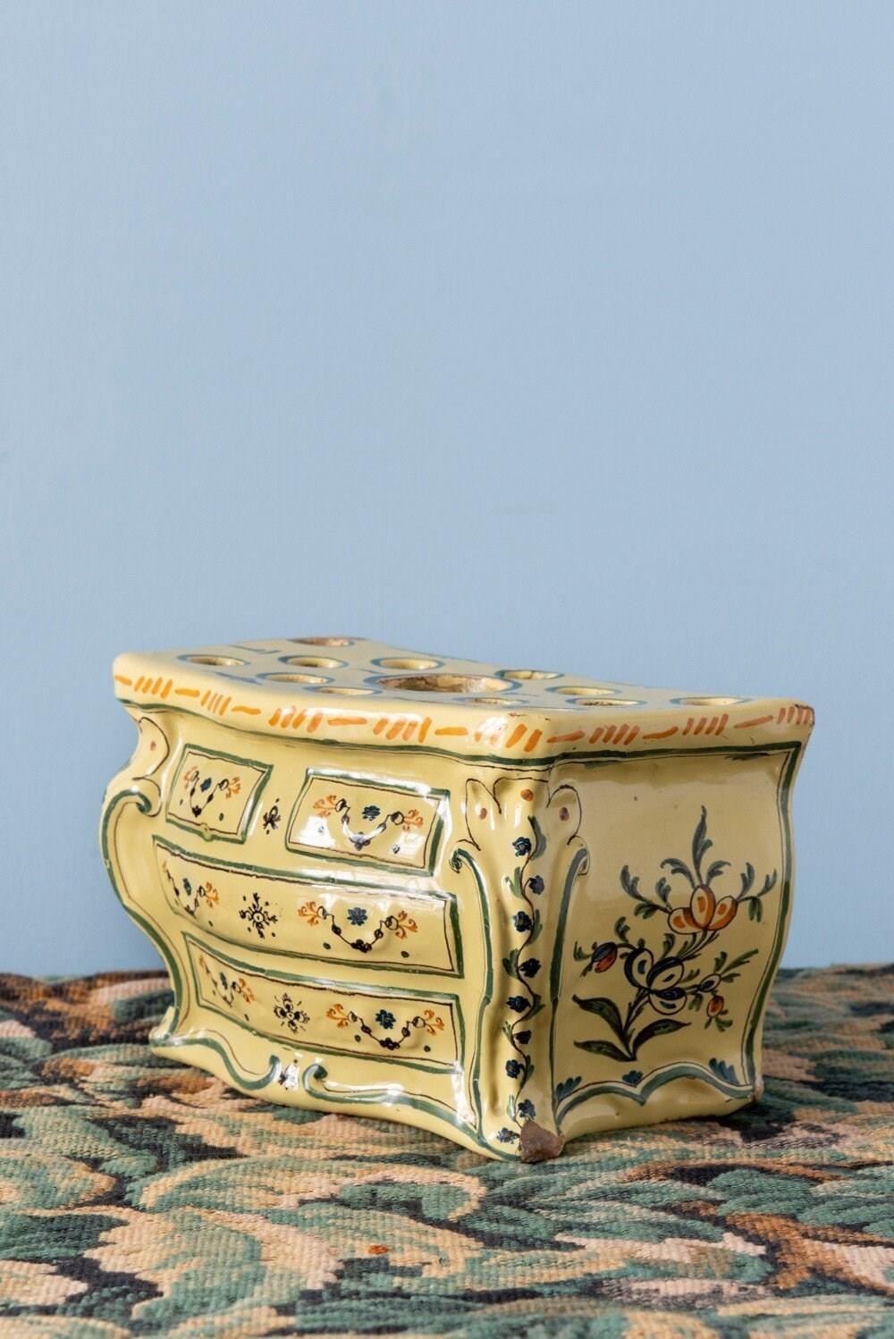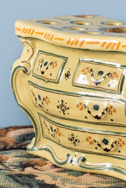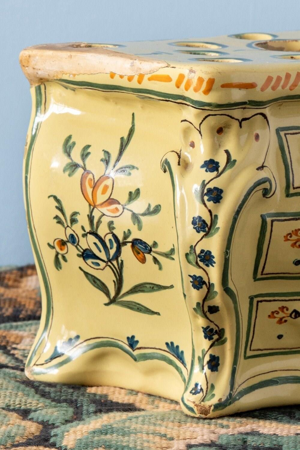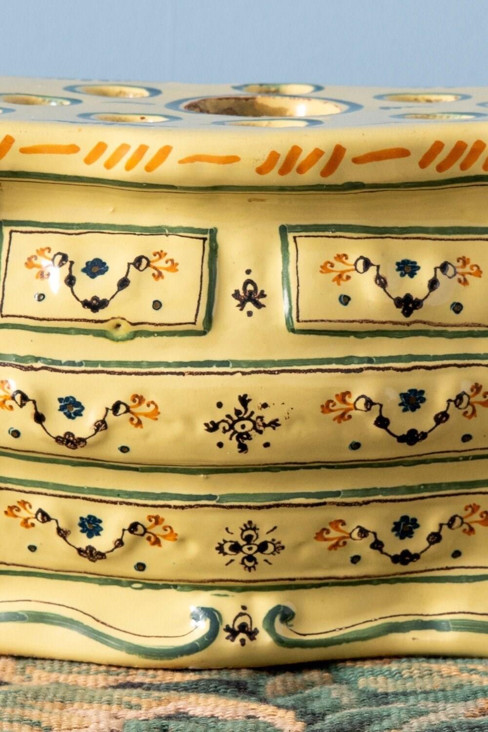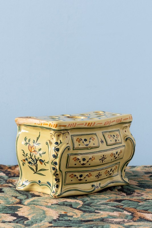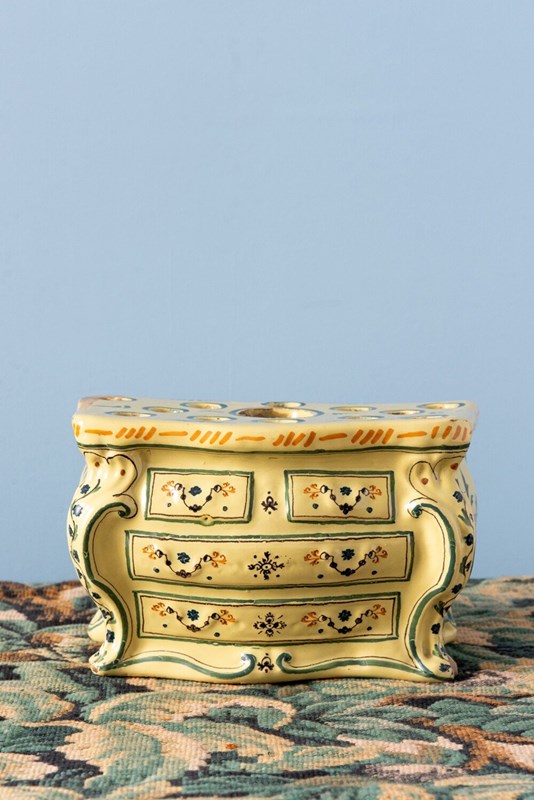 A rare 18th-century French faience bough pot from Nevers, modelled in the playful form of a commode. Complete with finely detailed drawers, handles and gilt-bronze accents, its rounded body is elegantly painted in bright yellow, blue and orange. The front features elaborate floral patterns framed by scrolls and stripes, while each side is adorned with delicate sprays of flowers. Designed with one large openings and twelve smaller ones, this exquisite piece is perfect for elaborate floral displays and equally striking as a decorative object year-round.