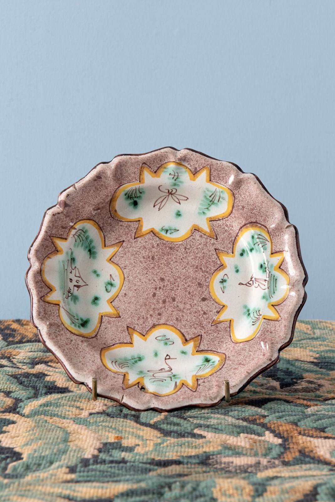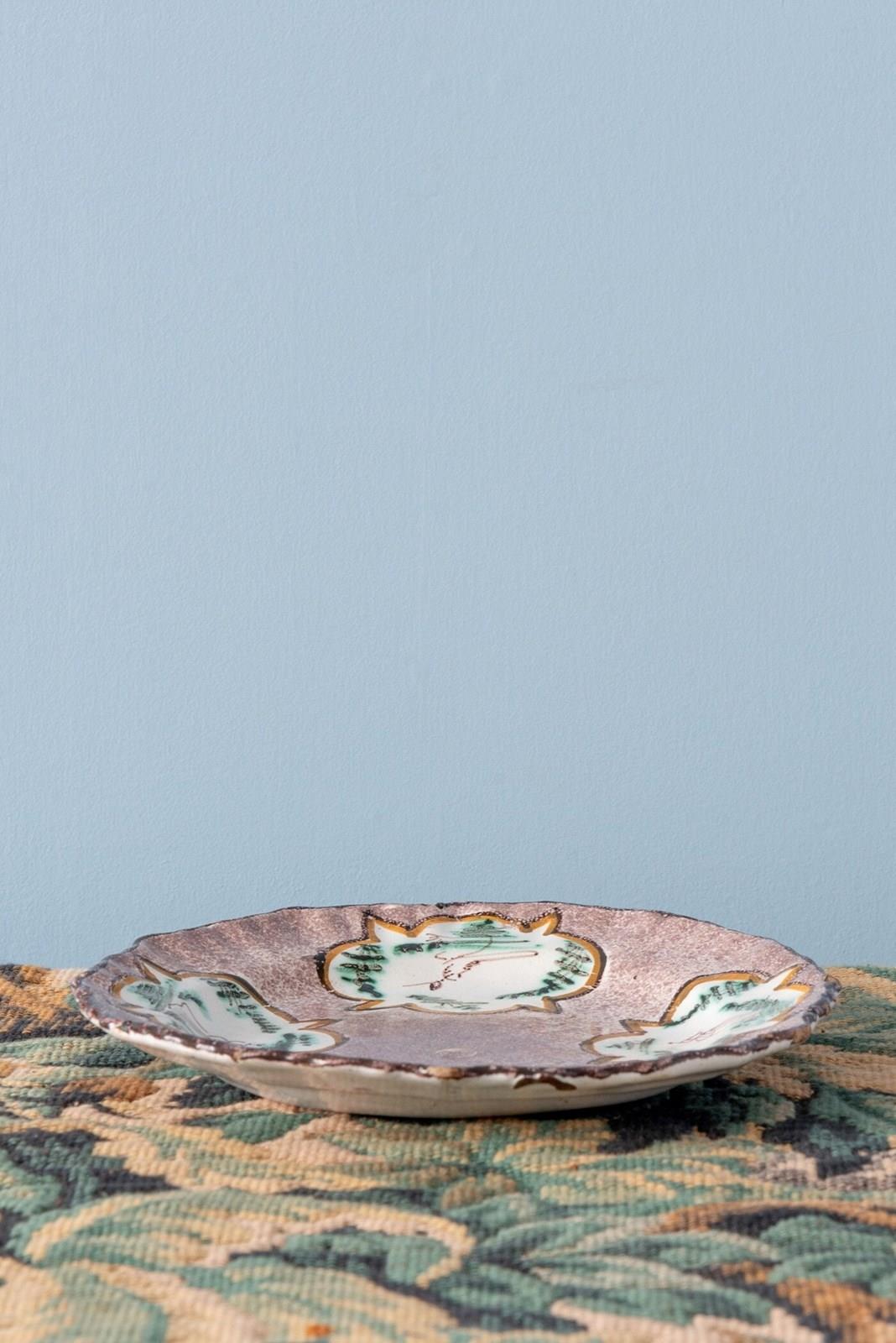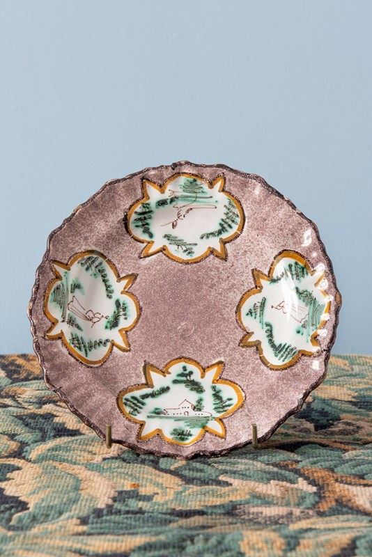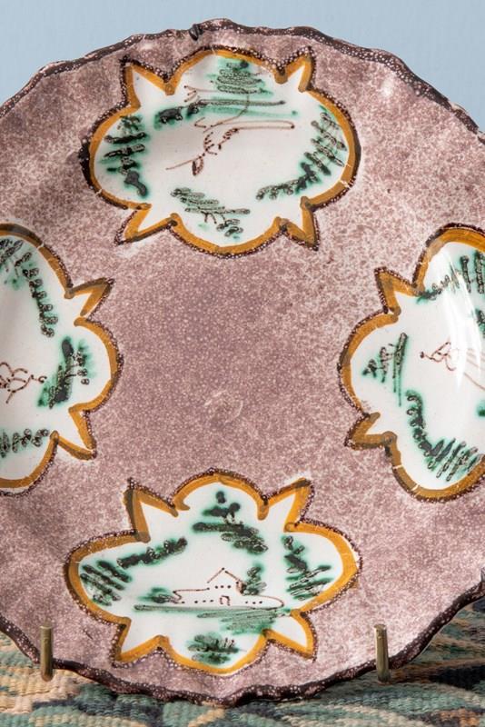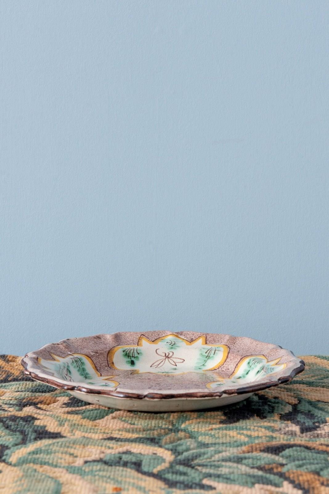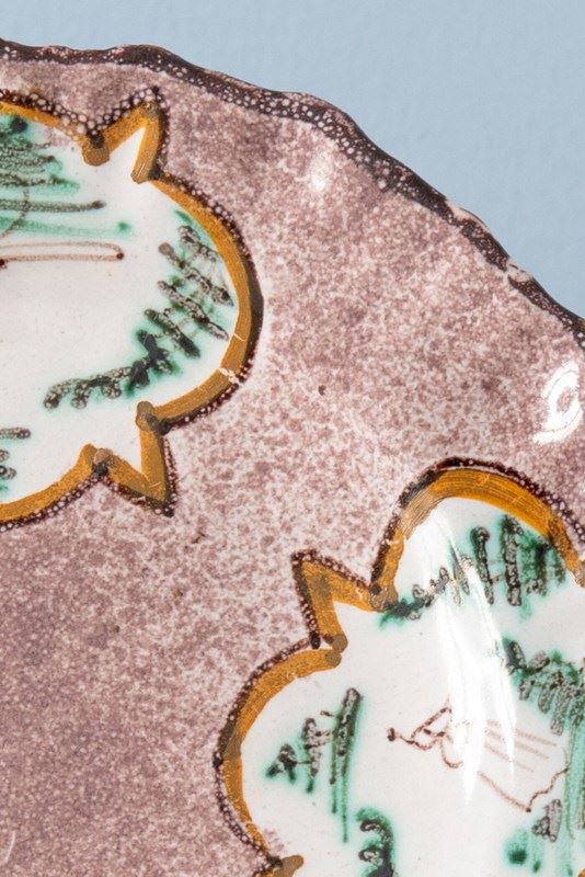 The edge is delicately shaped and finished with a dark line, the lip softly fluted. The shaped reserves echo the outline of the plate itself, while the drawings within carry a charming pastoral character.