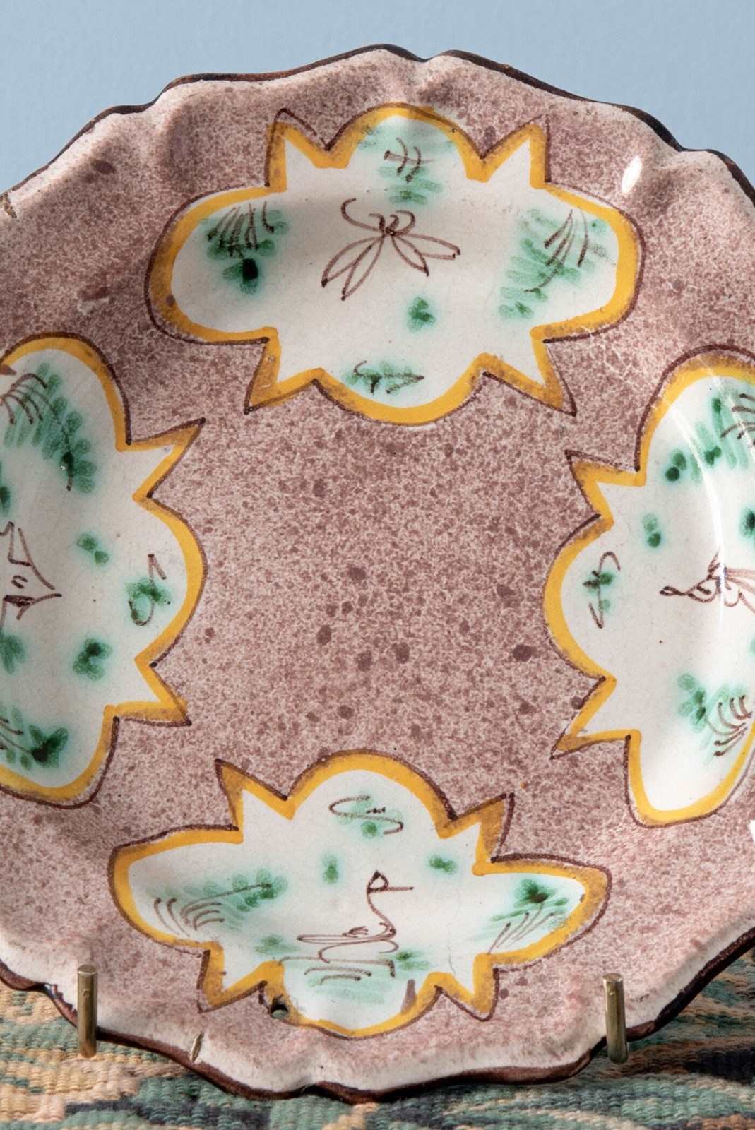 A pair of 18th-century Belgian faience plates from Brussels. Each plate is decorated with four foliate-shaped reserves outlined in yellow, depicting figures, birds, insects and houses amid green foliage, set against a soft spongeware ground in manganese.
