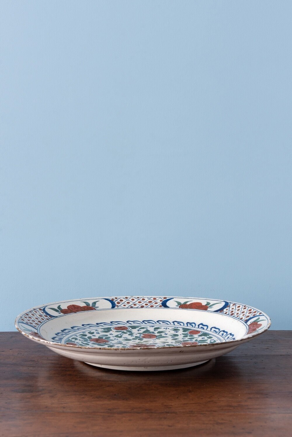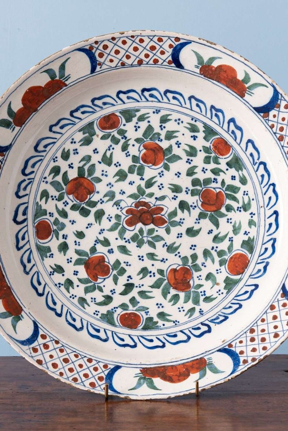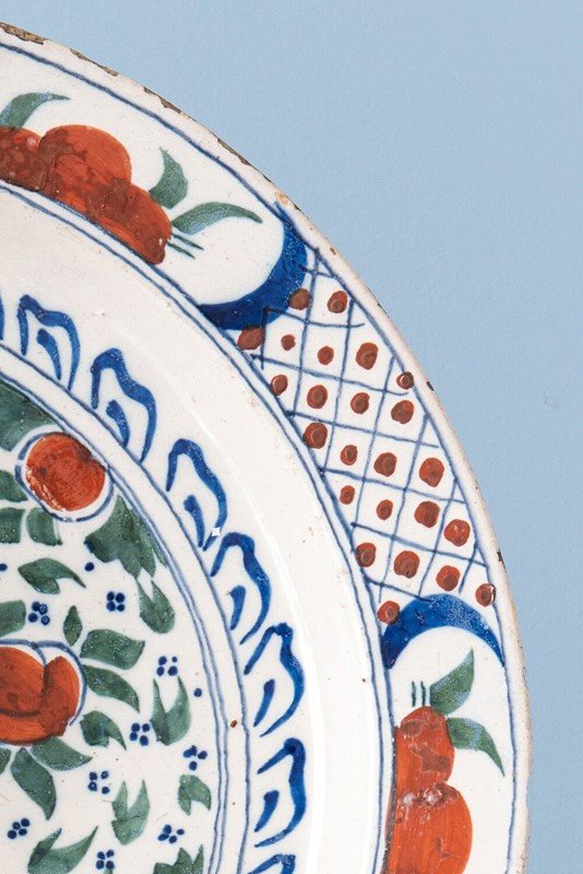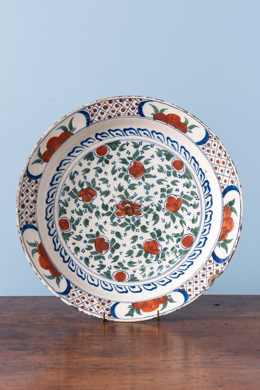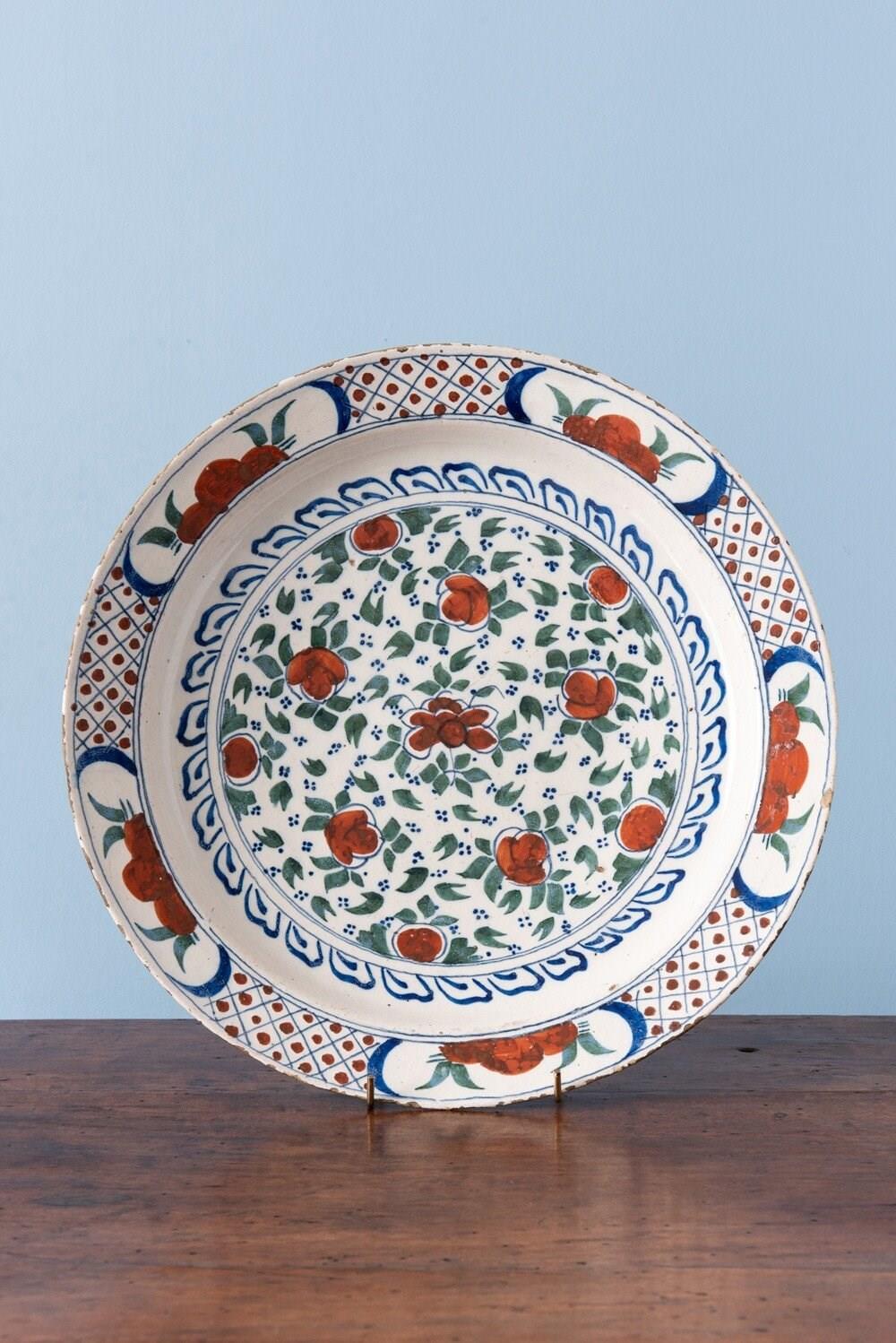 This fine pair of 18th-century Dutch Delft dishes is decorated in a lively palette of green, blue, and red. At the centre, stylised red flowers are framed by green foliage and delicate blue dots, surrounded by elegant blue motifs. The lip is adorned with flowers and foliage in reserves, alternating with red dots and crisscross patterns. Of large and shallow form, each dish is marked underneath. A rare and harmonious pair with vibrant colours and intricate decoration.