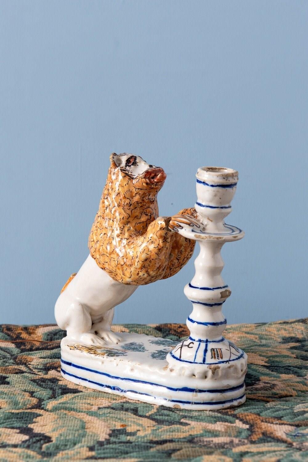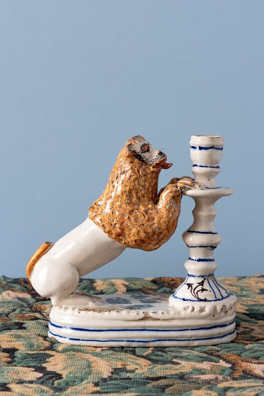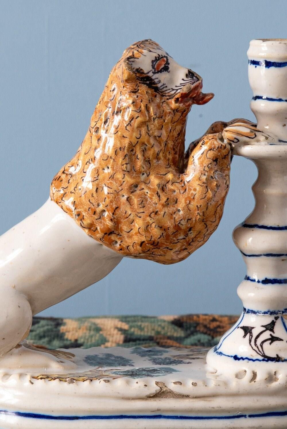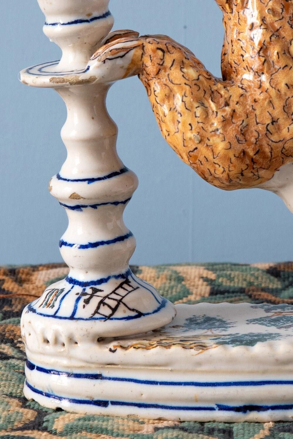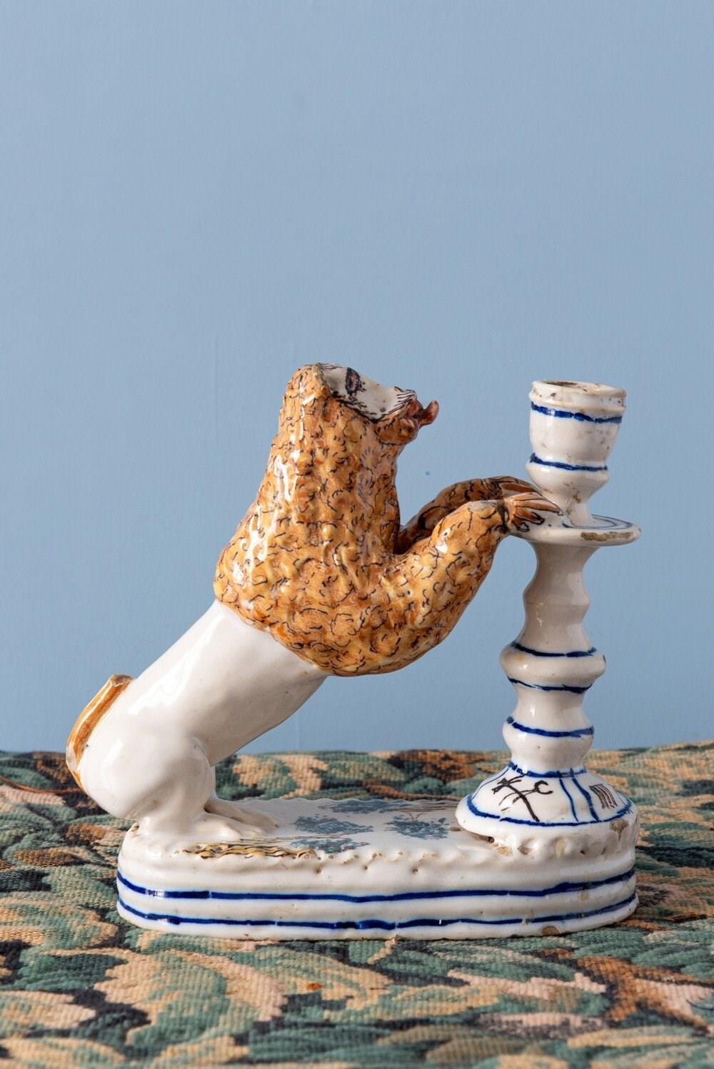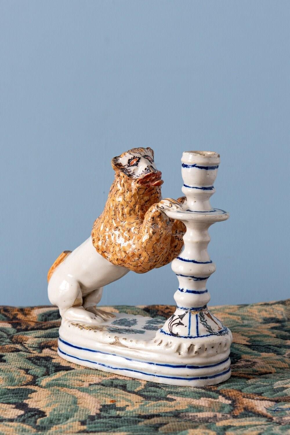 A rare 18th-century Italian faience pair of candlesticks with striking lion supports. Each lion, with its distinctive expressive face, mane painted in yellow and black, and playful tongue, rests on a base adorned with green trees, combining folk charm with a vibrant interplay of colour and texture. The turned candlestick forms, highlighted with blue and decorated with religious and craft motifs, complete this sculptural and whimsical group. A joyful statement piece, this pair stands out for its originality, vernacular character, and distinctive presence.