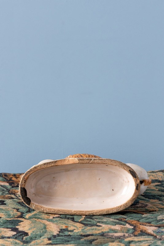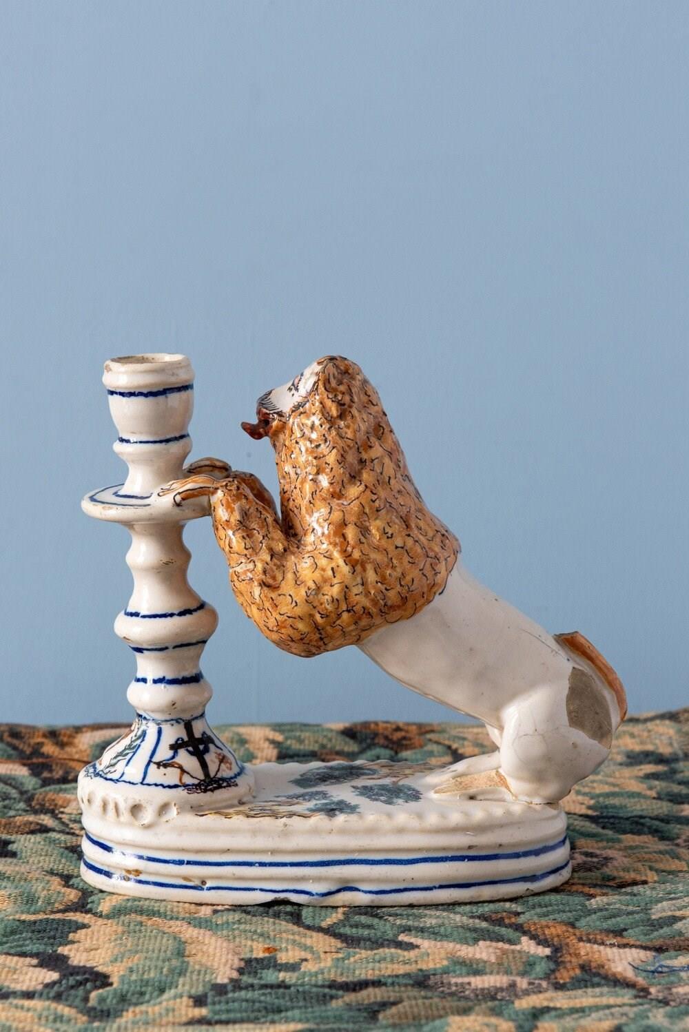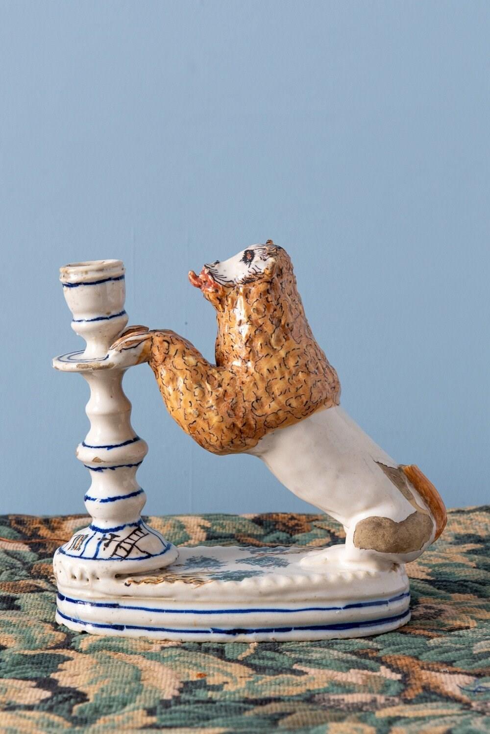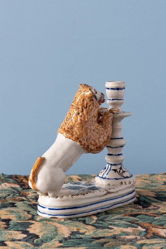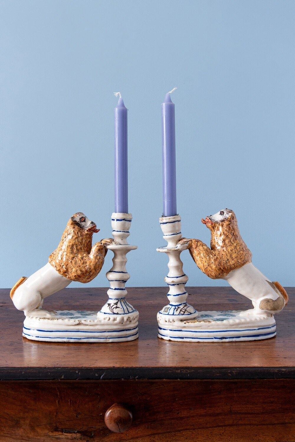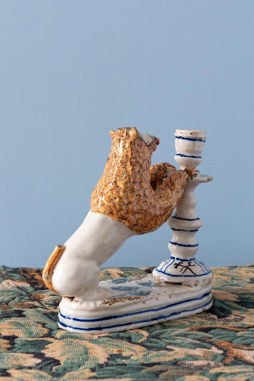 A rare 18th-century Italian faience pair of candlesticks with striking lion supports. Each lion, with its distinctive expressive face, mane painted in yellow and black, and playful tongue, rests on a base adorned with green trees, combining folk charm with a vibrant interplay of colour and texture. The turned candlestick forms, highlighted with blue and decorated with religious and craft motifs, complete this sculptural and whimsical group. A joyful statement piece, this pair stands out for its originality, vernacular character, and distinctive presence.