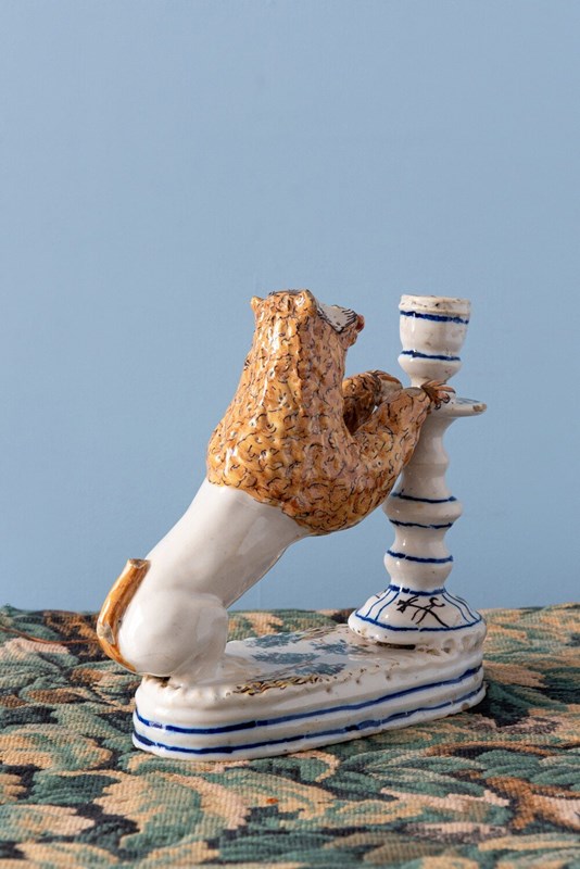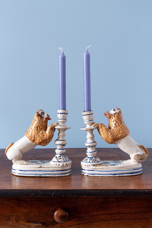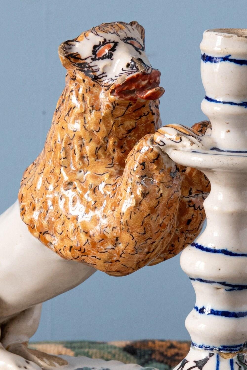 Pair Of Italian Lion Faience Candlesticks, 18Th Century