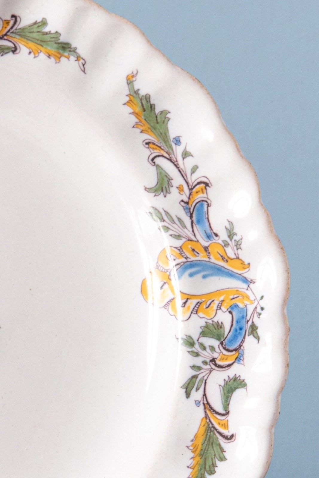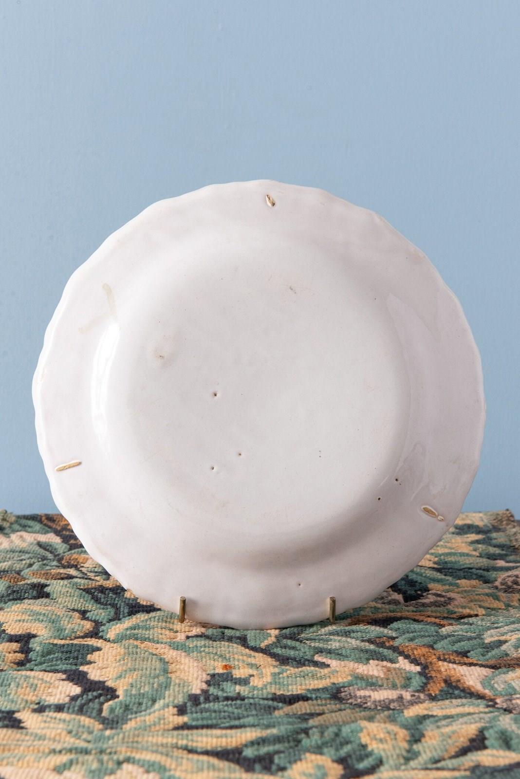 The fluted lip displays a frieze of shell ornaments and foliage in dynamic curves and counter-curves typical of Rococo ornamentation, the lines elegant and animated. The edge is delicately shaped, enhancing the plates' refined profile.