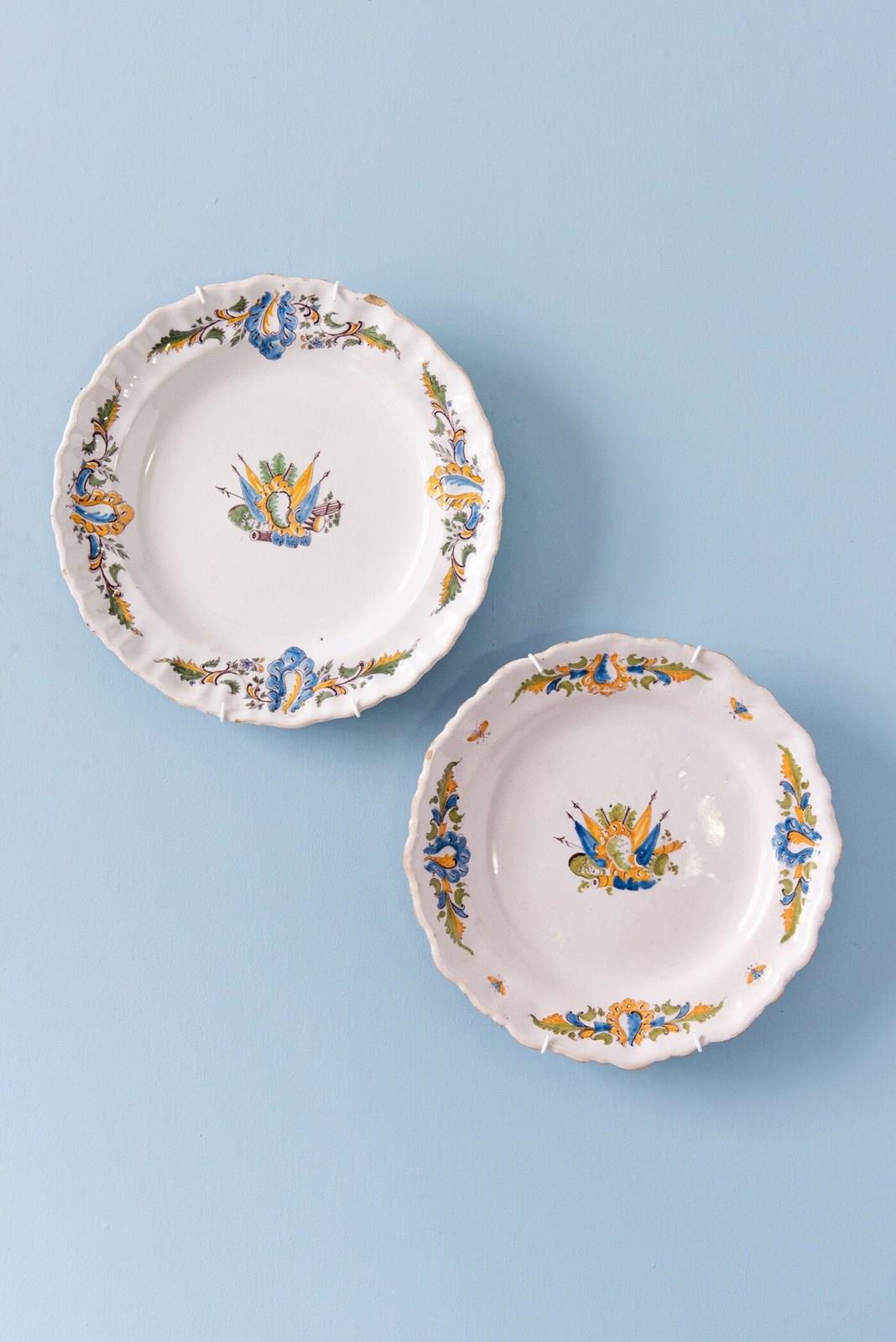A pair of mid-18th-century French faience plates from Moustiers, decorated with the characteristic 'flag' pattern featuring a central flag motif surrounded by military trophies, spears and drums.