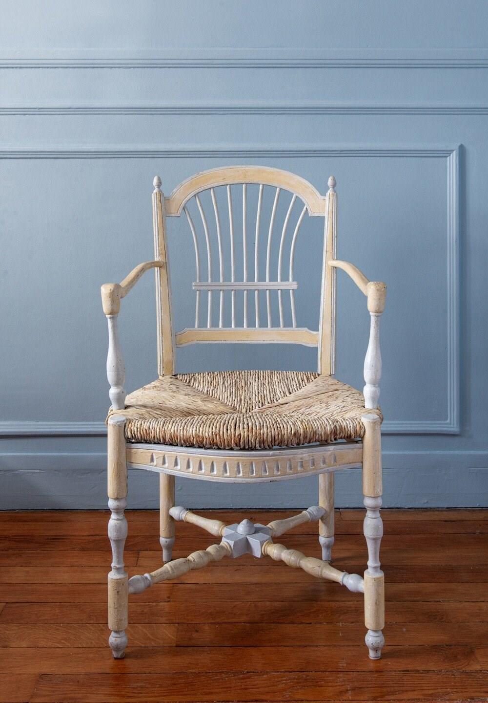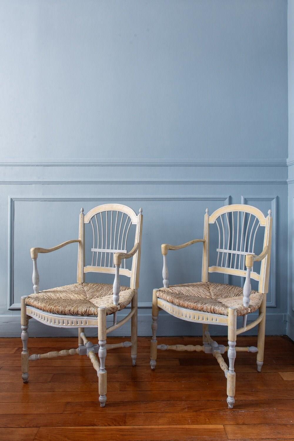 A pair of late 19th-century French rush-seat armchairs from Provence, retaining their original two-tone painted finish in soft yellow and light grey, gently worn to an authentic patina. The arched backs are carved in soft curves with shaped splats, while slightly scrolled armrests rest on turned supports. Rush seats are framed by shaped aprons, and turned legs are joined by an entretoise. With their warm colours and graceful design, this rare pair of rustic armchairs displays Provençal charm and elegant craftsmanship.