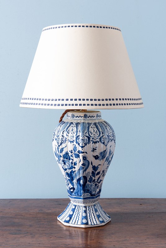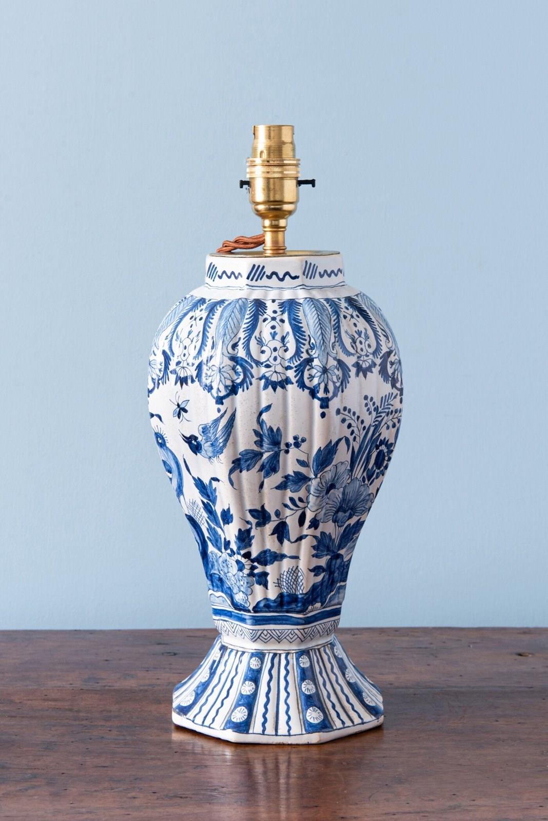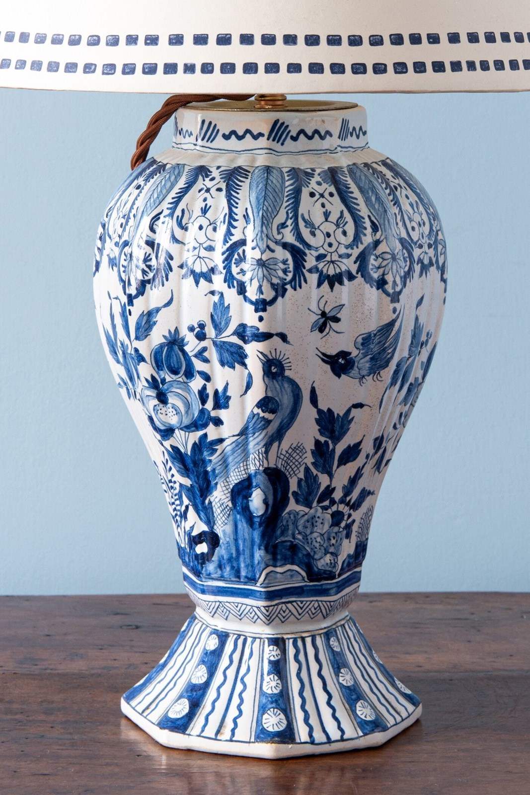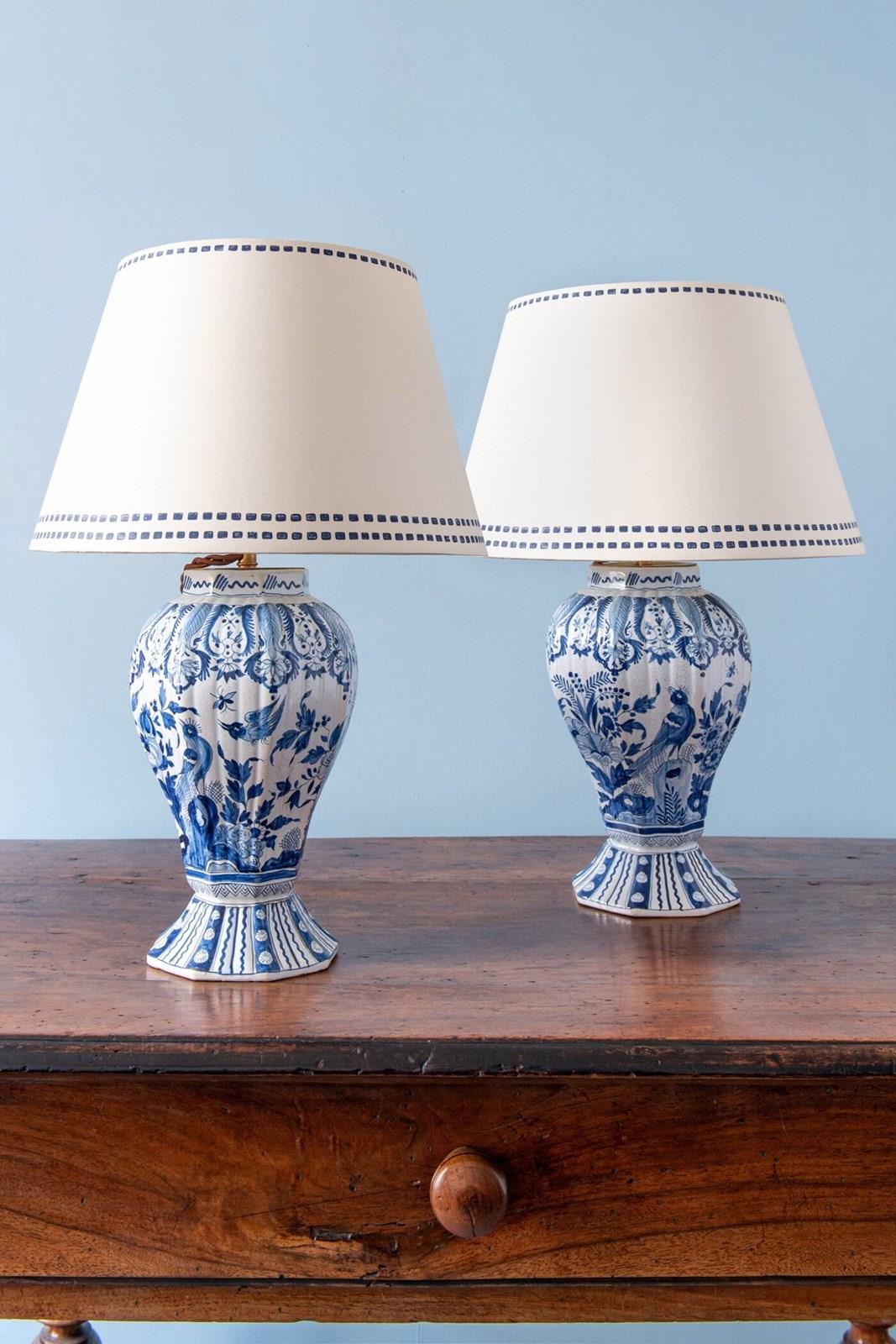 A pair of 19th-century French faience vases from Samson, converted to table lamps. Decorated in blue and white in the Delft style, with birds surrounded by abundant bushes of flowers and butterflies. At the top, a lively frieze of lambrequins and foliage, while dashes and geometric patterns adorn the foot.
