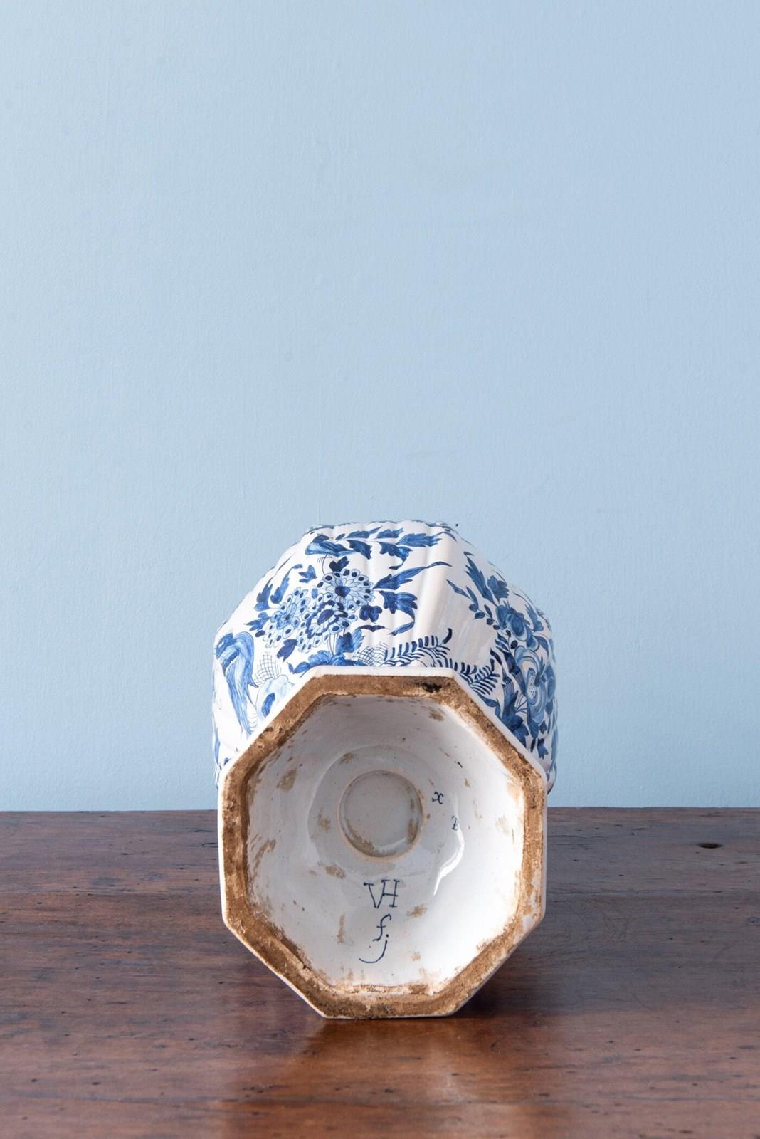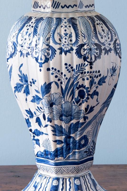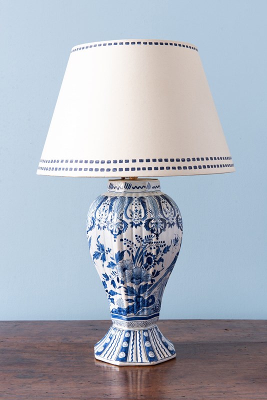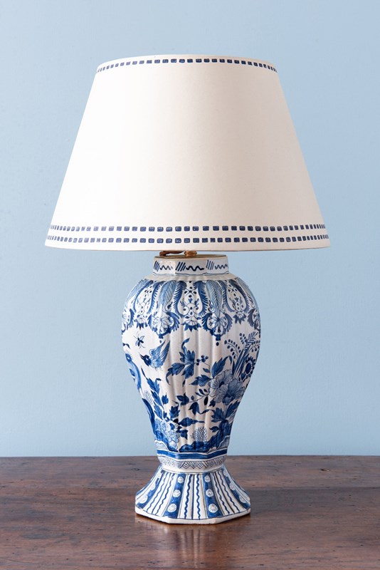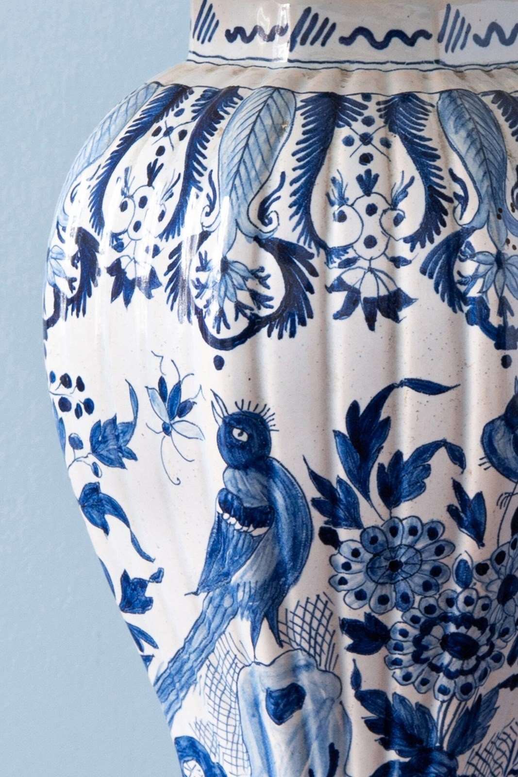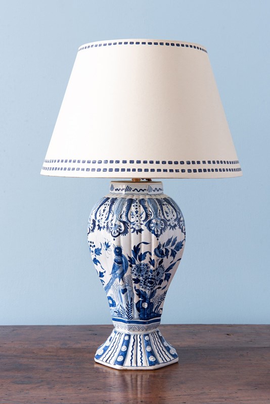A pair of 19th-century French faience vases from Samson, converted to table lamps. Decorated in blue and white in the Delft style, with birds surrounded by abundant bushes of flowers and butterflies. At the top, a lively frieze of lambrequins and foliage, while dashes and geometric patterns adorn the foot.