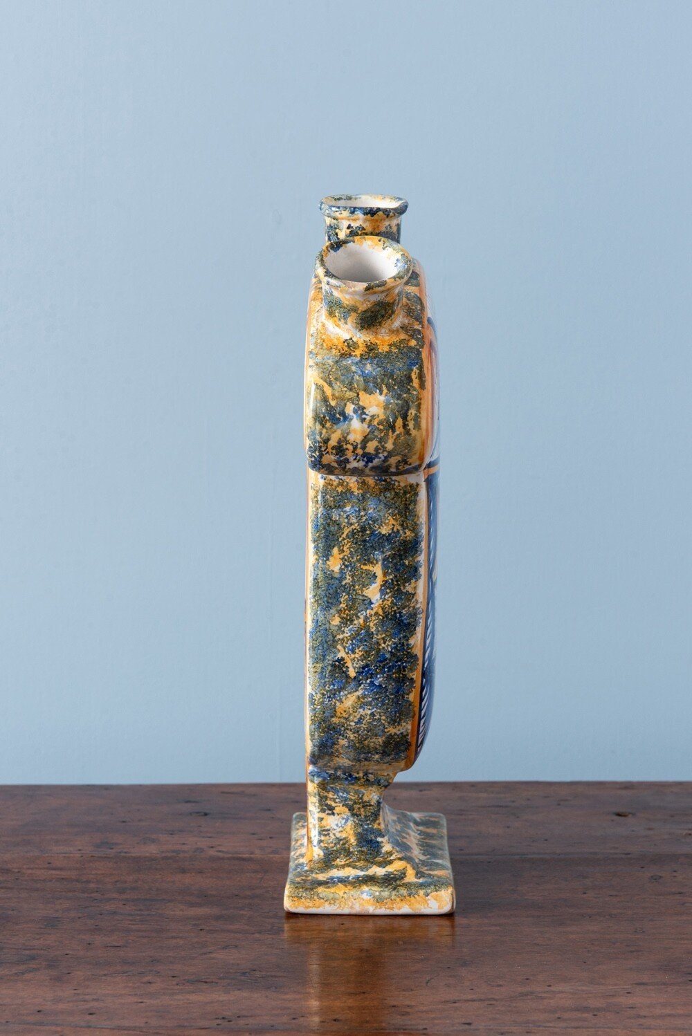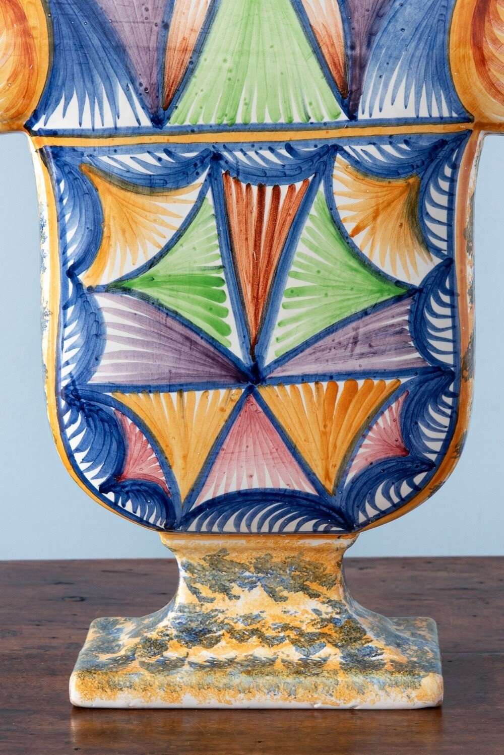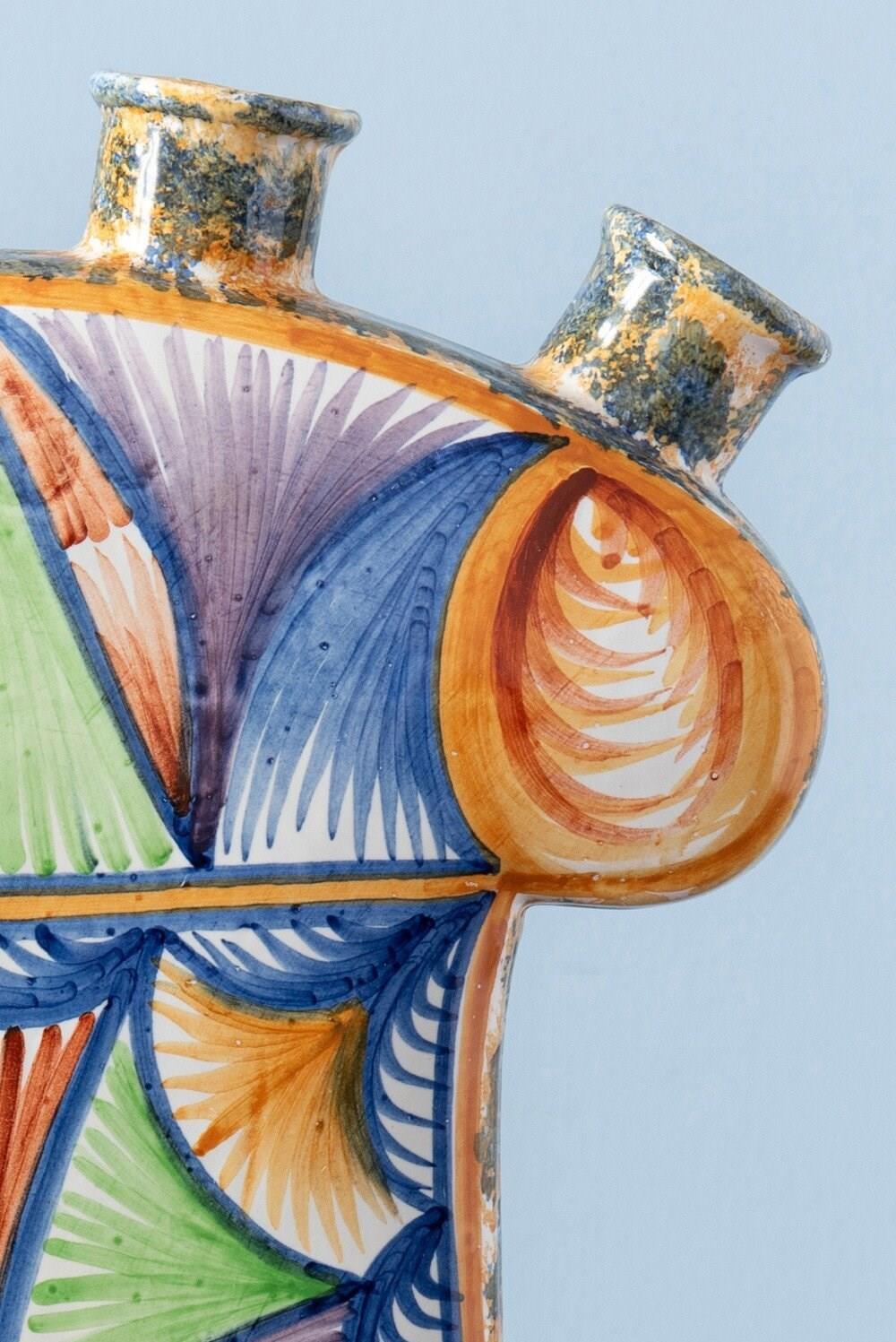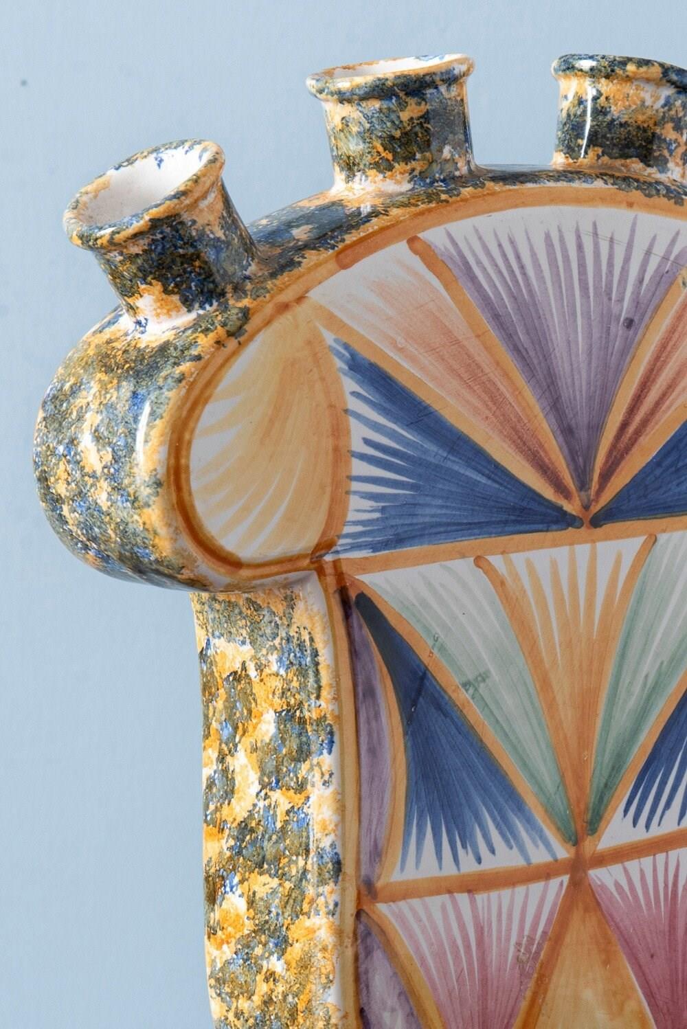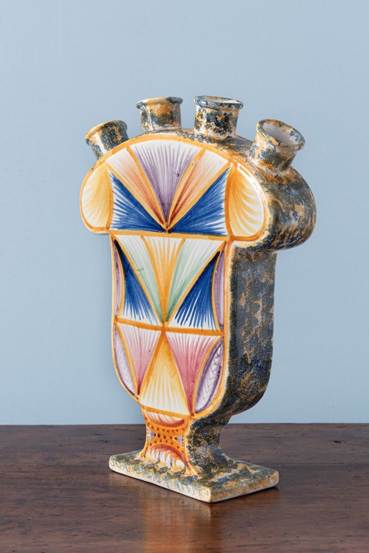 This 1950s French faience tulipiere from Quimper is decorated in a vibrant and unusual palette of blue, green, orange, and purple. The body is covered with radiating abstract brushstrokes arranged in geometric shapes, set against intricate wavy patterns in blue on one side, and larger, lighter shapes on the other. The piedouche and sides are adorned with lively spongeware motifs in blue on an orange ground. With a classic tulipiere form and generous scale, it features four openings at the top for displaying cut flowers. In excellent condition, a distinctive piece with vivid colours and dynamic, engaging decoration.