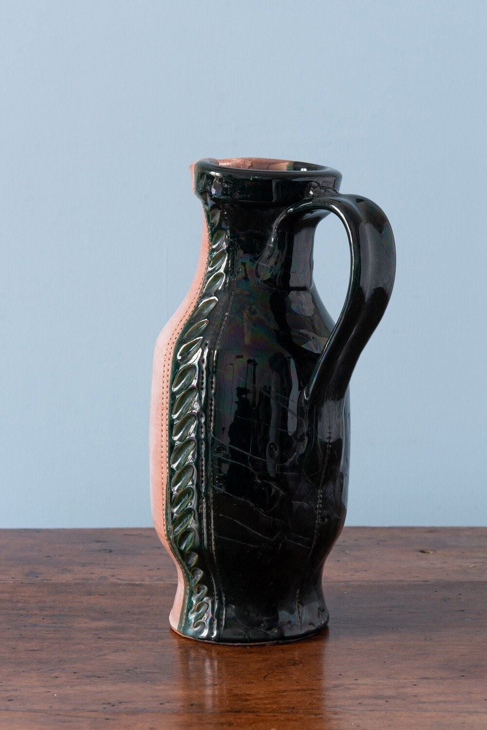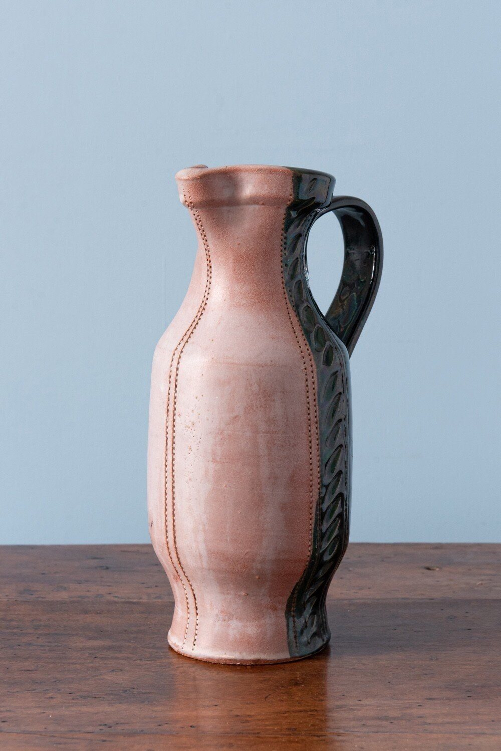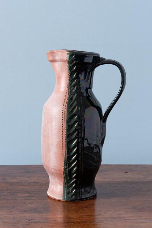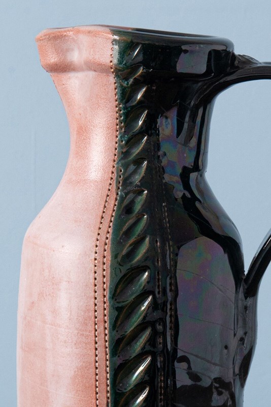 A distinctive midcentury jug from the Romacrea school in Rome, active in the 1950s–60s and renowned for its artistic forms and inventive glazing. This tall, slender piece combines a matt earthy pink surface to the front with a dark green iridescent glaze to the reverse and handle. A finely carved frieze of dots and leaf motifs runs vertically along the body, adding subtle ornament to its refined modern silhouette.