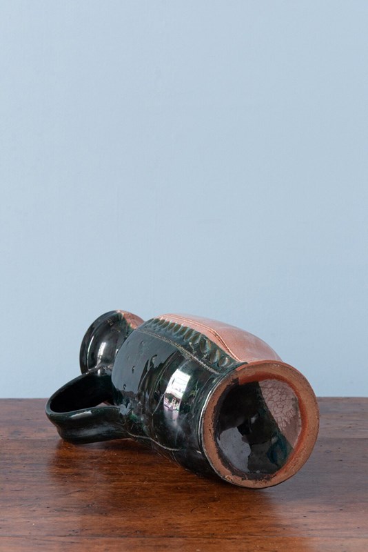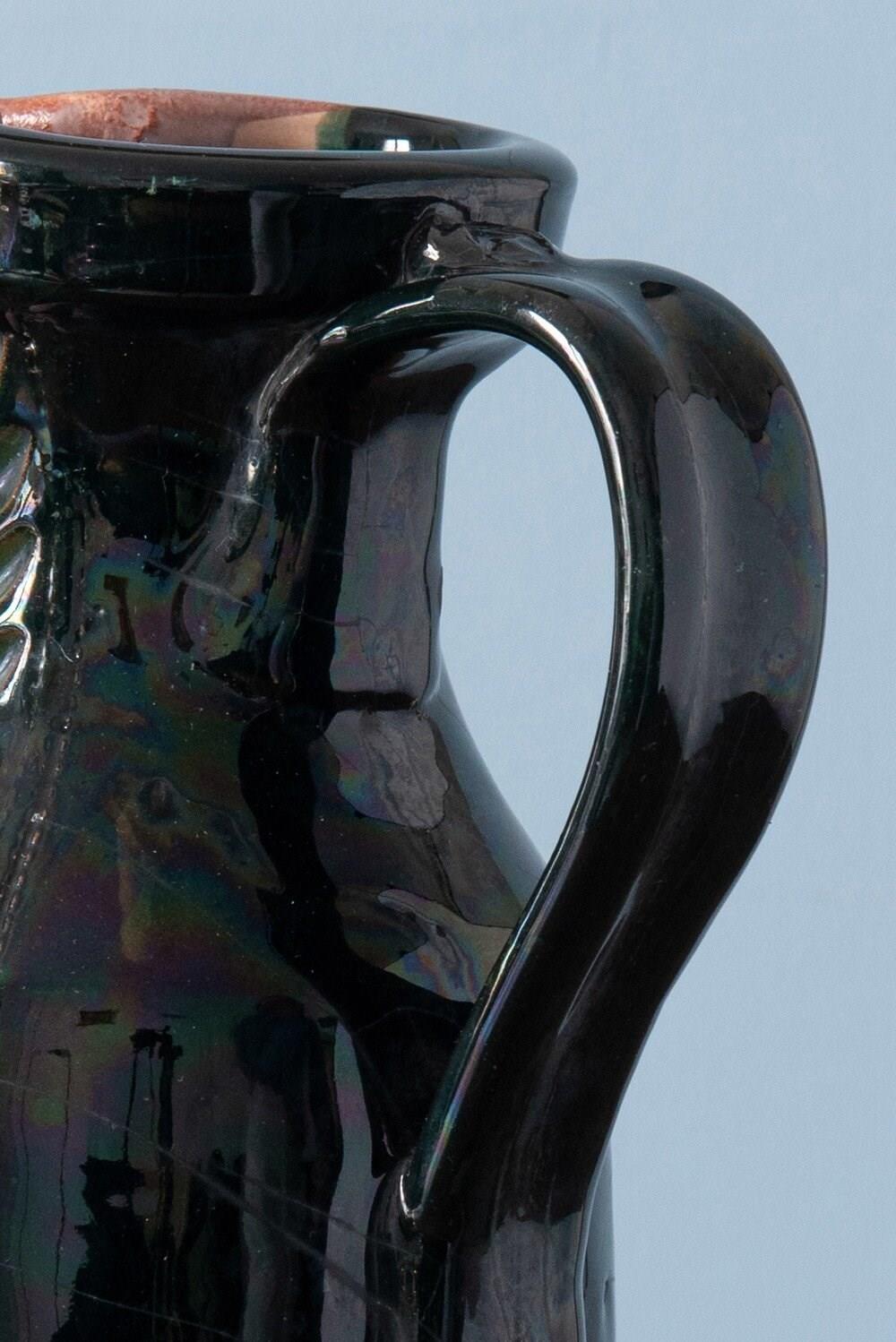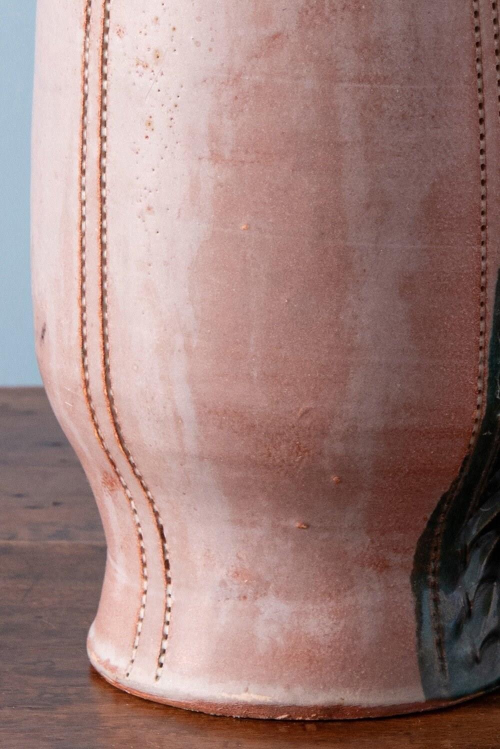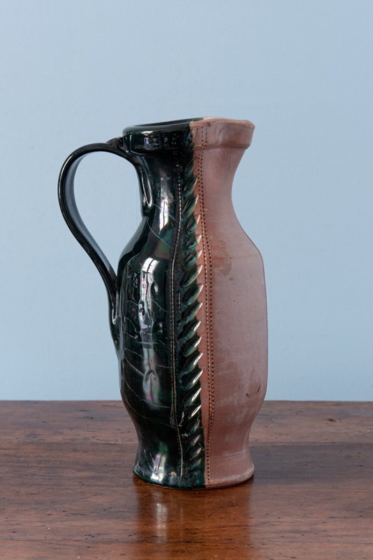 A distinctive midcentury jug from the Romacrea school in Rome, active in the 1950s–60s and renowned for its artistic forms and inventive glazing. This tall, slender piece combines a matt earthy pink surface to the front with a dark green iridescent glaze to the reverse and handle. A finely carved frieze of dots and leaf motifs runs vertically along the body, adding subtle ornament to its refined modern silhouette.