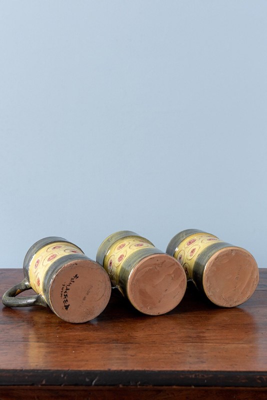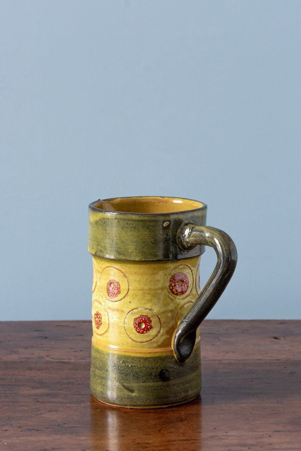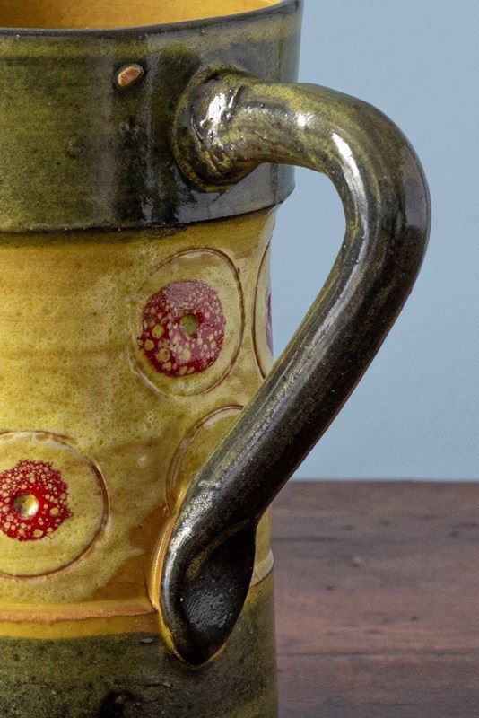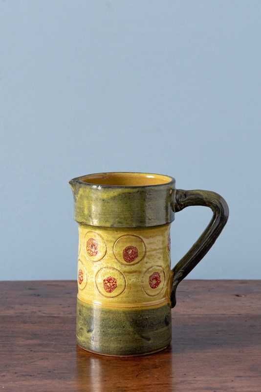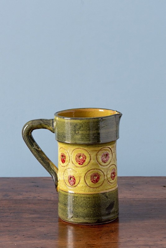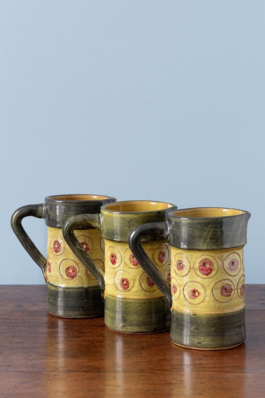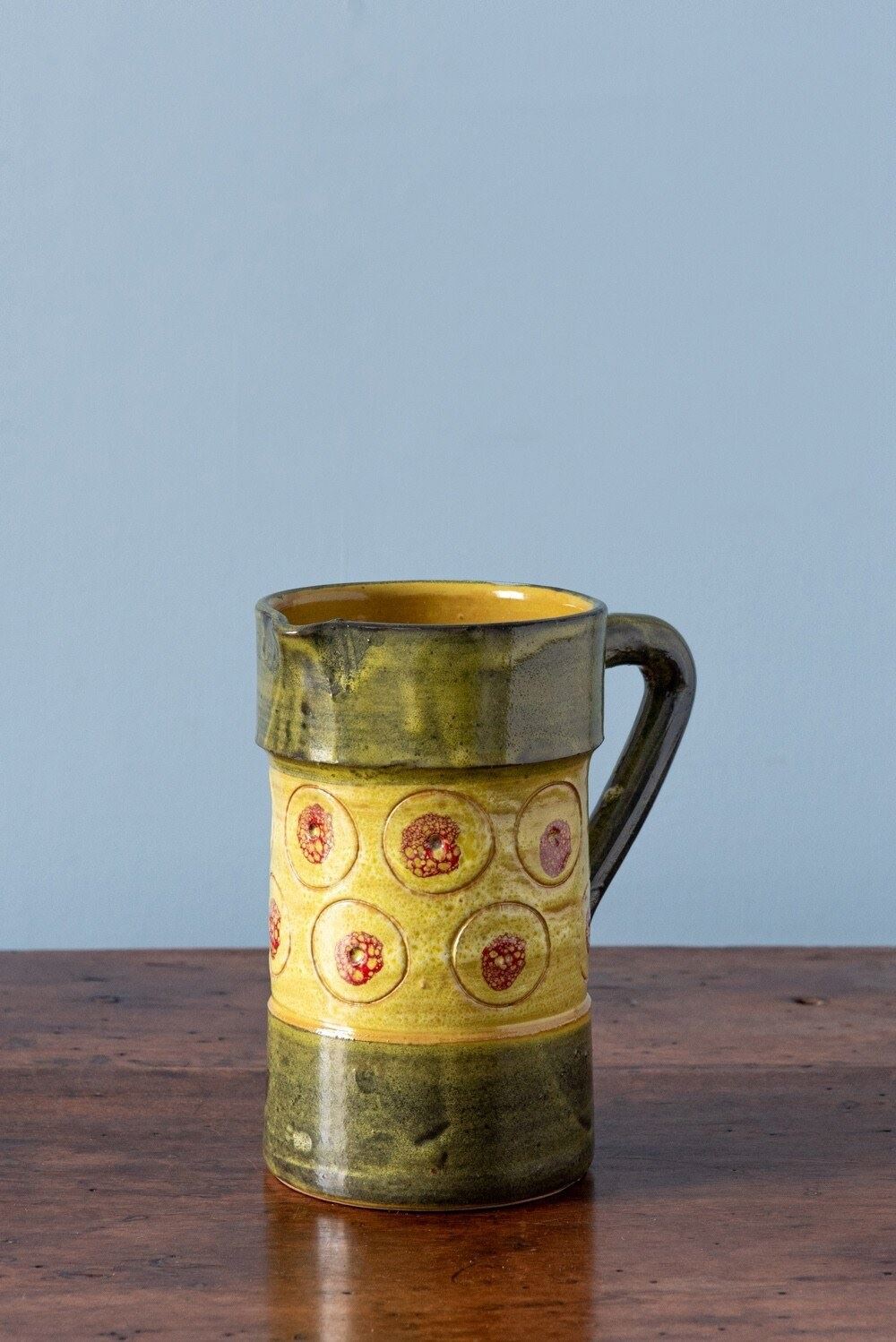 A vibrant trio of mid-century jugs from the Romacrea school in Rome, active in the 1950s–60s and renowned for its creative shapes and decorative invention. Each piece features a lively design of green and yellow bands with red circular motifs, the colours enhanced by a textured glaze. Their slender, medium-sized forms are completed with sculptural green handles. A distinctive set of modern Italian jugs, rich in colour and texture.