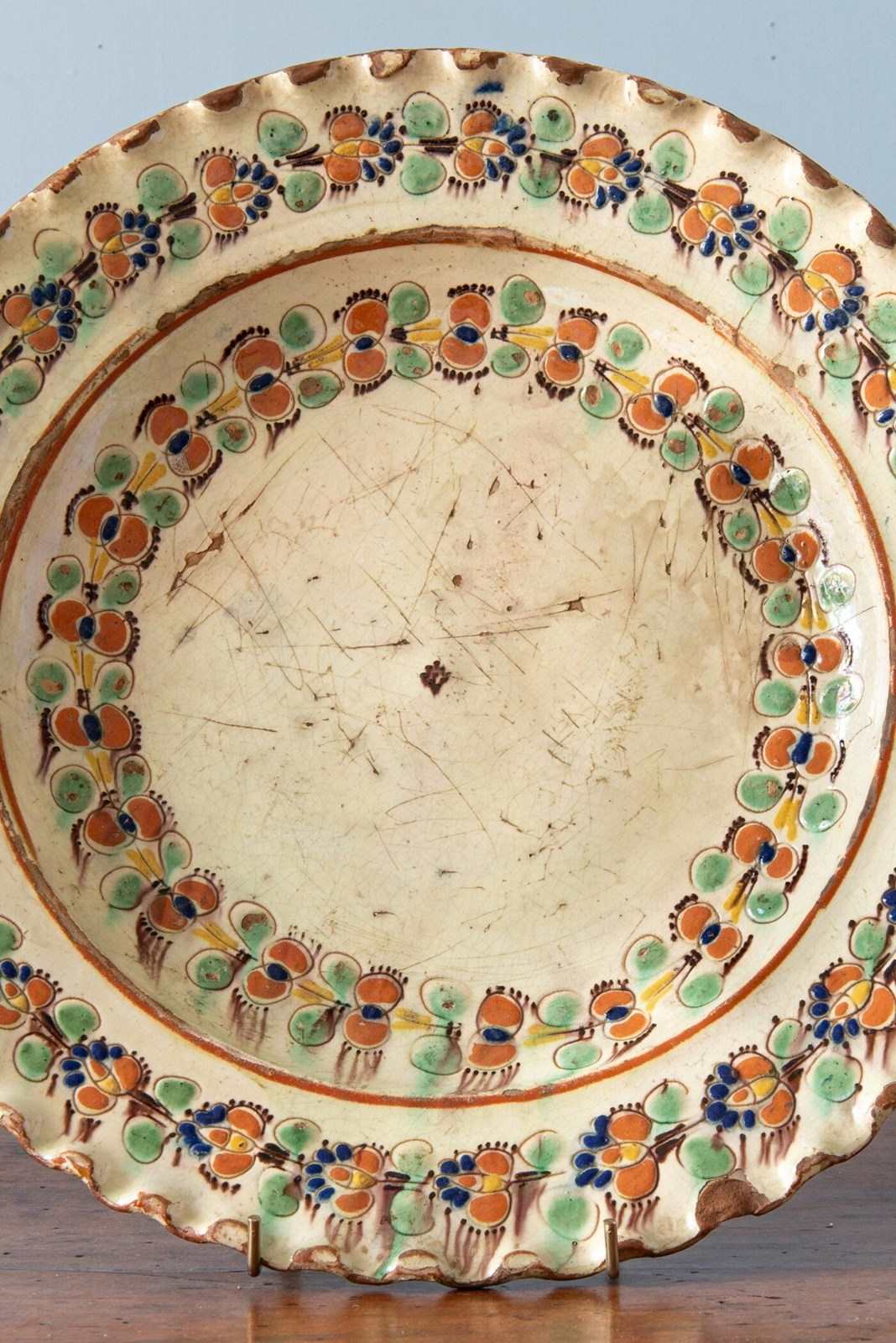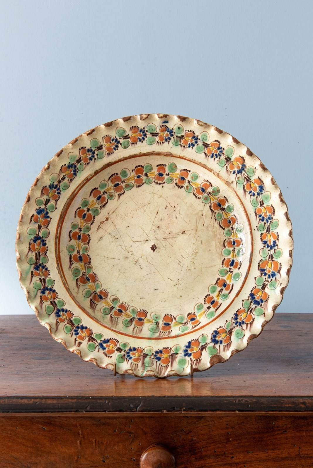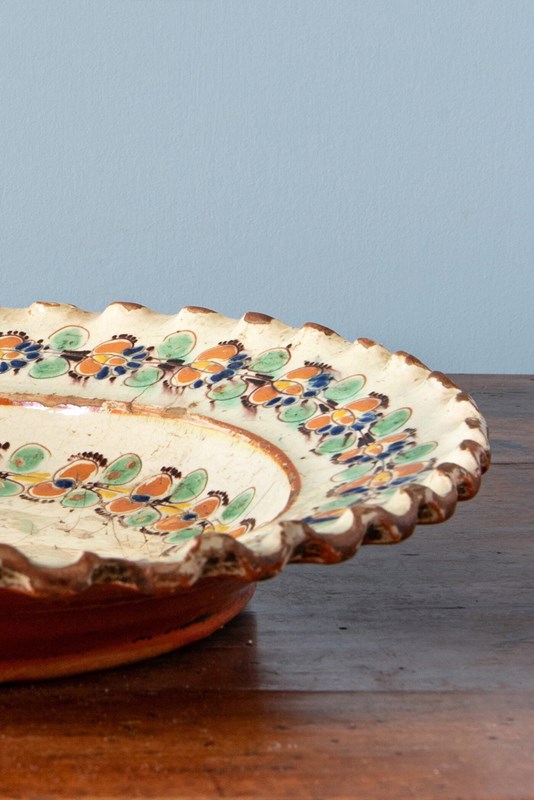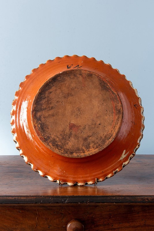 An 18th-century Swiss slipware dish from the canton of Bern, likely from Langnau, of shallow form with a flat lip and bold scalloped edge. It is decorated with a characteristic off-white lead glaze, incised with garlands of flowers across the basin and lip, in a vibrant palette of red, green, blue, yellow and brown. The underside is finished in a terracotta glaze.