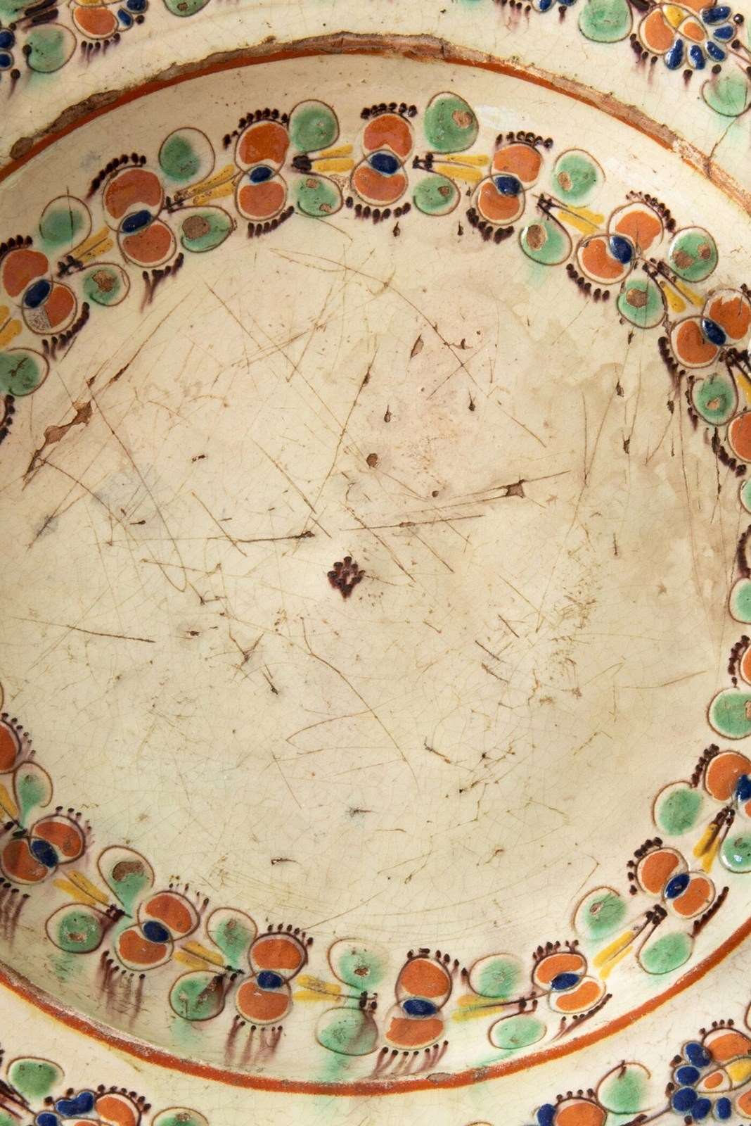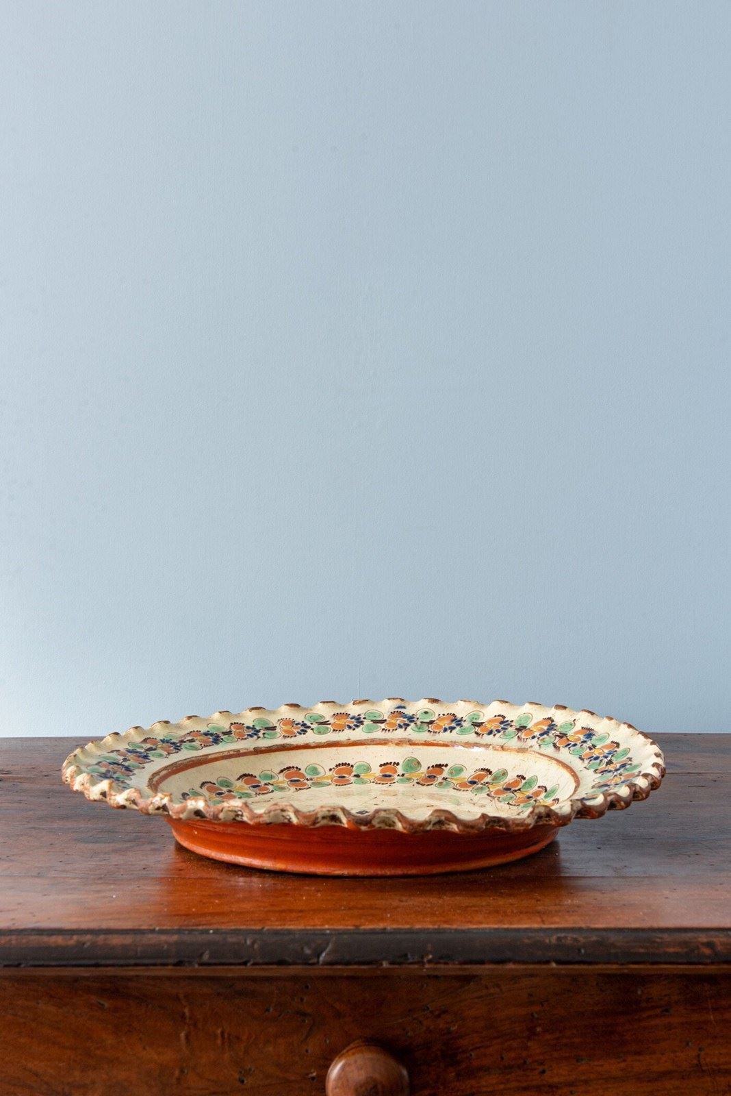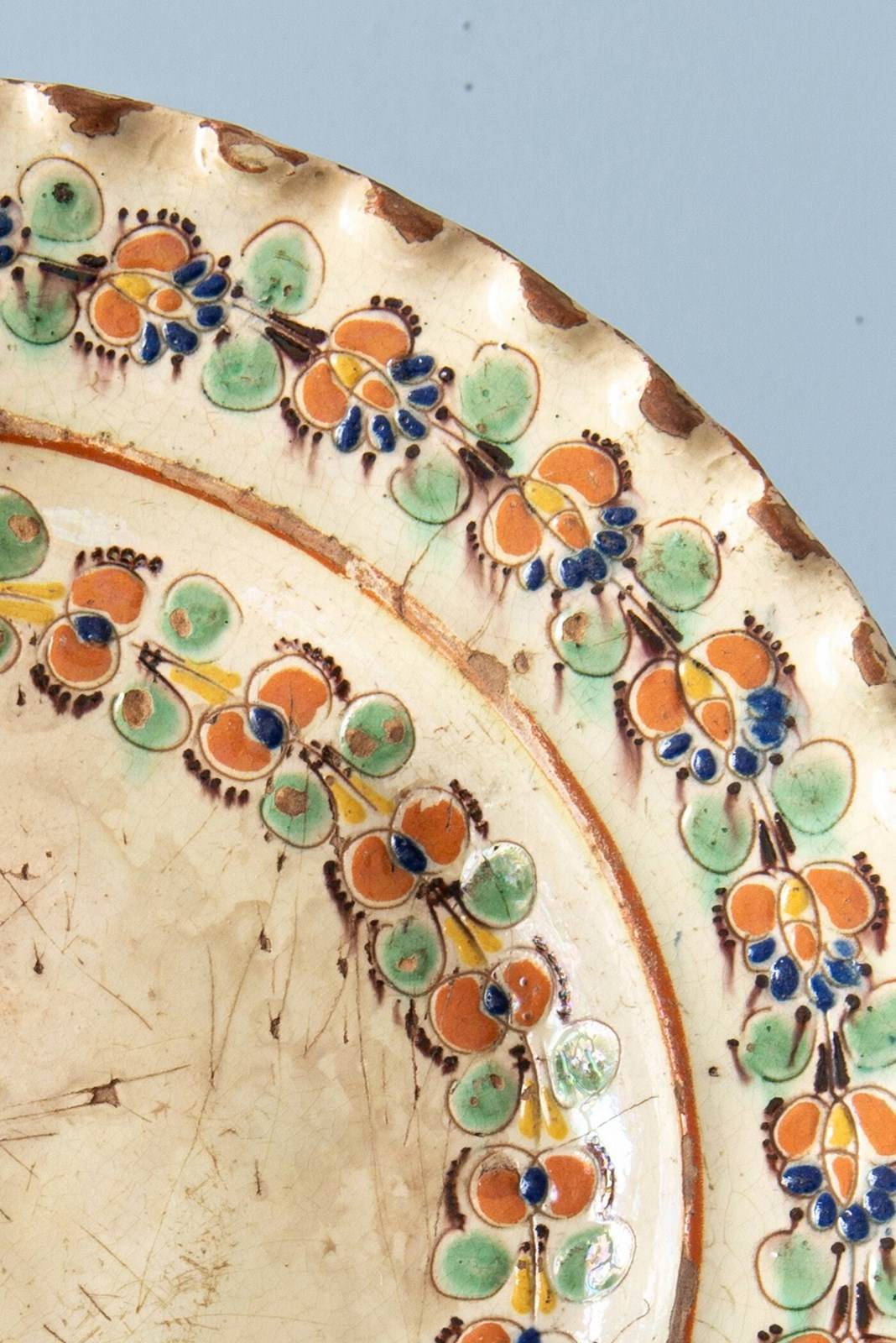 An 18th-century Swiss slipware dish from the canton of Bern, likely from Langnau, of shallow form with a flat lip and bold scalloped edge. It is decorated with a characteristic off-white lead glaze, incised with garlands of flowers across the basin and lip, in a vibrant palette of red, green, blue, yellow and brown. The underside is finished in a terracotta glaze.