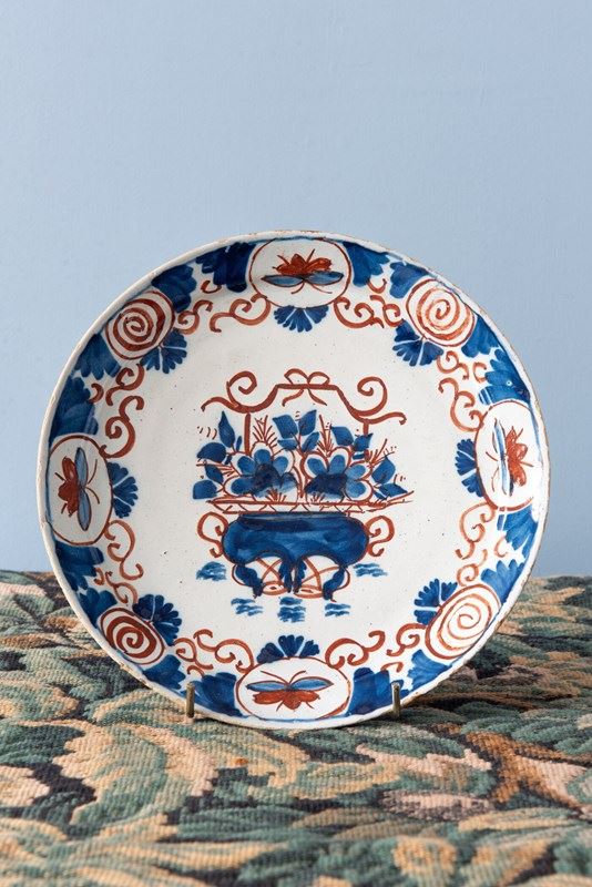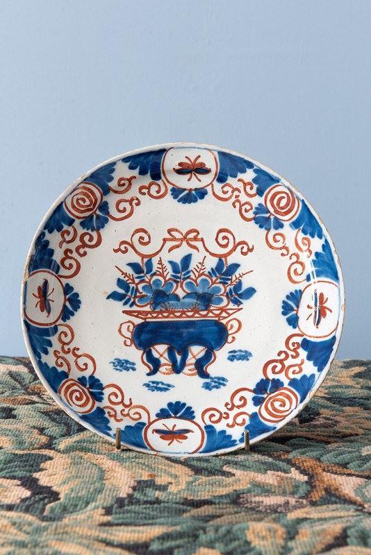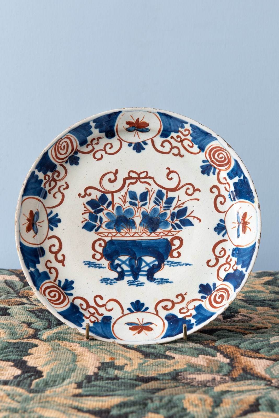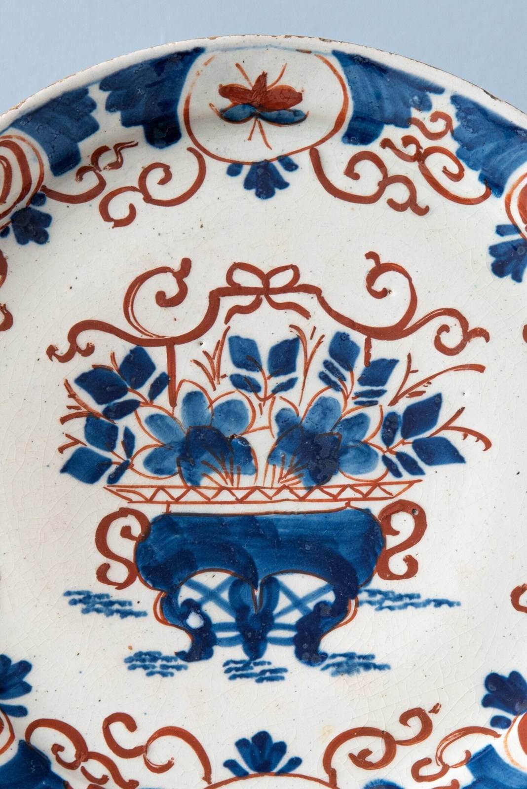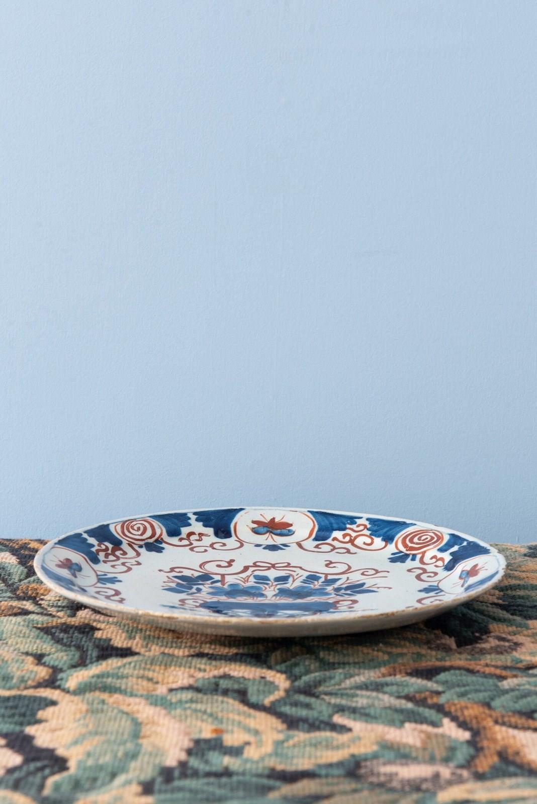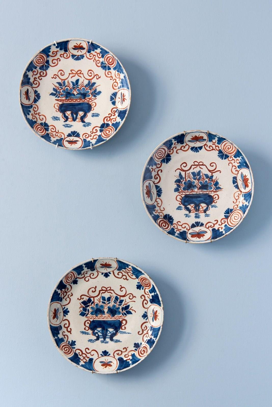 A rare trio of 18th-century Dutch Delft plates, decorated in a bold red and blue palette. Each plate is centred with an ornate vase filled with flowers, surrounded by scrolling foliage rendered in broad, painterly strokes that alternate with fine lines, creating a lively rhythm. The lip is decorated with a frieze of spirals and butterflies, framed by fan and scrolling patterns. A vibrant trio of Delft plates with rich patterns.