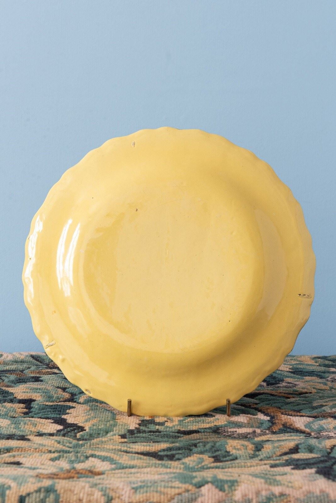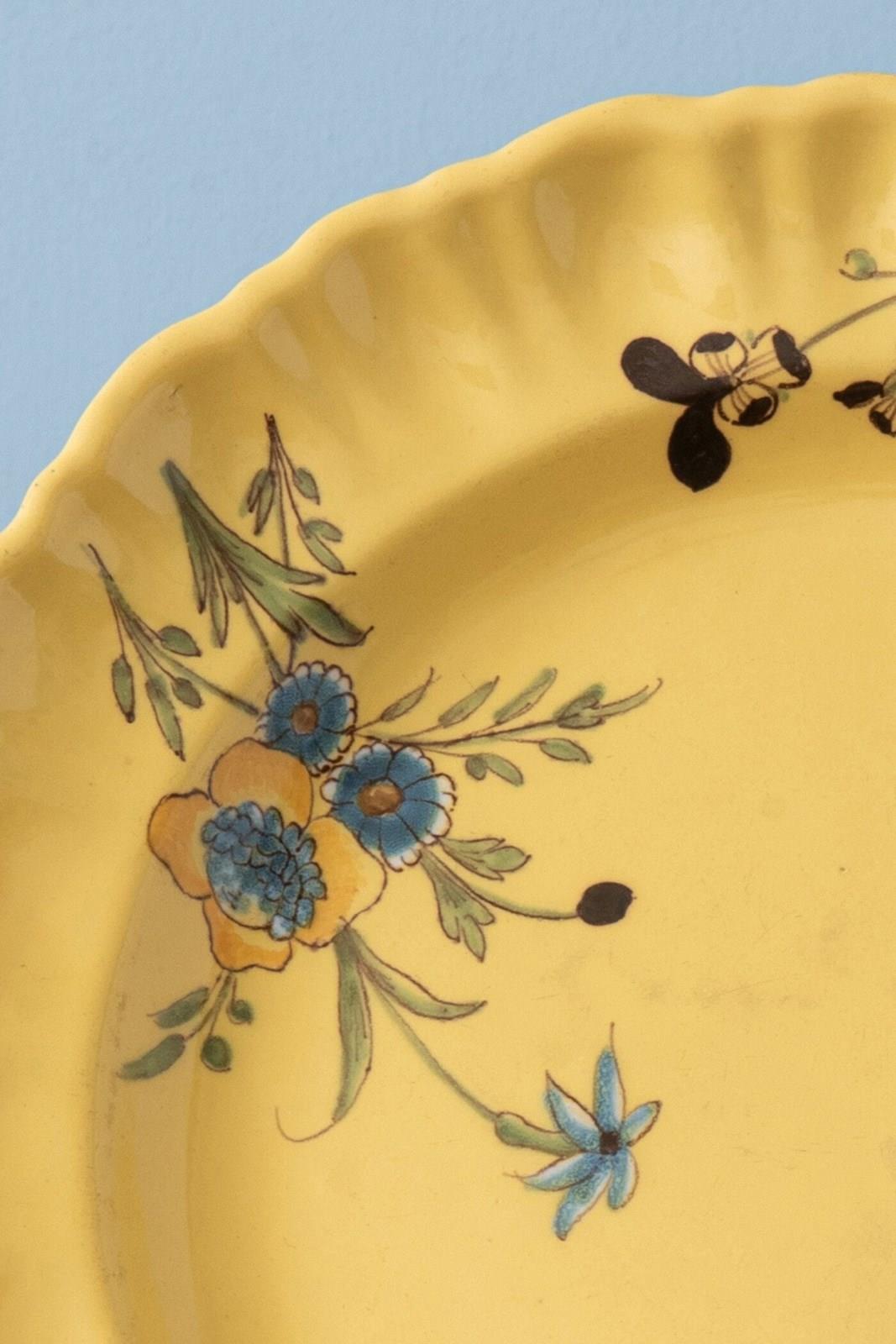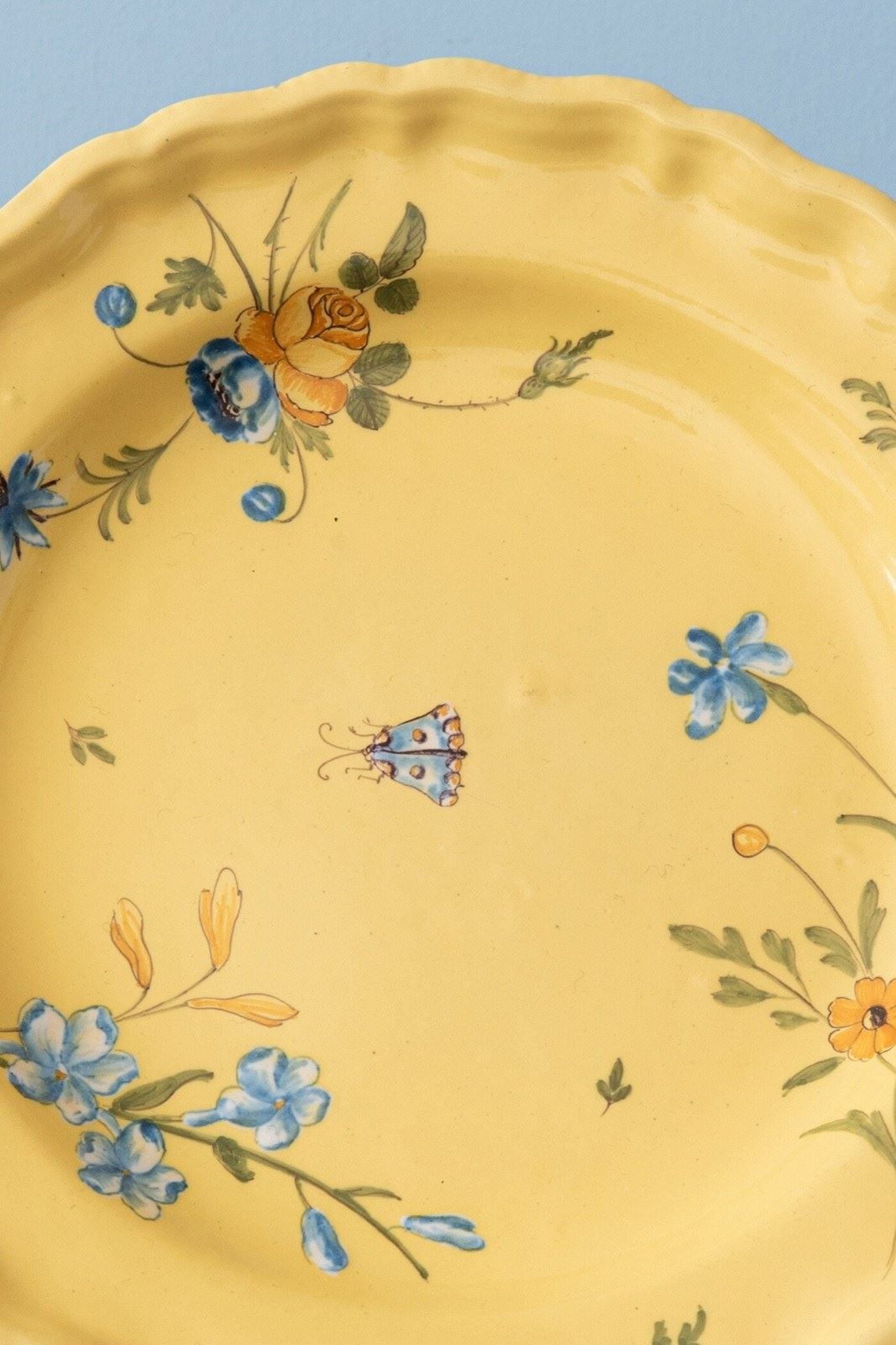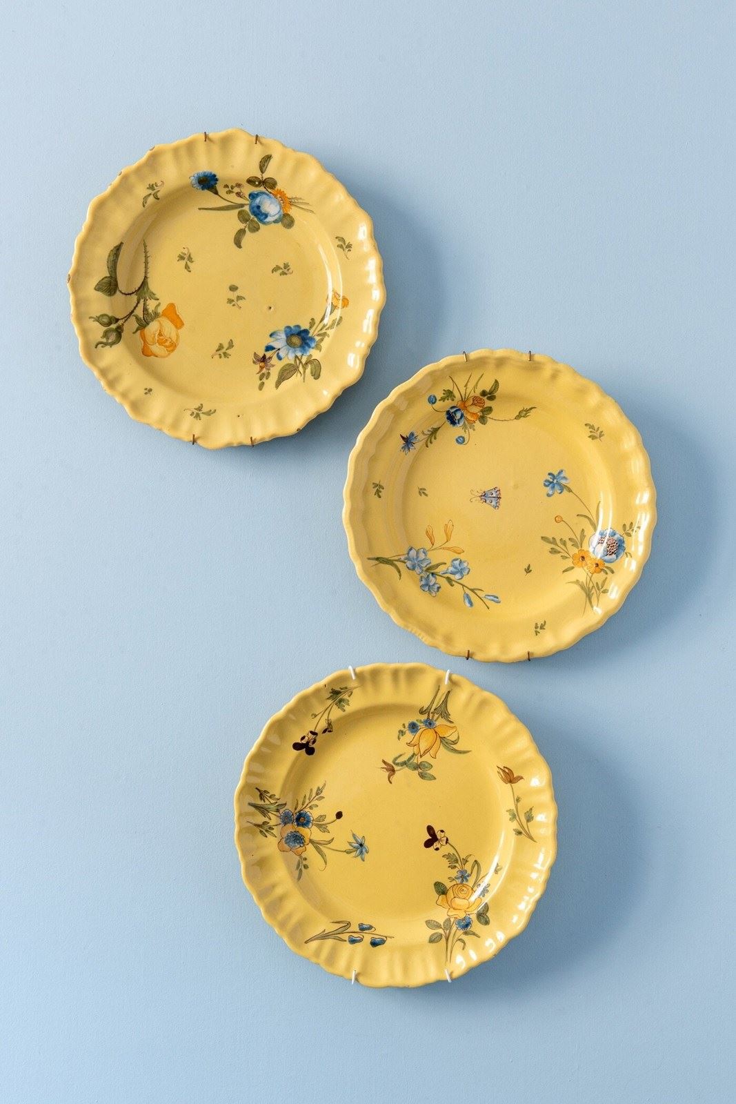 A trio of French faience plates from Marseille, produced by the Manufacture Fauchier, c. 1760. Each plate is decorated on a bright, warm yellow ground, with a delicately shaped edge and fluted lip.