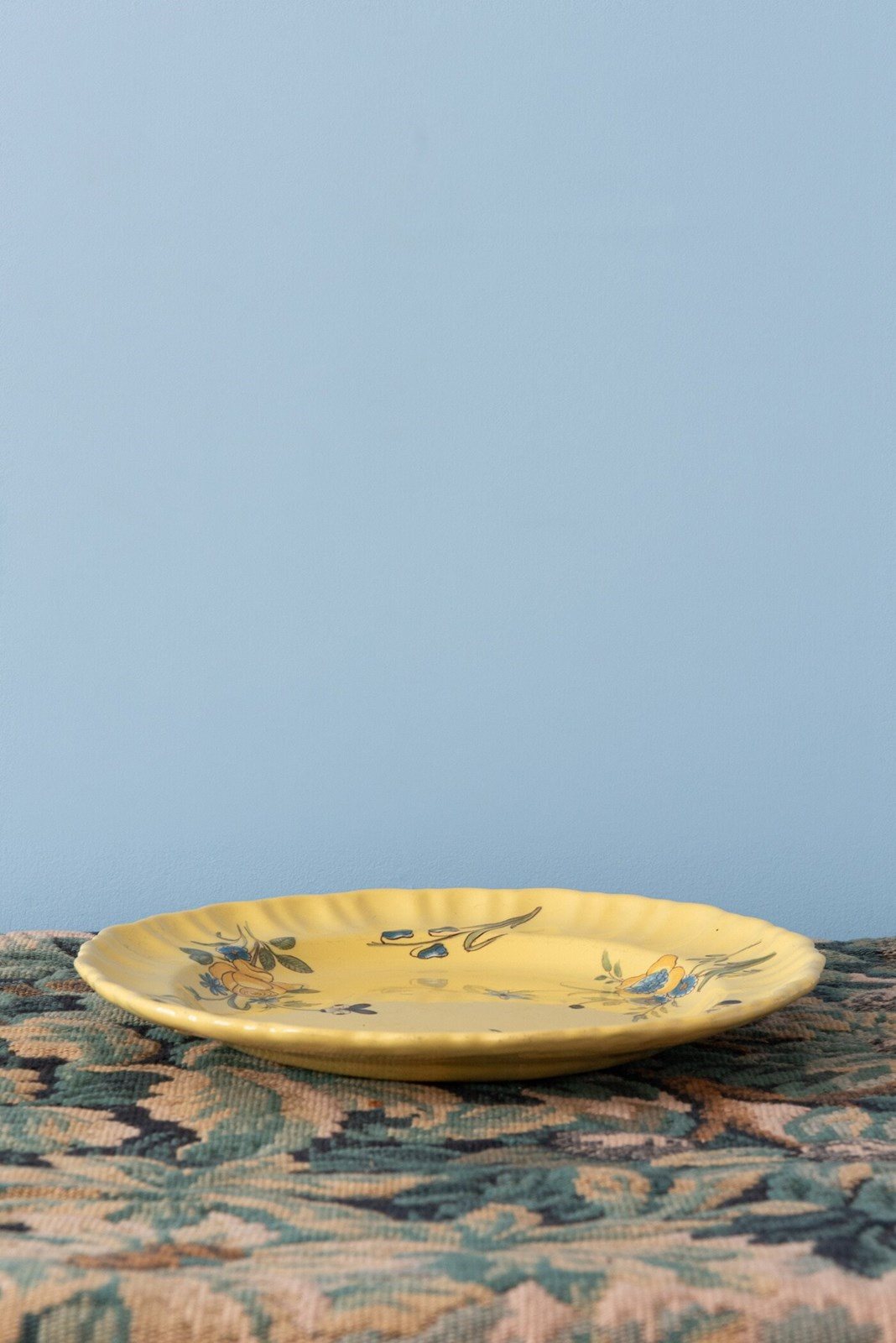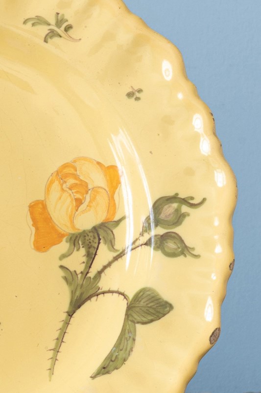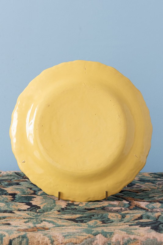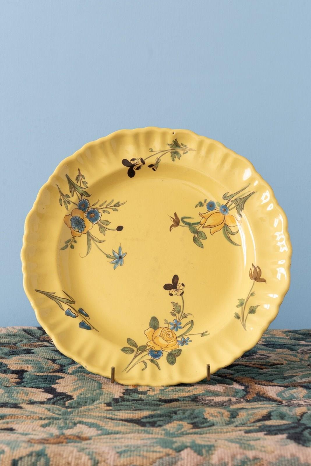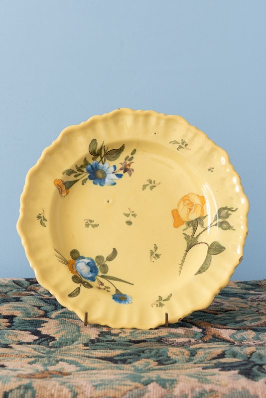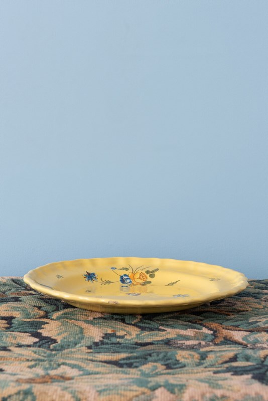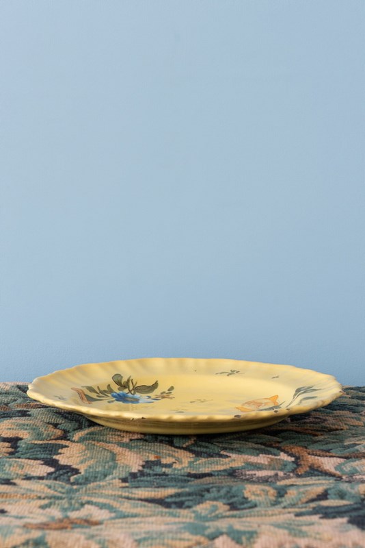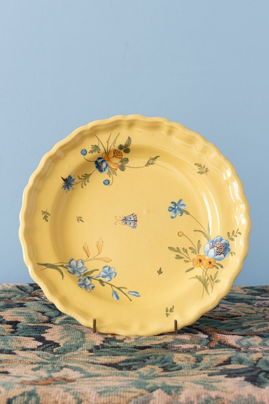 A trio of French faience plates from Marseille, produced by the Manufacture Fauchier, c. 1760. Each plate is decorated on a bright, warm yellow ground, with a delicately shaped edge and fluted lip.