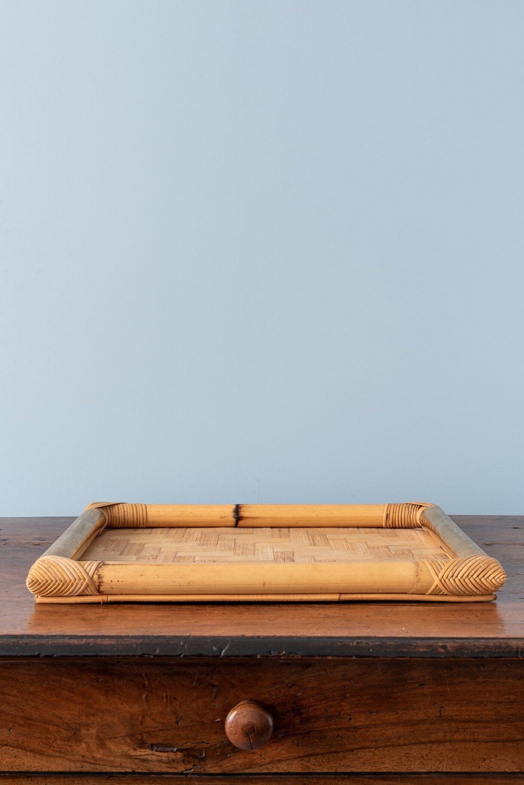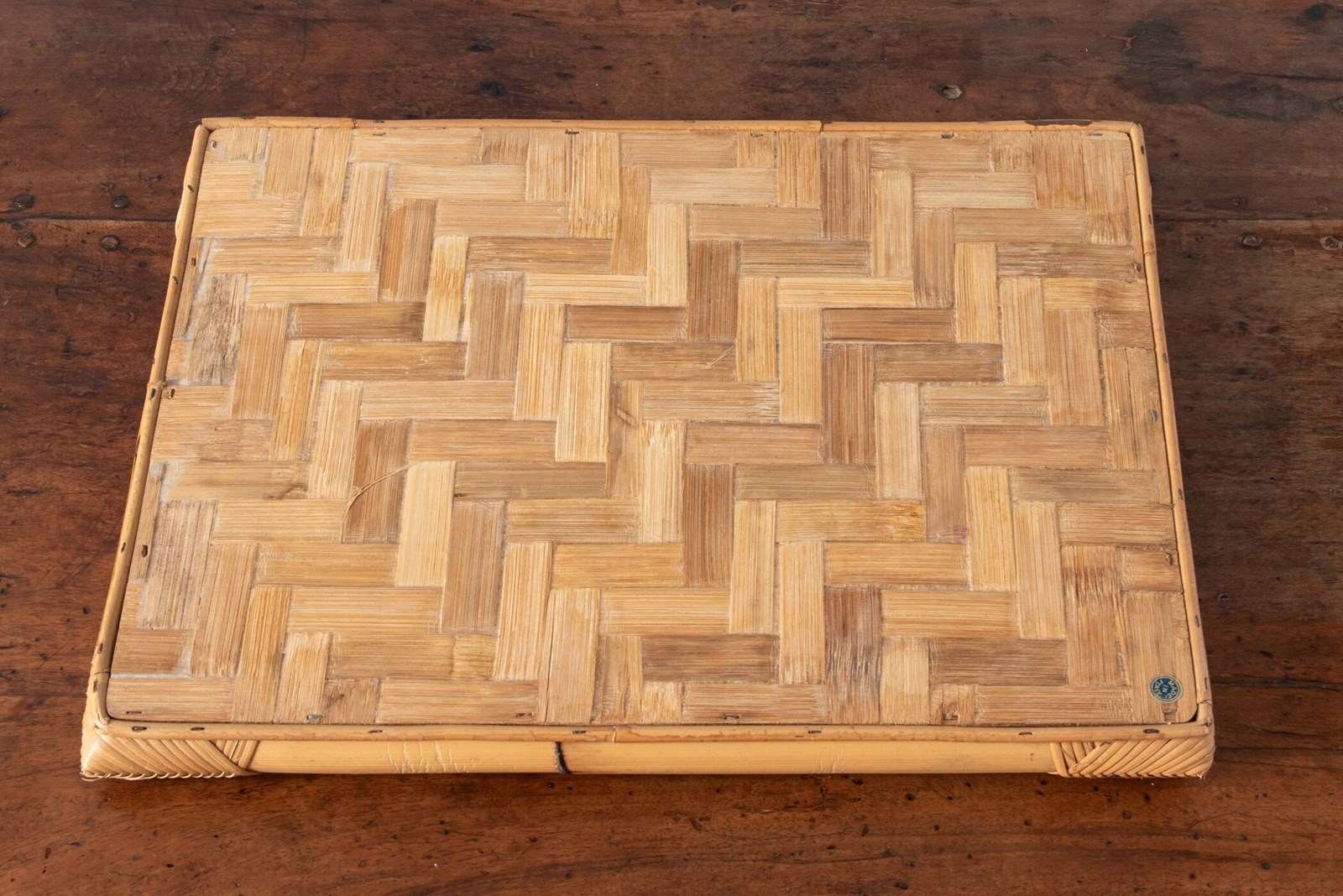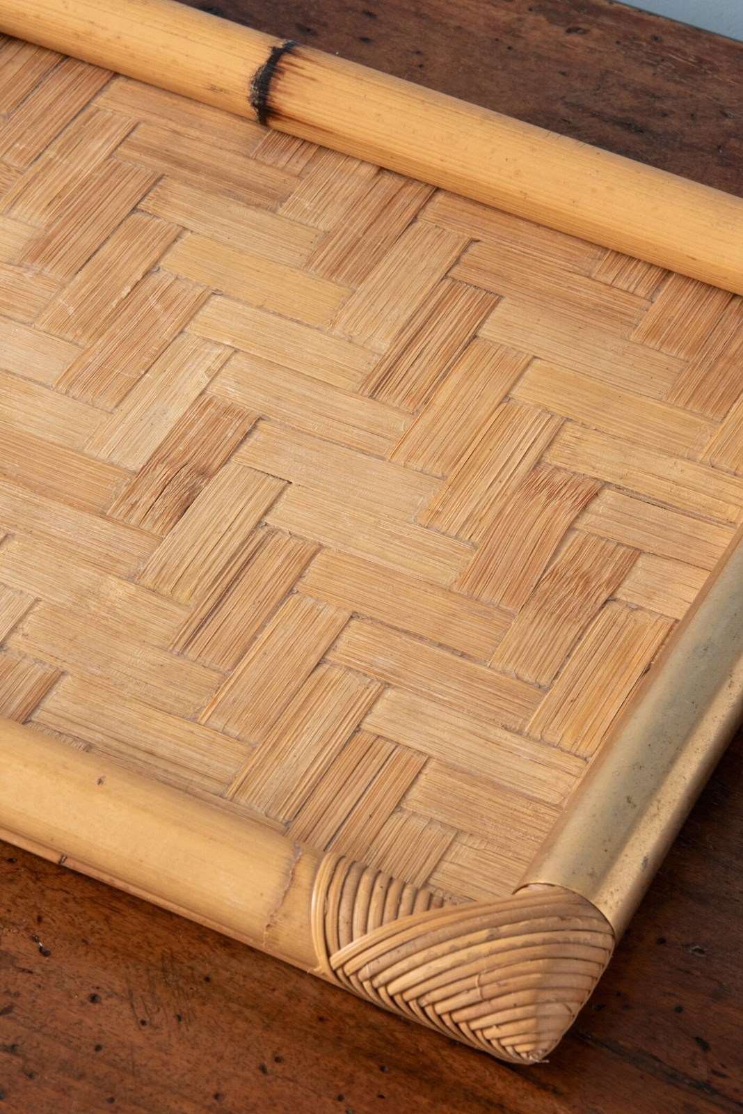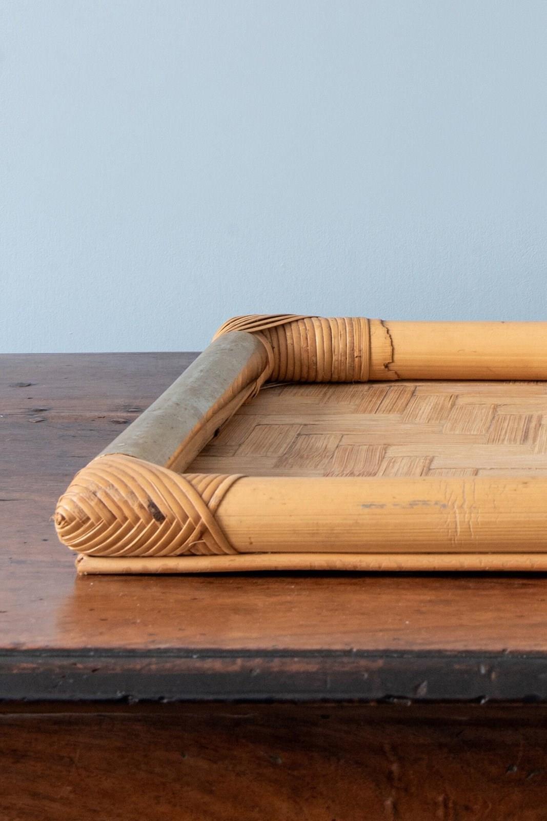 Attributed to Vivai del Sud, Italy, 1970s, this large tray features a woven bamboo surface arranged in a herringbone pattern, bordered by solid sections of bamboo trunk, with rattan-set corners and framed by two attractive brass handles.