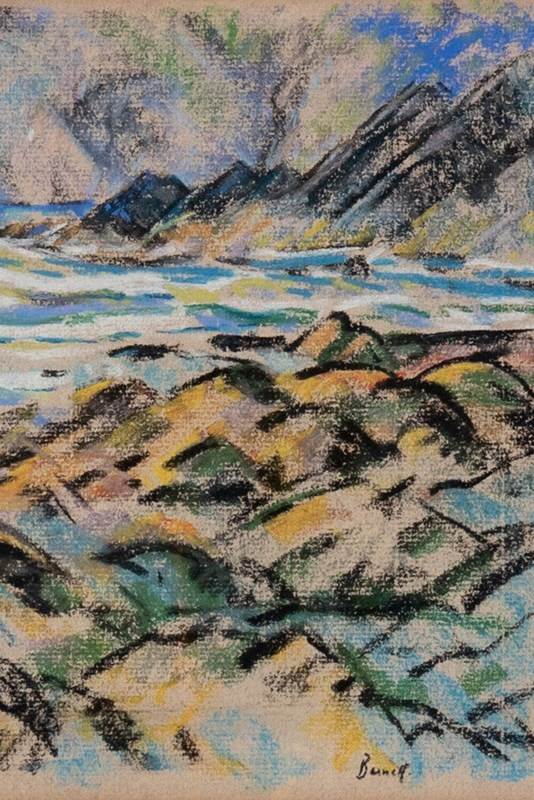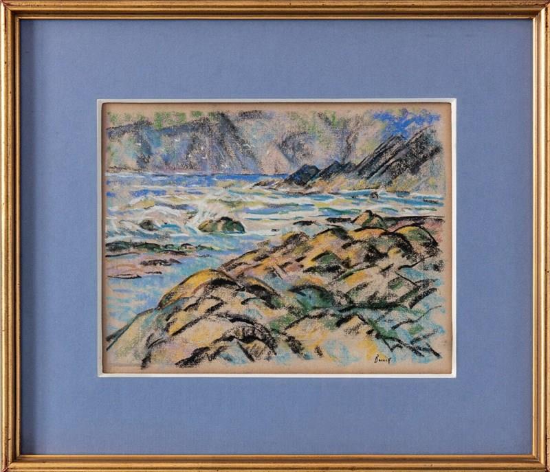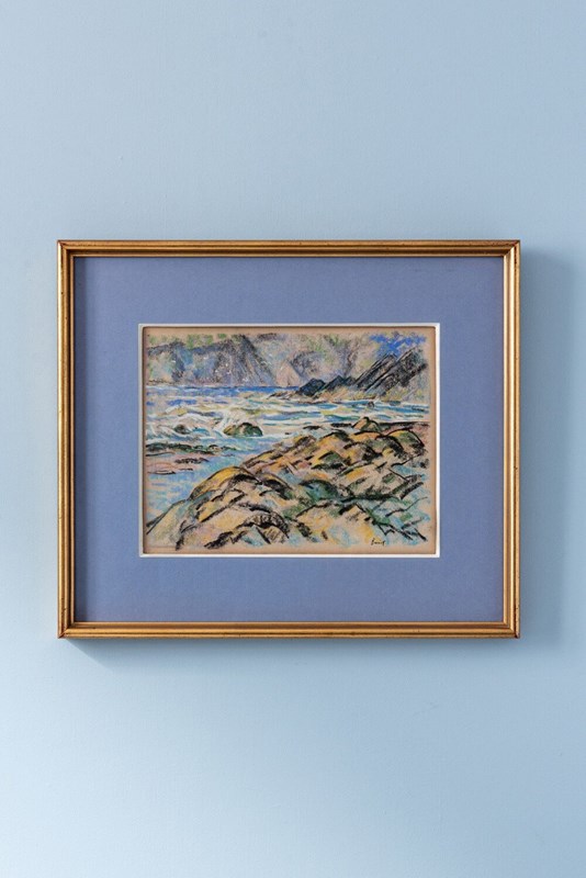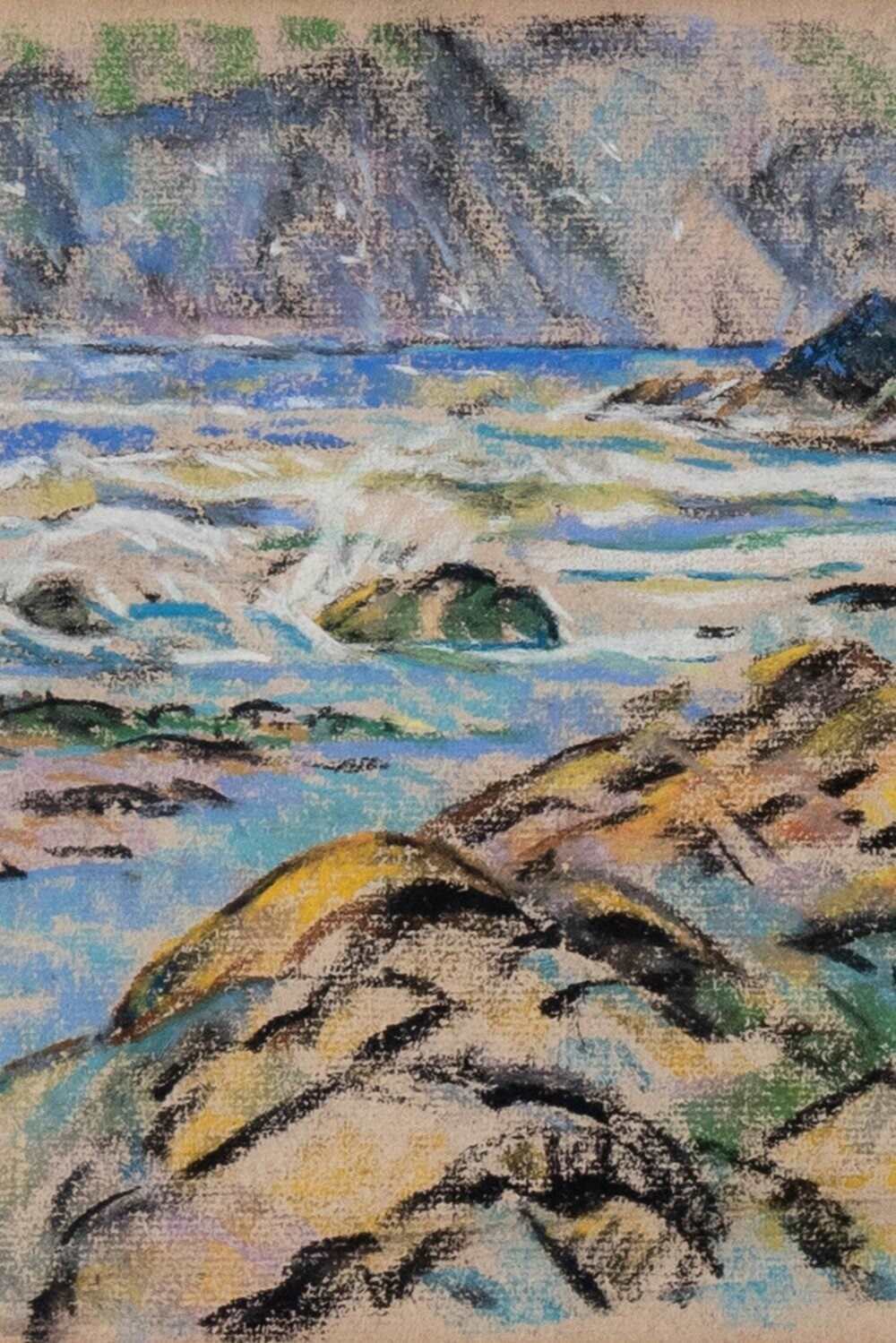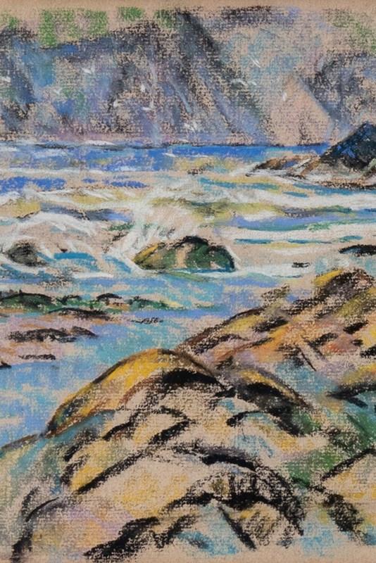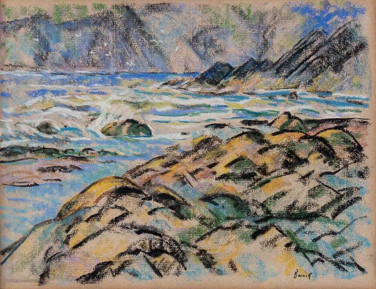This early 20th-century pastel on paper by British artist Walter Durac Barnett (1876–1961) depicts a coastal landscape with rocks in the foreground, the sea beyond, and cliffs in the distance. Executed on light brown paper, it captures the shifting light and textures of the shoreline through a vibrant palette of blues, greens, yellows, and blacks.