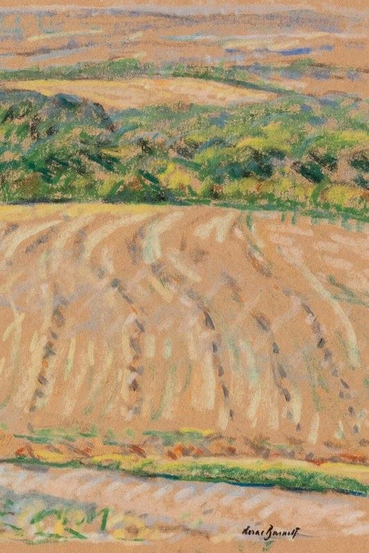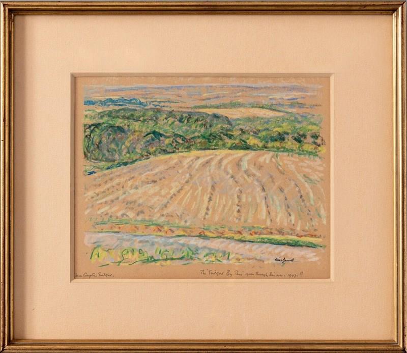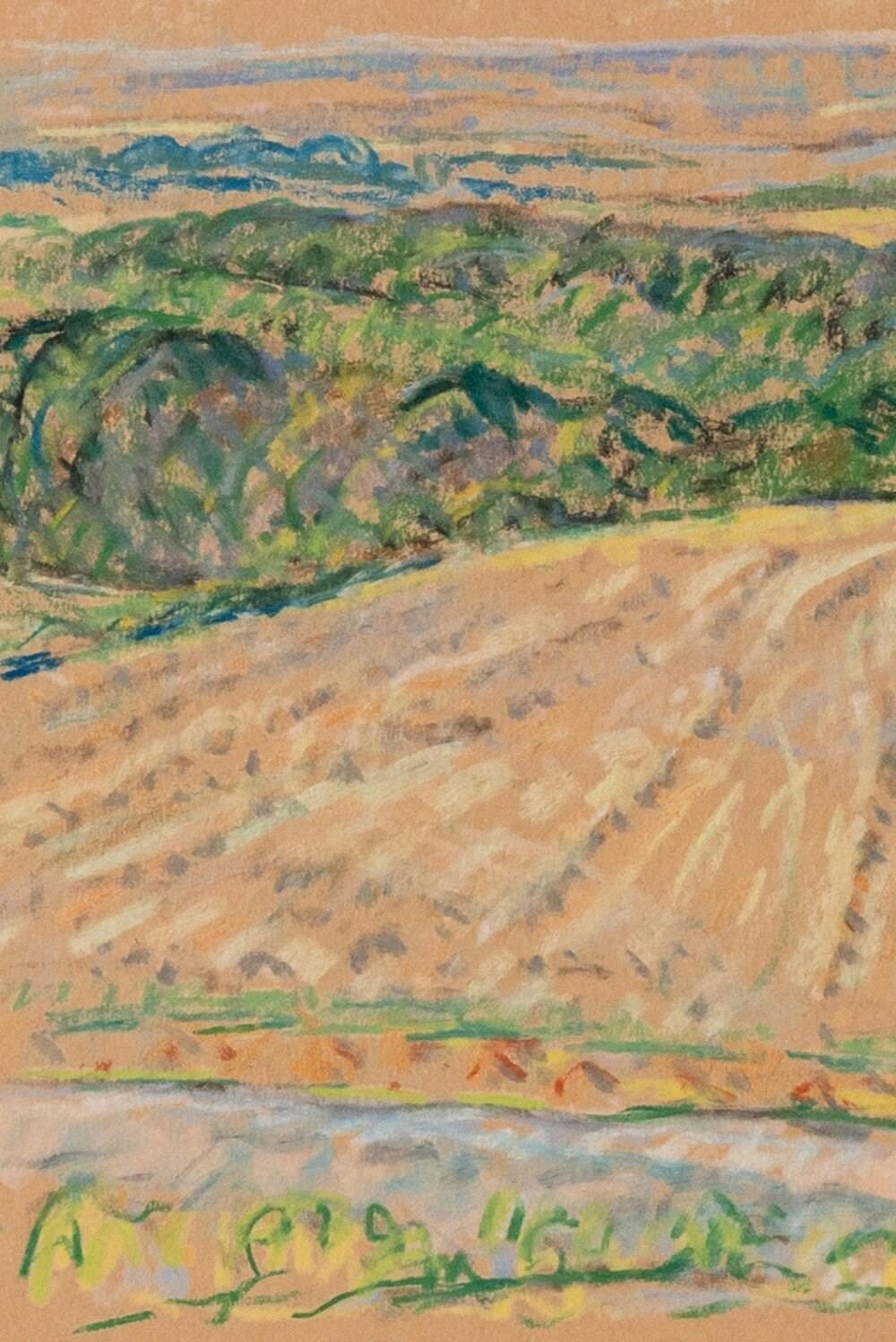 This early 20th-century pastel on paper by Walter Durac Barnett (1876–1961) depicts a rolling country landscape with a field in the foreground and woodland beyond. Executed on hay-coloured paper, it features a warm palette of greens, blues, and yellows that captures the atmosphere of a summer day. The varied shades of green convey the vibrancy of the foliage, while sinuous pastel strokes emphasise the outline of the hills and the gentle movement of the trees.