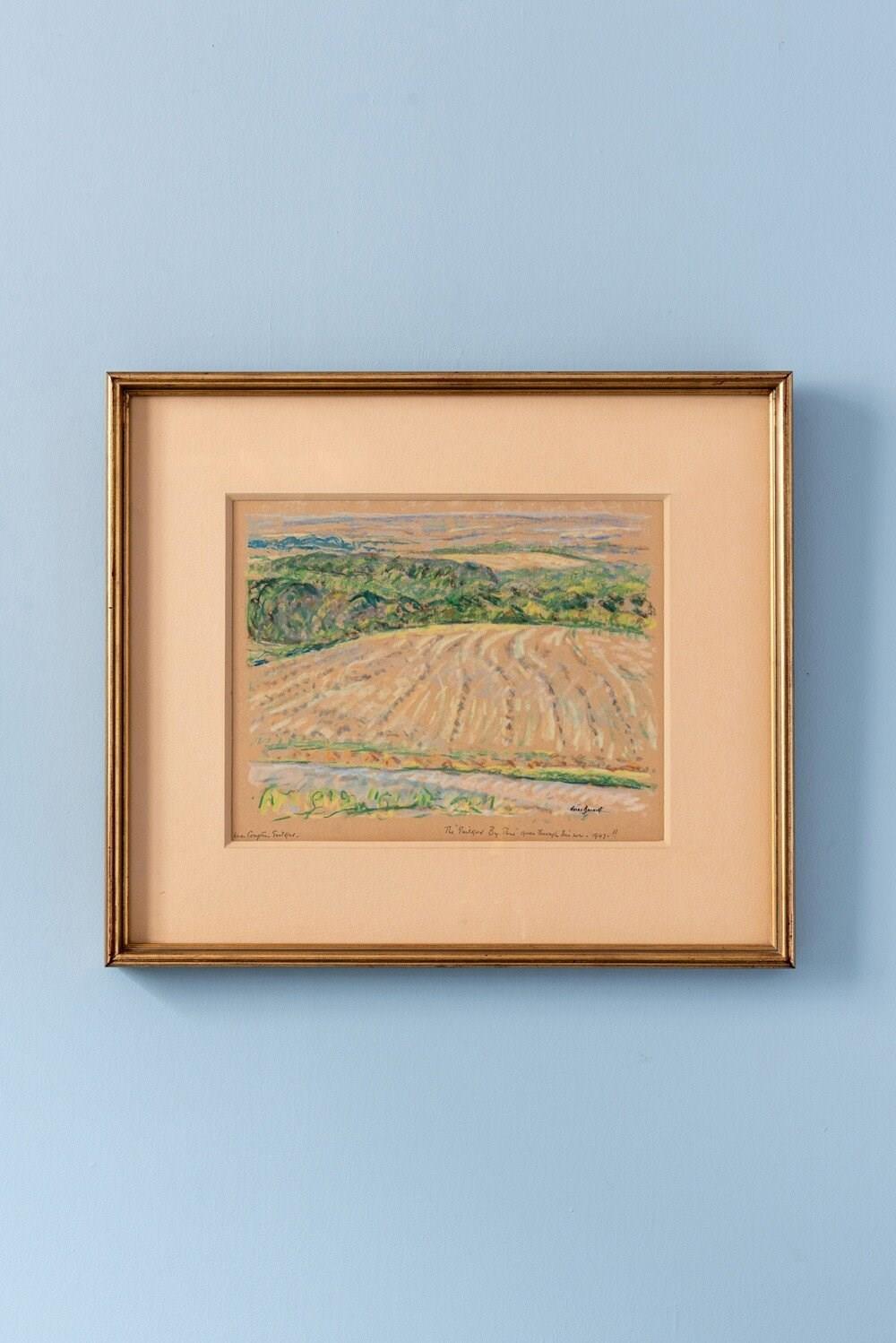 With a distinctive composition, the open field draws the eye toward the woods and distant hills, creating a sense of depth and calm. Located lower left, signed lower right, and presented glazed under a cream mount within a gilded wood frame. A serene and uplifting pastoral study with bright colour.
