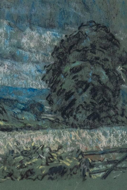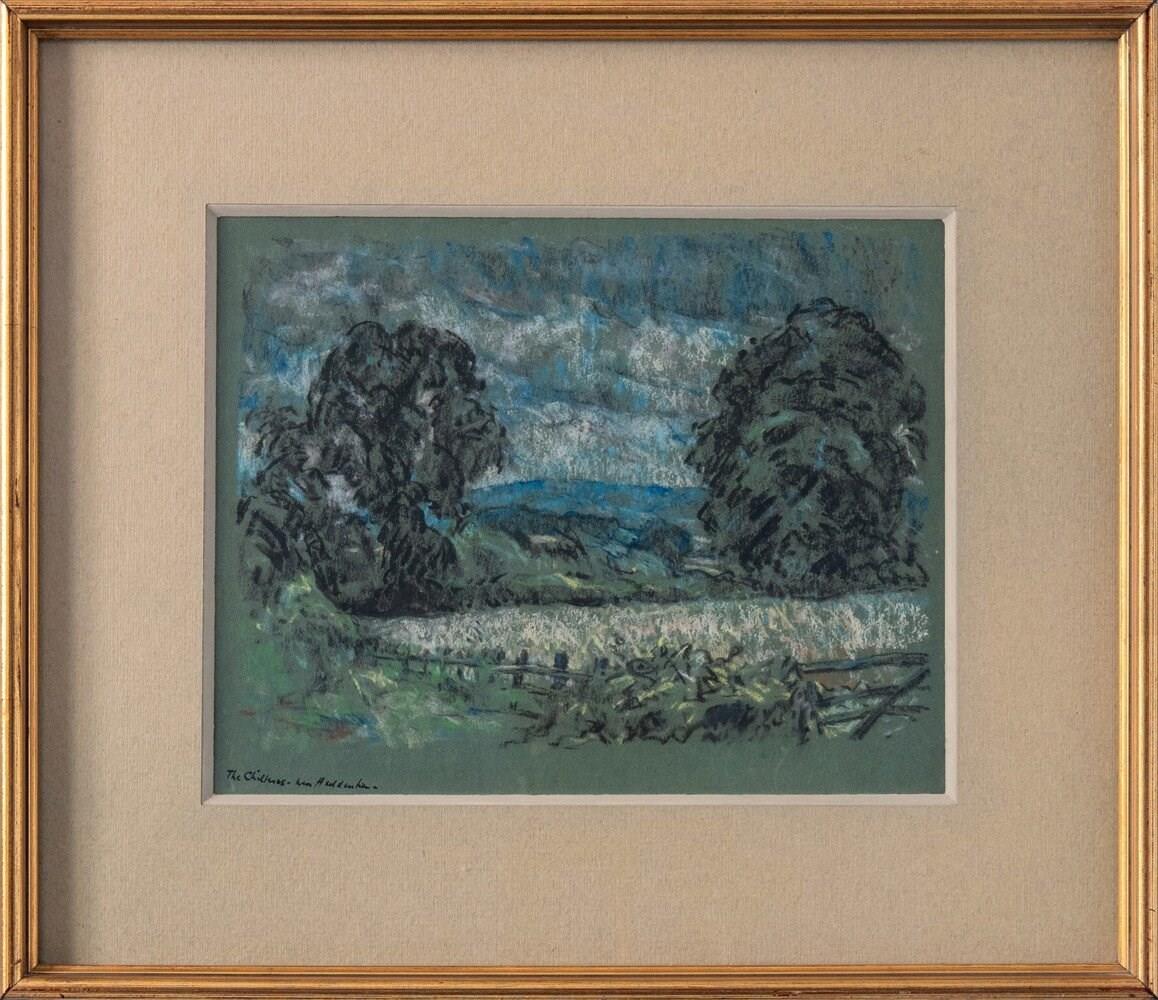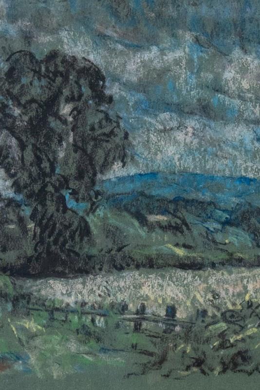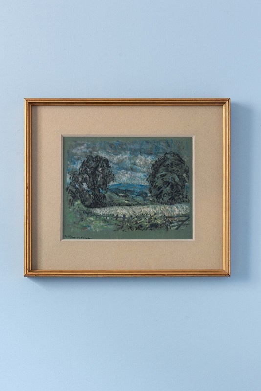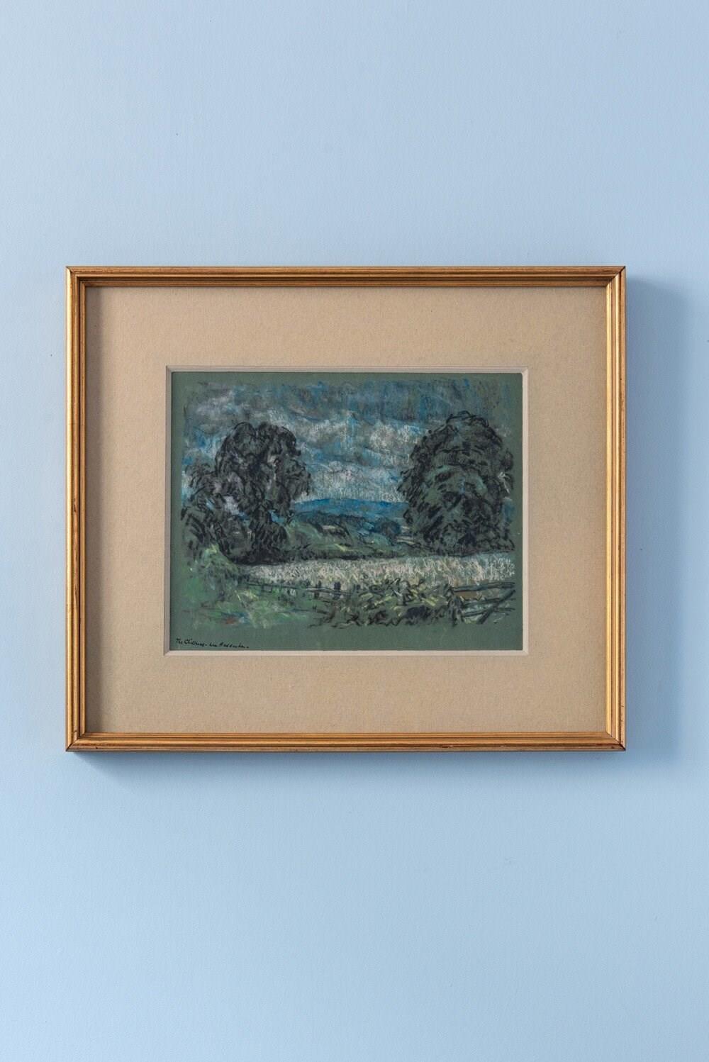 This early 20th-century pastel on paper by Walter Durac Barnett (1876–1961) depicts a tranquil country landscape, with a field bordered by wooden fences in the foreground, framed by tall trees and rolling hills in the distance. Executed on green paper, it features a distinctive palette of greens, whites, and blues — the pale tones of the field echoing the clouds above, while the blue hills dissolve into the sky.