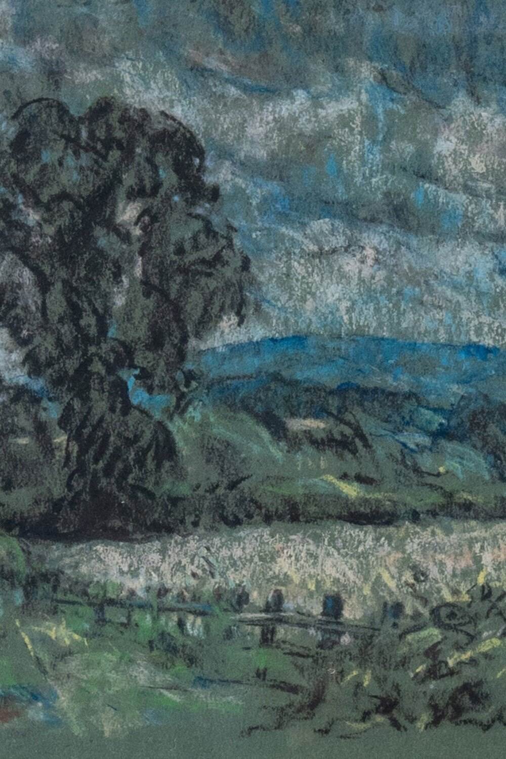 Expressive pastel strokes lend movement to the trees and structure to the composition, creating a serene atmosphere evocative of a cool evening. Located lower left, and presented glazed under a green mount within a gilded wood frame. An evocative country scene in fresh, harmonious colours.