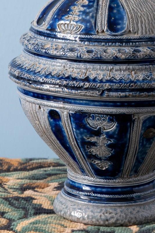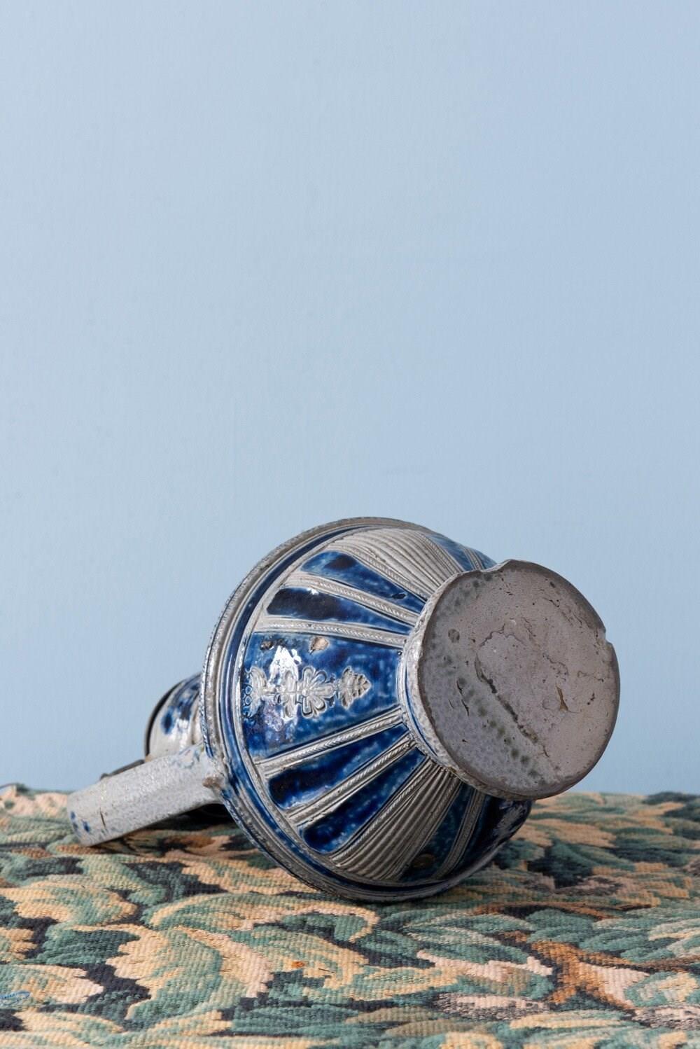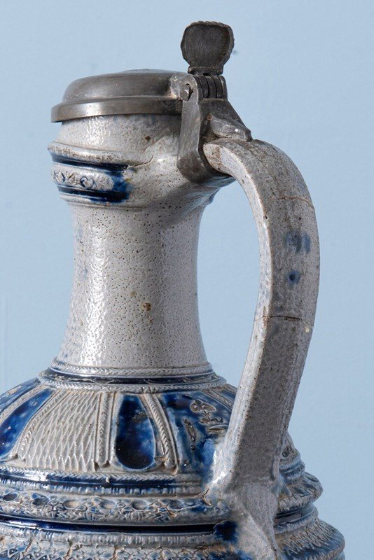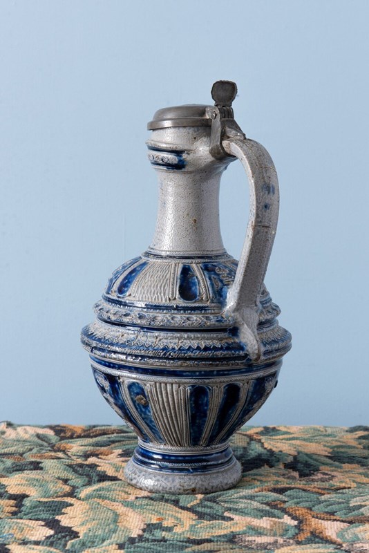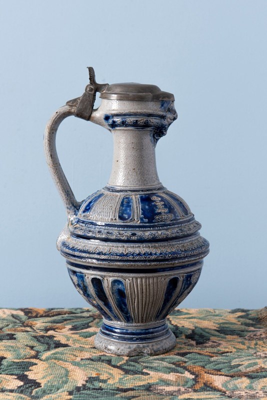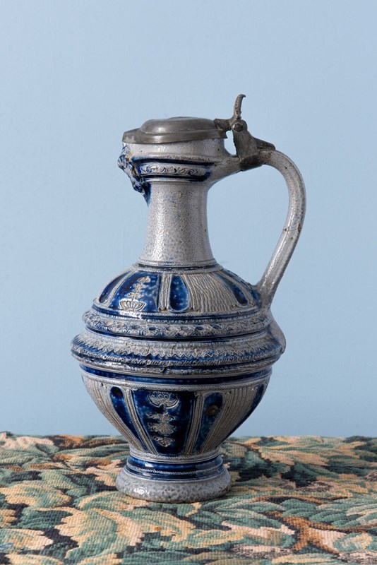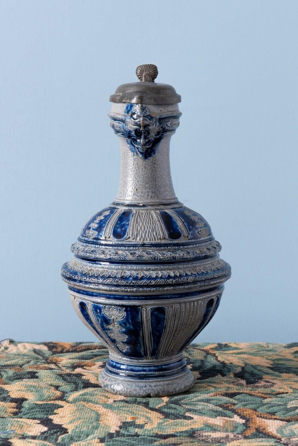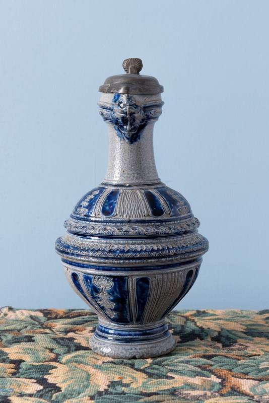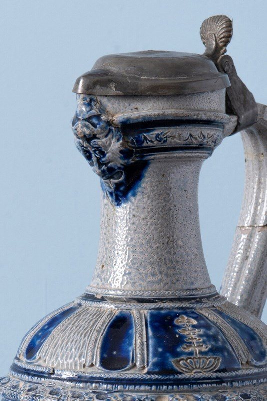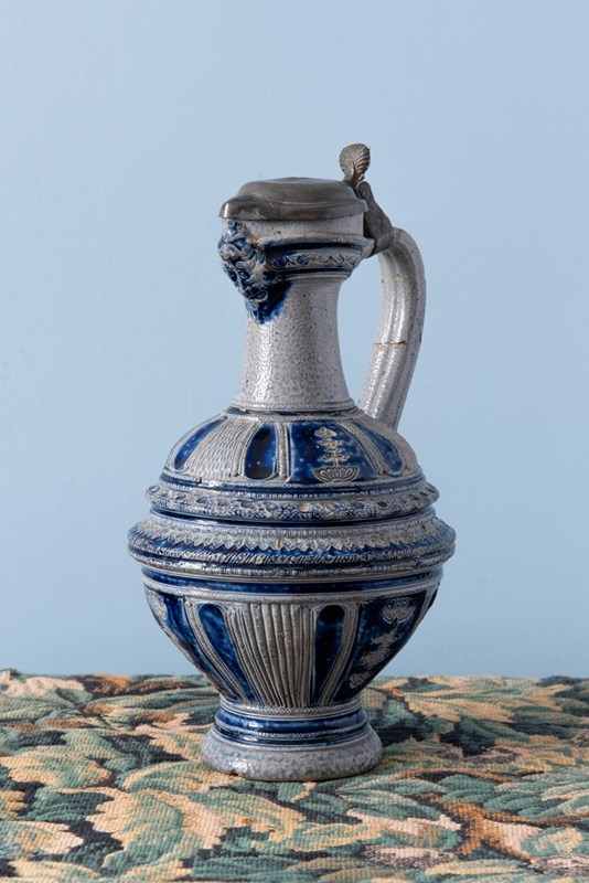 This 19th-century Westerwald jug is glazed in glossy cobalt blue over a warm grey ground and finished with a pewter lid. The body is decorated with sprays of flowers in reserves on the blue ground, framed by an intricate array of carved geometric ornaments and friezes. The spout is adorned with a mascaron, depicting a captivating chimeric face. Of generous size, the jug combines tactile carved textures with vibrant glaze. A distinctive example of German stoneware with striking sculptural presence.