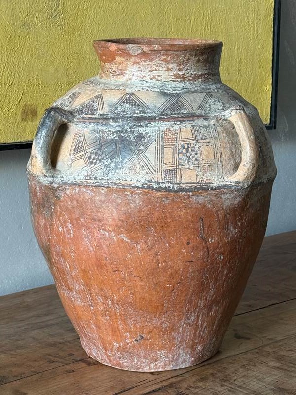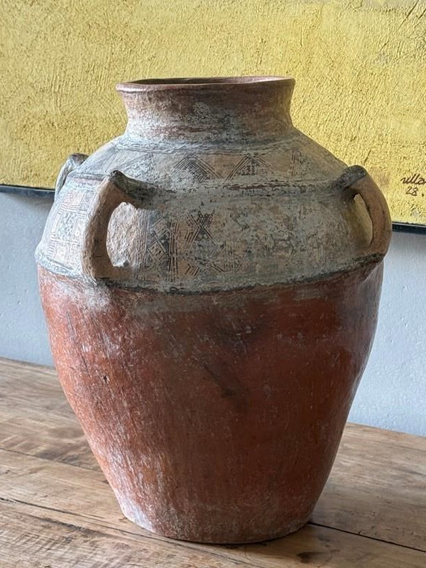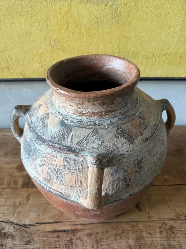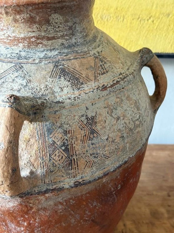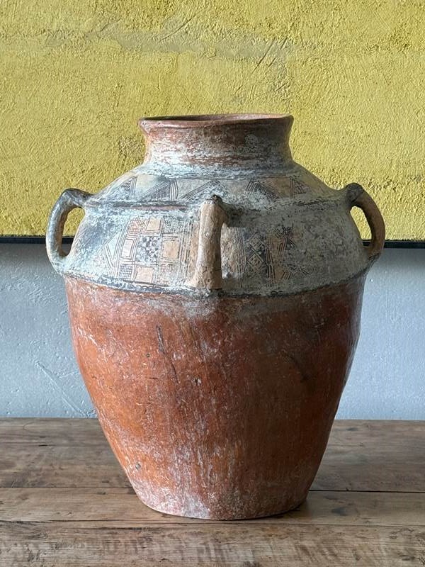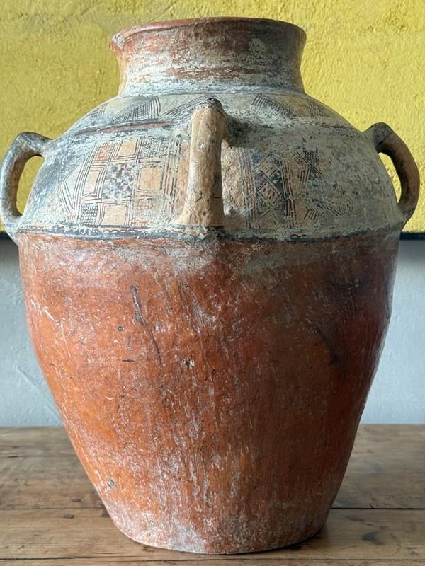 An Antique Berber Vase with wonderful time worn colour and patina, 4 handle neck and hand painted geometric band decoration. Ideal as a decorative vase atop a console or Commode etc.
