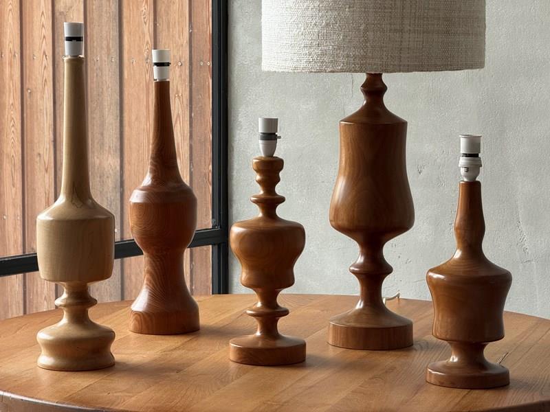 An Artisan Set of turned wooden Lamps, circa 1960-70. Turned from solid Elm, Sycamore and Mahogany. Highest lamp measures 57cm to bulb holder. Height as shown with bespoke shade (not included); 88cm.