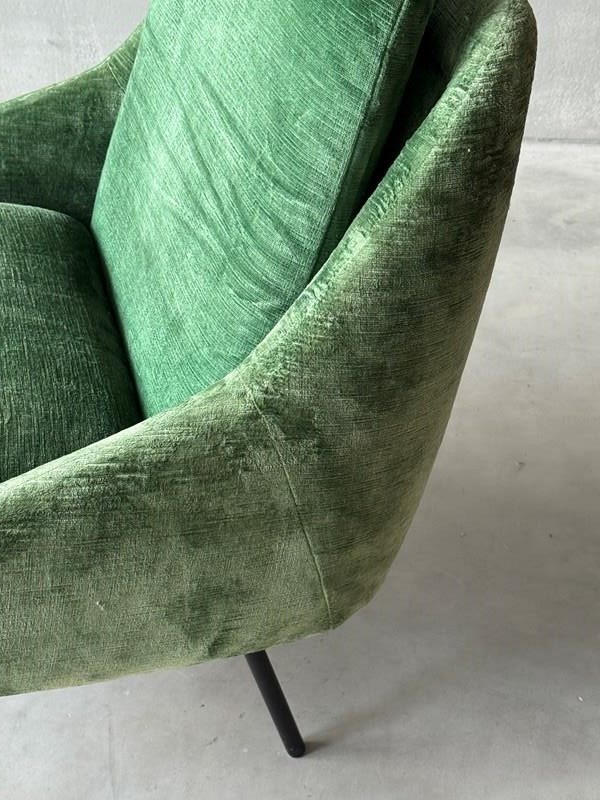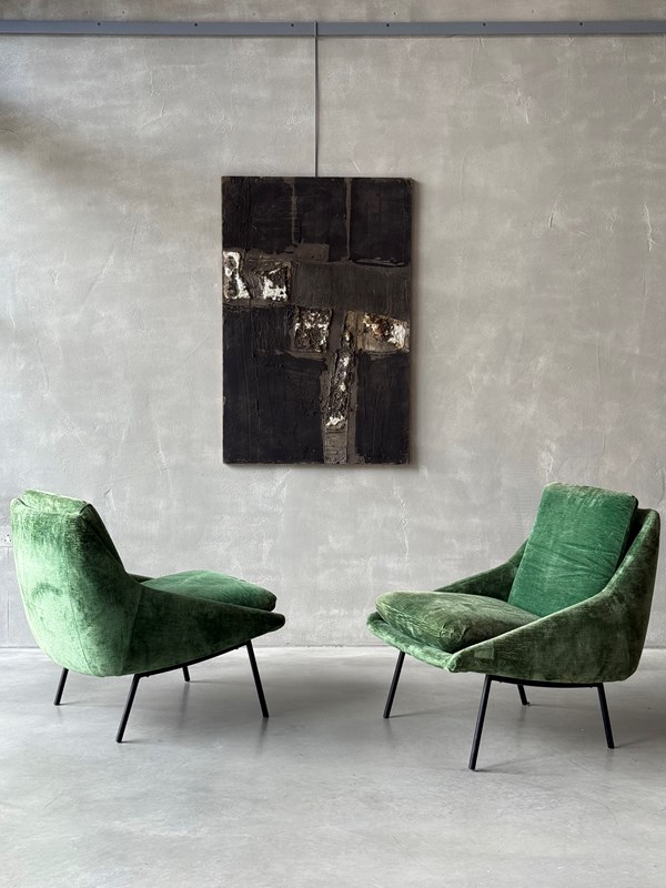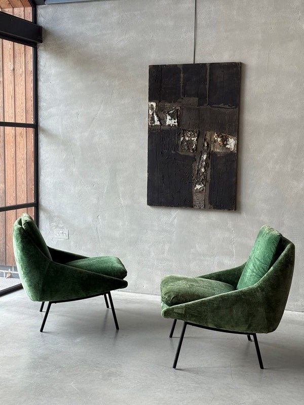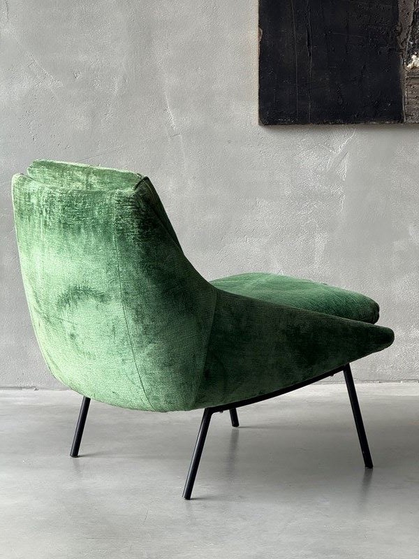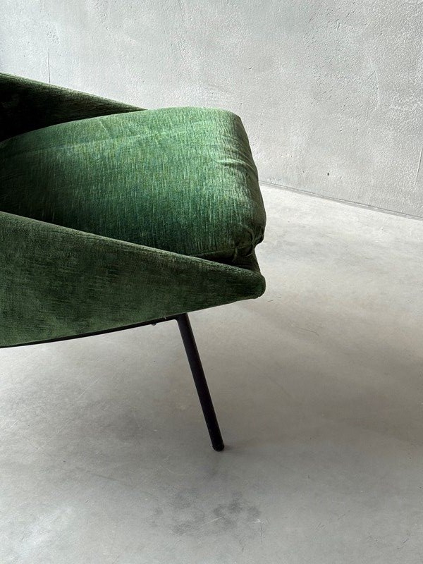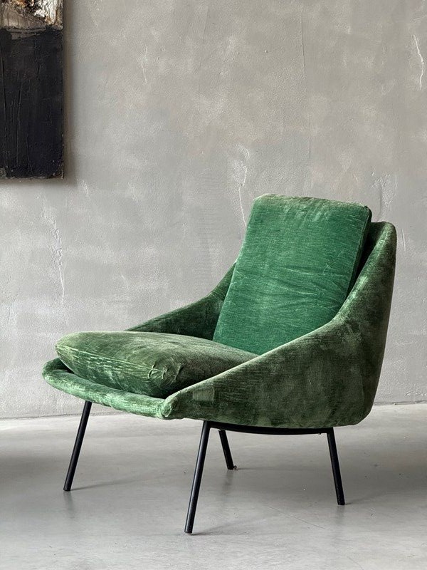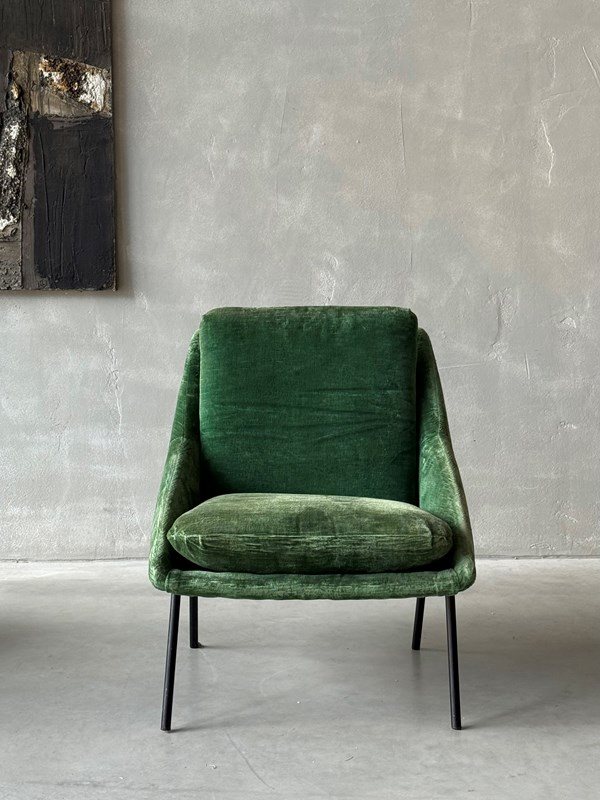 A rare Pair of 'model 800' Easy Chairs by Joseph André Motte, circa 1960. We love this model of Motte chair with their emphasis on curvaceous profile which 'floats' on minimalist splayed metal legs. Having been re-upholstered around 25 years ago, these chairs are serviceable in crushed velvet with signs of wear and age. The frames being in very good condition. Seat dimensions ; 45 cm high x 52 deep.