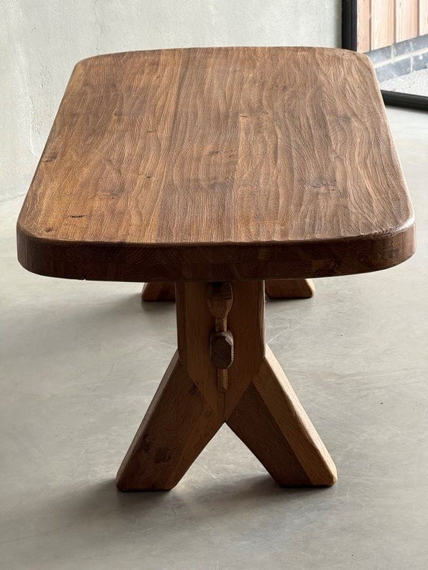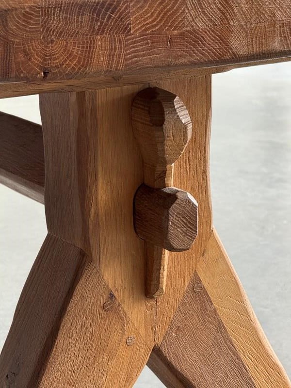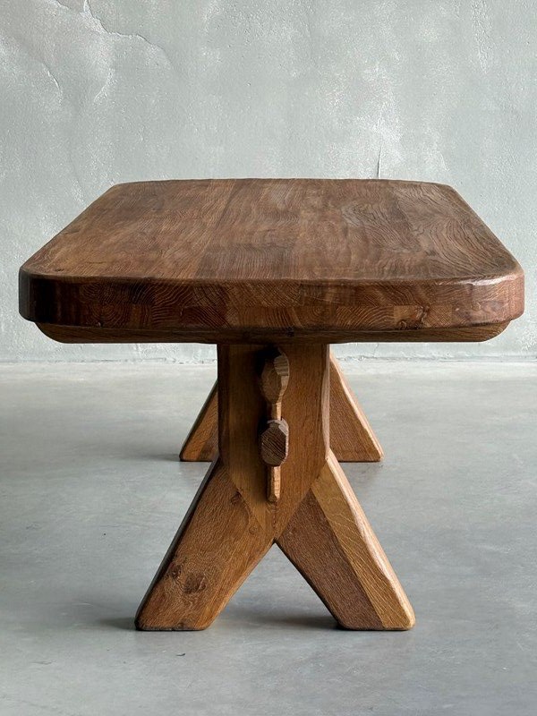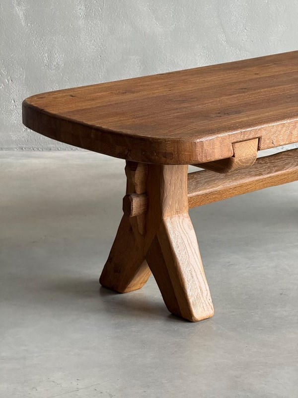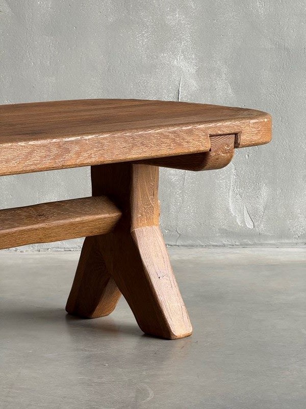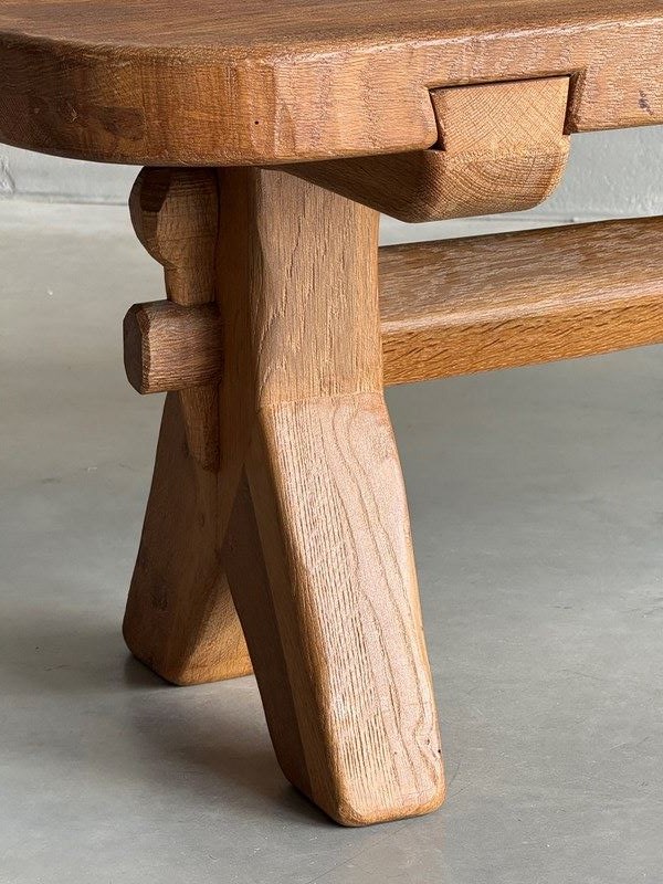 A 1960s Oak Coffee Table by De Puydt. In typical De Puydt style, this table has a playful emphasis on traditional construction techniques, combined with an element of Midcentury lines and textured surface. Peg joints, dovetails, tenons and chocks all provide great detail yet with an overall aire of simplicity.