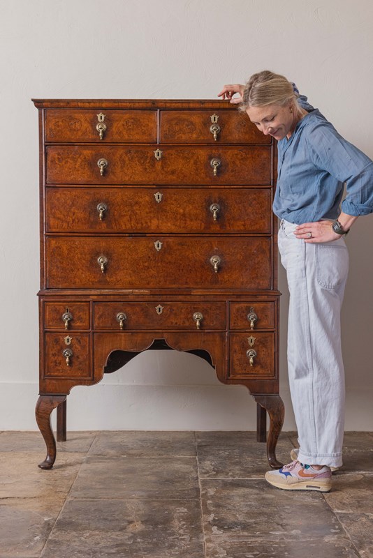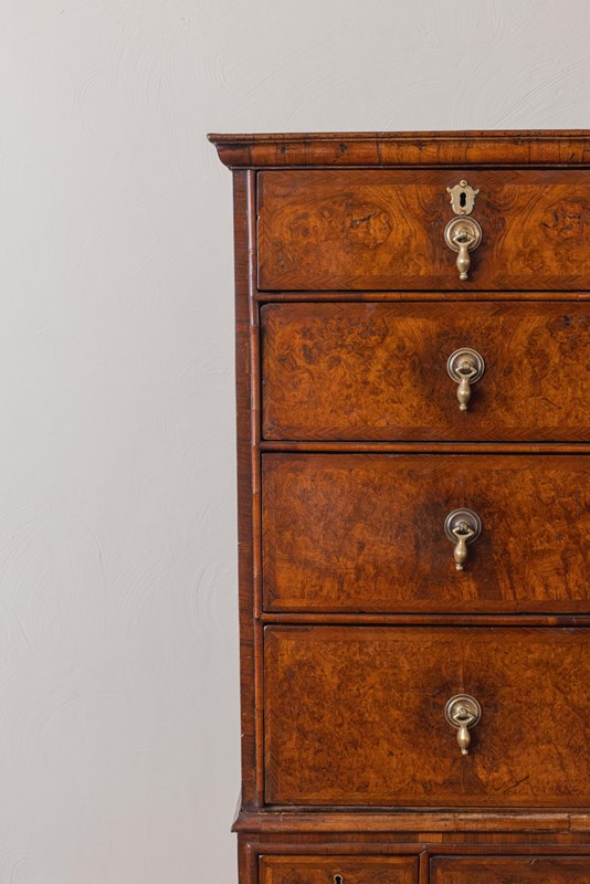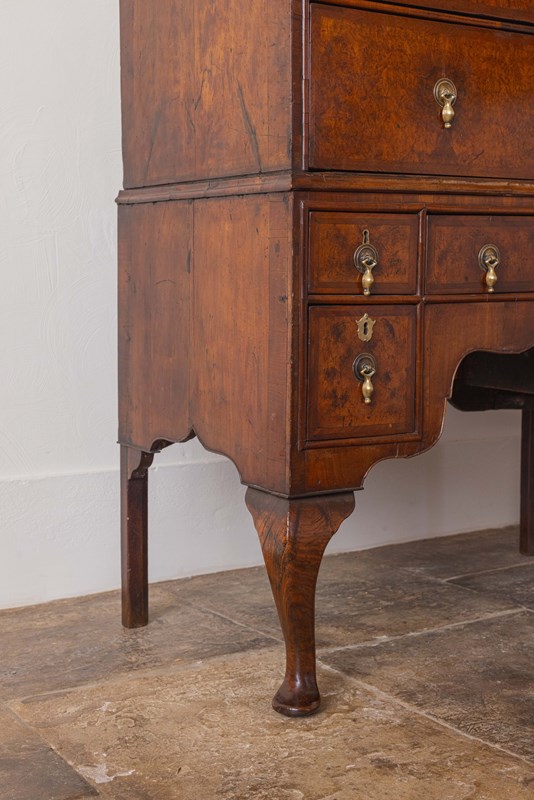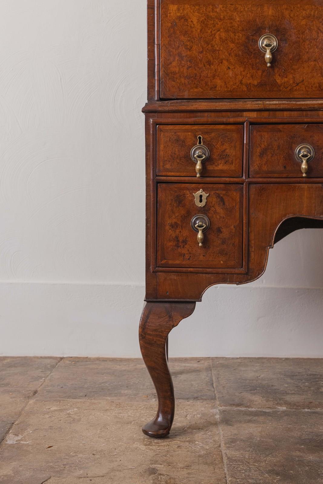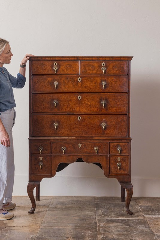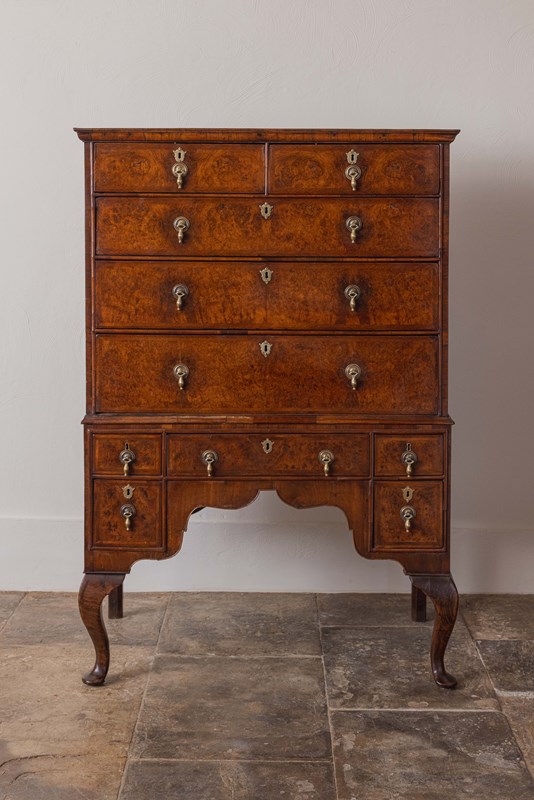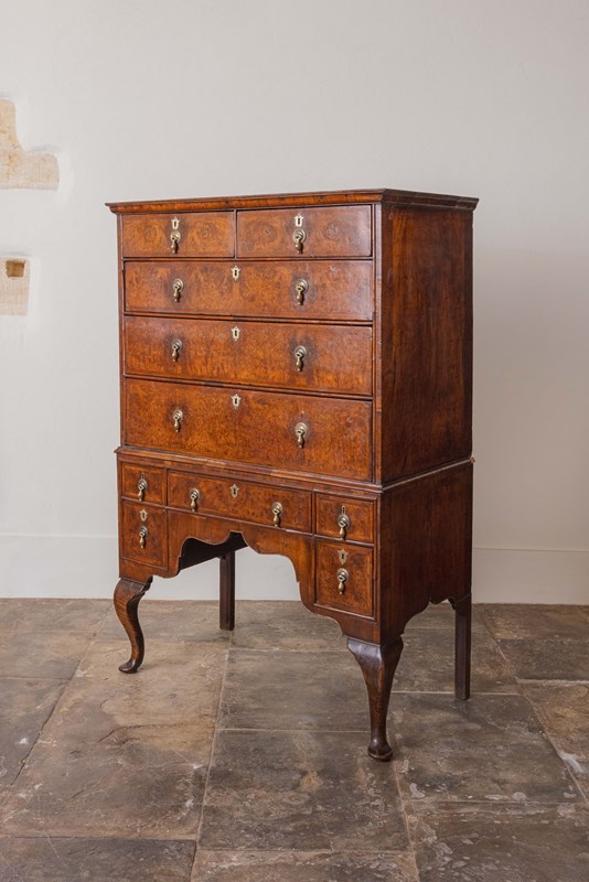 A superb early Georgian tallboy or chest on stand with key, dating from early 1700s. The upper section has two short drawers over three long graduated drawers, all feather-banded and veneered in book matched burr walnut. The lower section with five drawers and a shaped apron, raised on cabriole legs, terminating in pad feet.