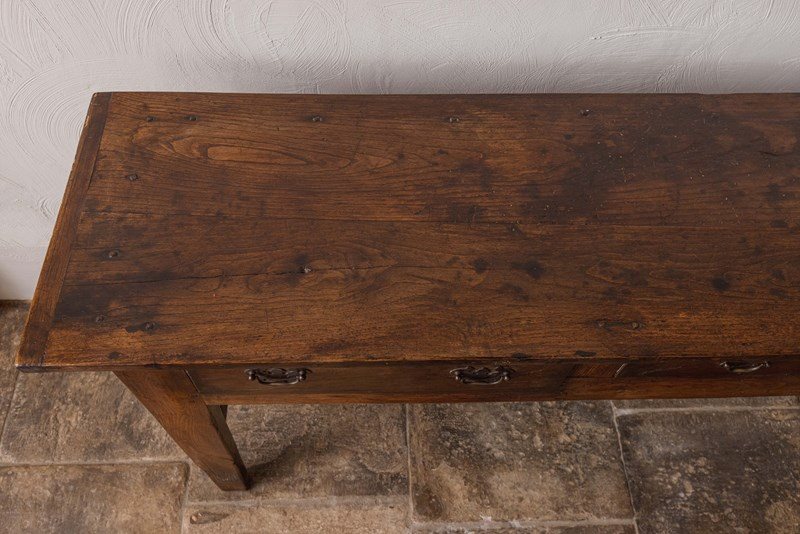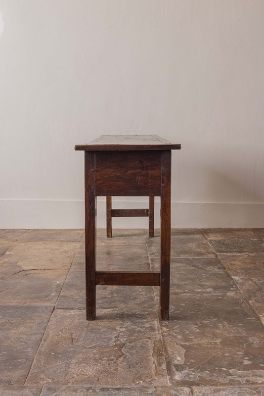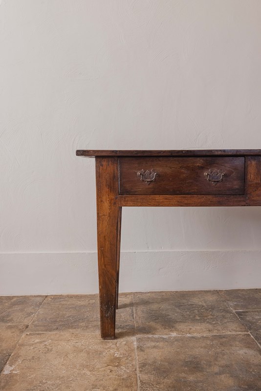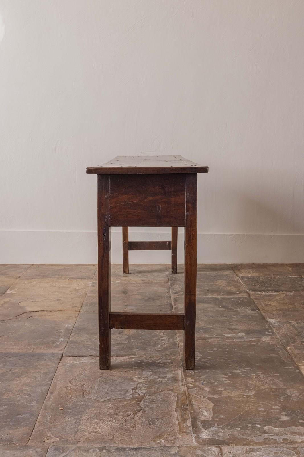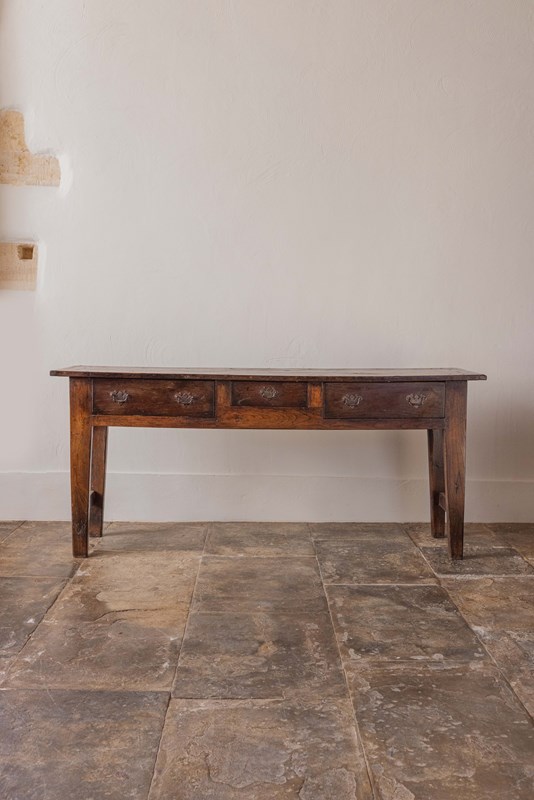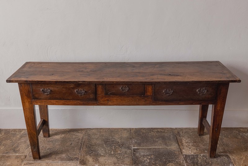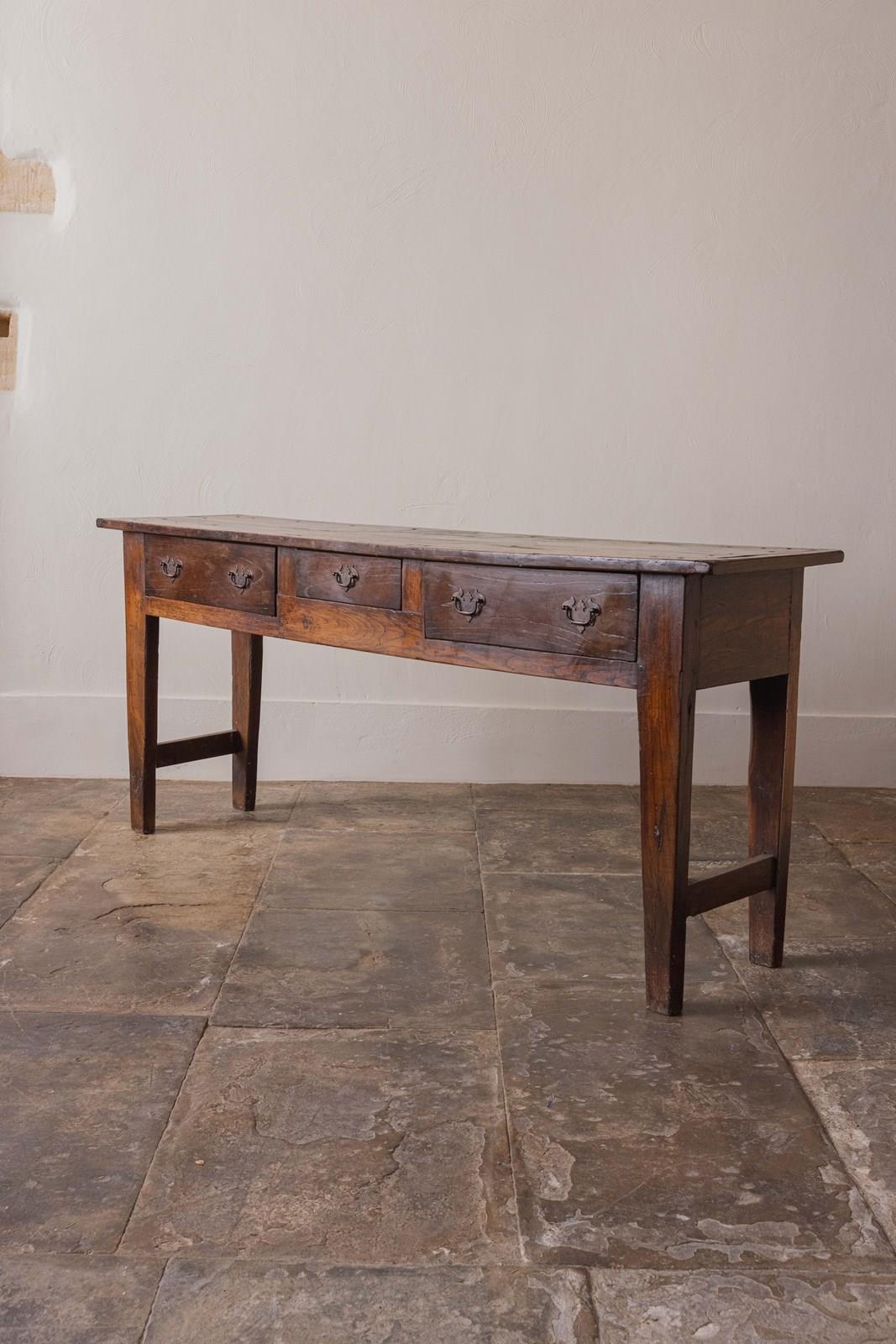 A handsome, late Georgian chestnut dresser base of generous proportions with three drawers and raised on square tapered legs. The drawers are fitted with swan-neck brass handles. Wonderfully narrow, perfect for a hallway, behind a sofa, in a kitchen - such a useful piece.