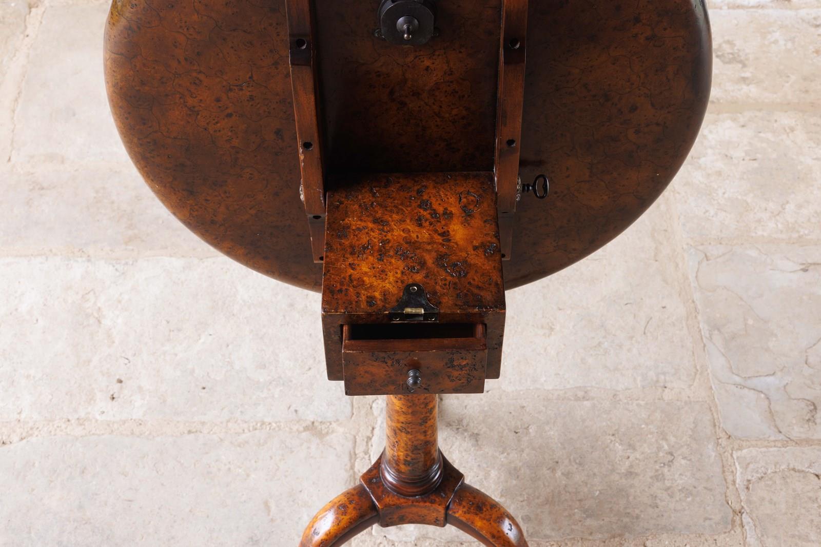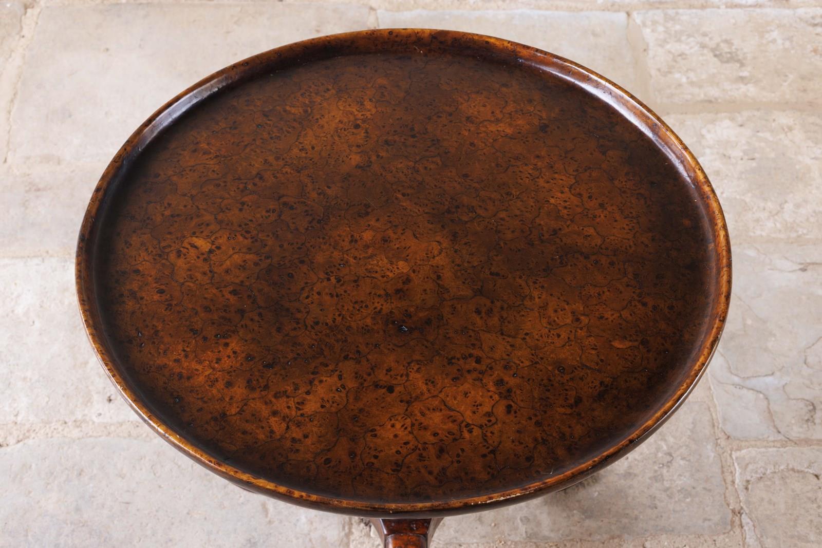 A truly beautifully made tilt table with plate top in rich burr walnut which is unusually continued down the stem. Our eyes wouldn't normally be turned to such a recent piece, however there are always exceptions for items that are special enough.