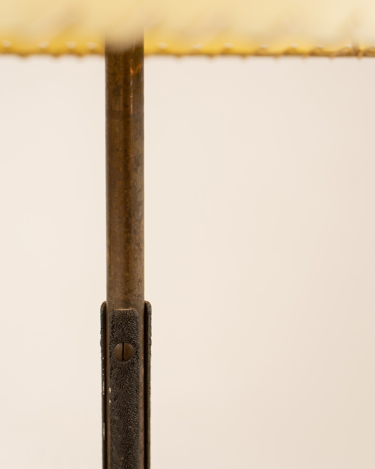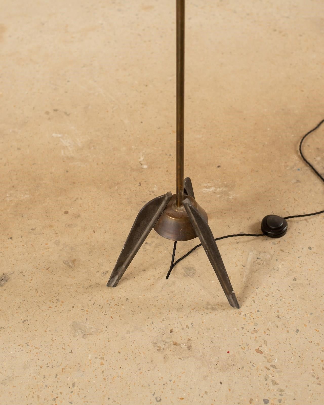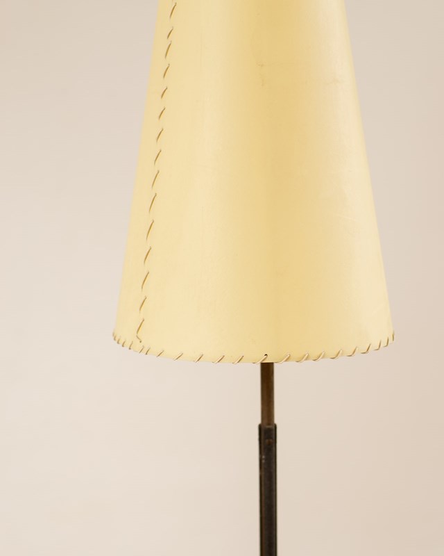 A rare 1950's Italian floor lamp with its original shade intact. The metal lamp sits on top of black cast iron tripod feet with a textured metal grip to the centre of the lamp pole. The velum shade has a whip stitched edge and is in excellent condition. This piece has been professionally re-wired and pat tested.