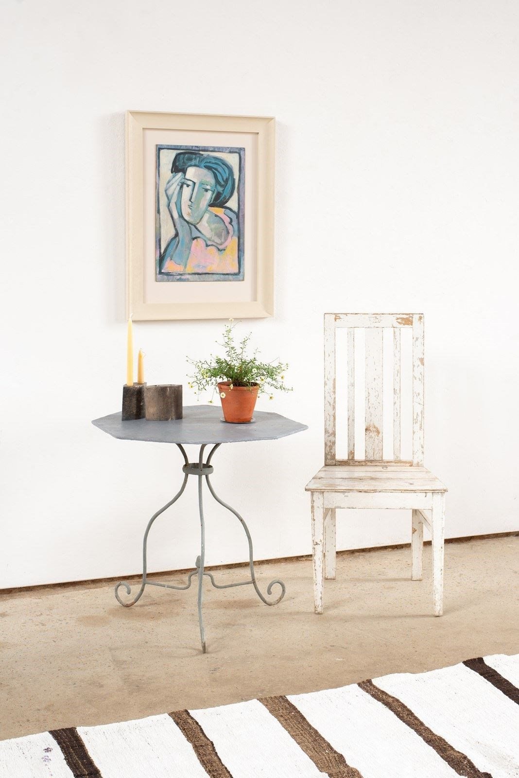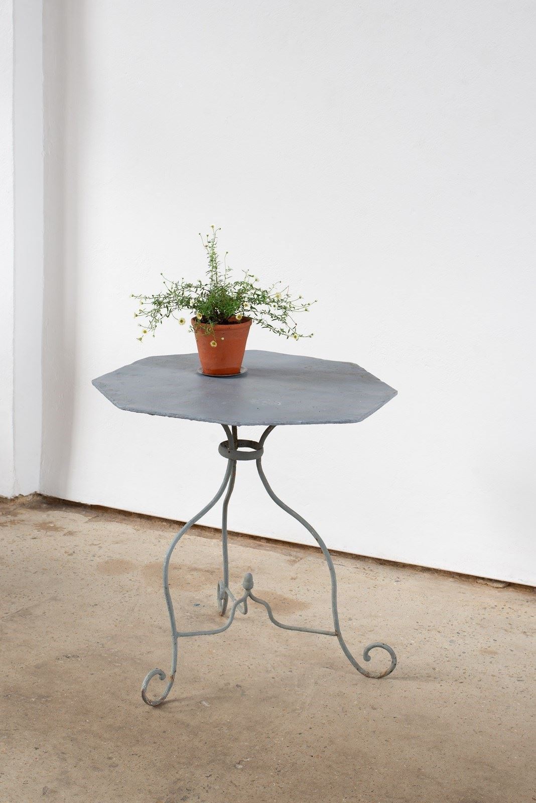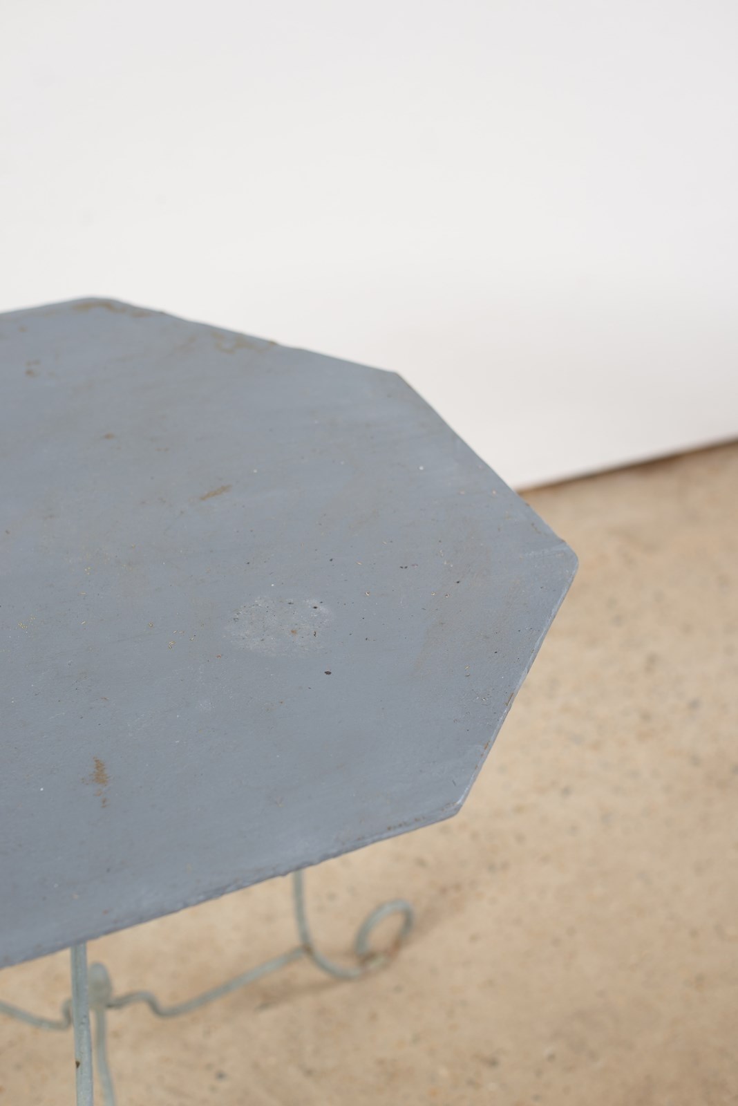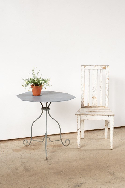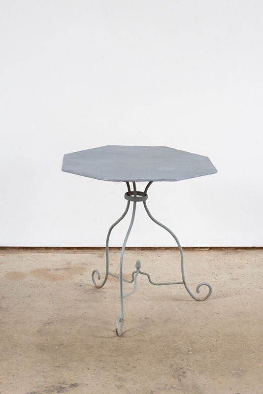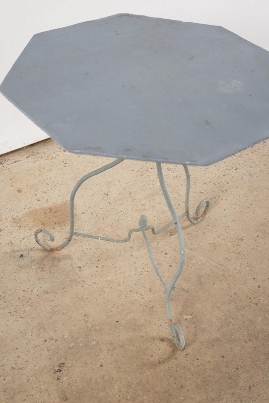 A 19th-century wrought iron table from Nancy, France. It has an octagonal sheet top and scrolled, solid iron legs, with a characterful lilt. Historically painted a mid-grey, which adds an interesting edge and makes this a piece that would work beautifully inside, as well as out.