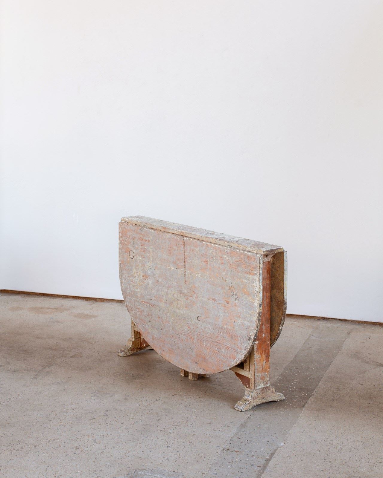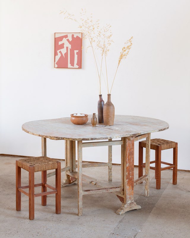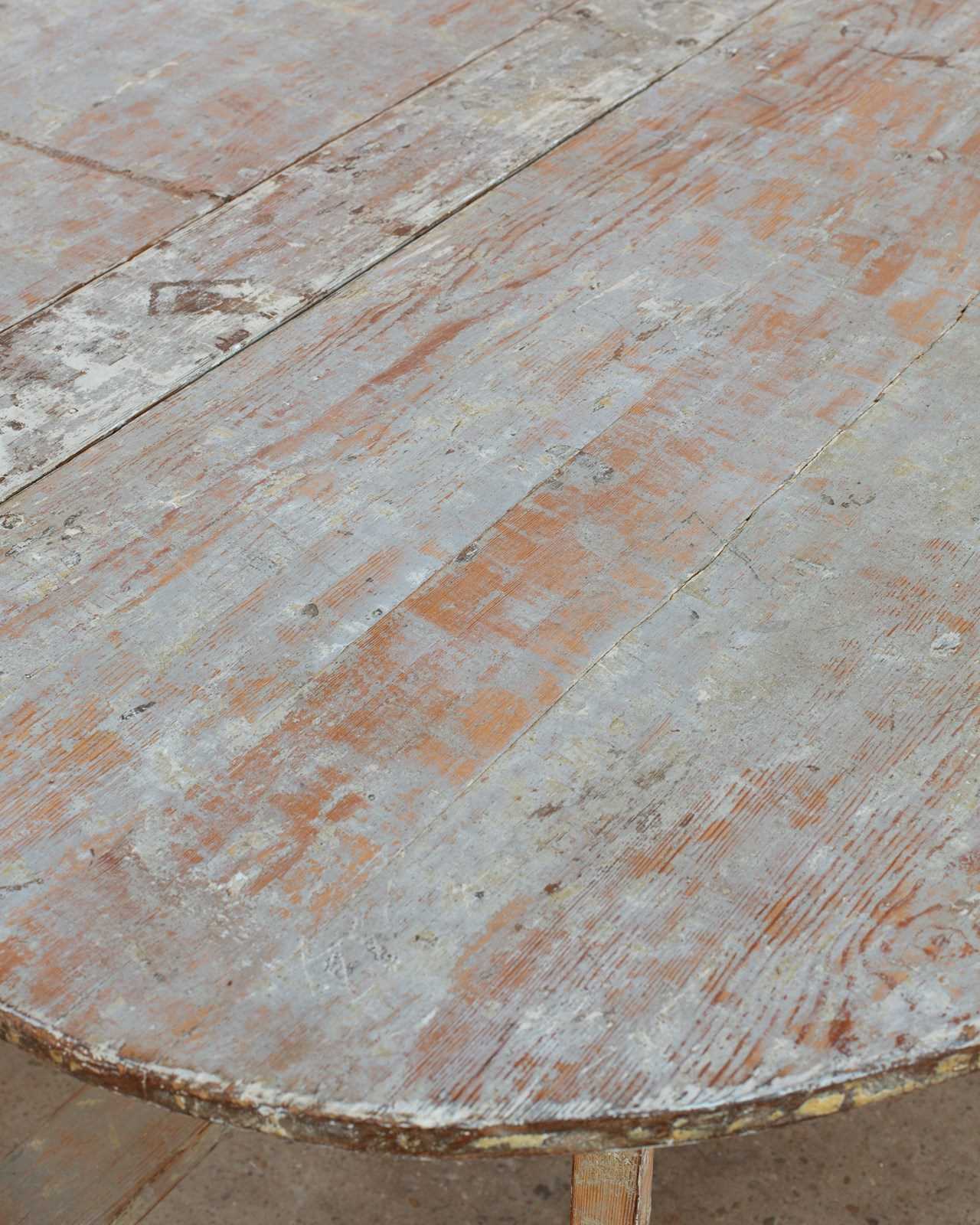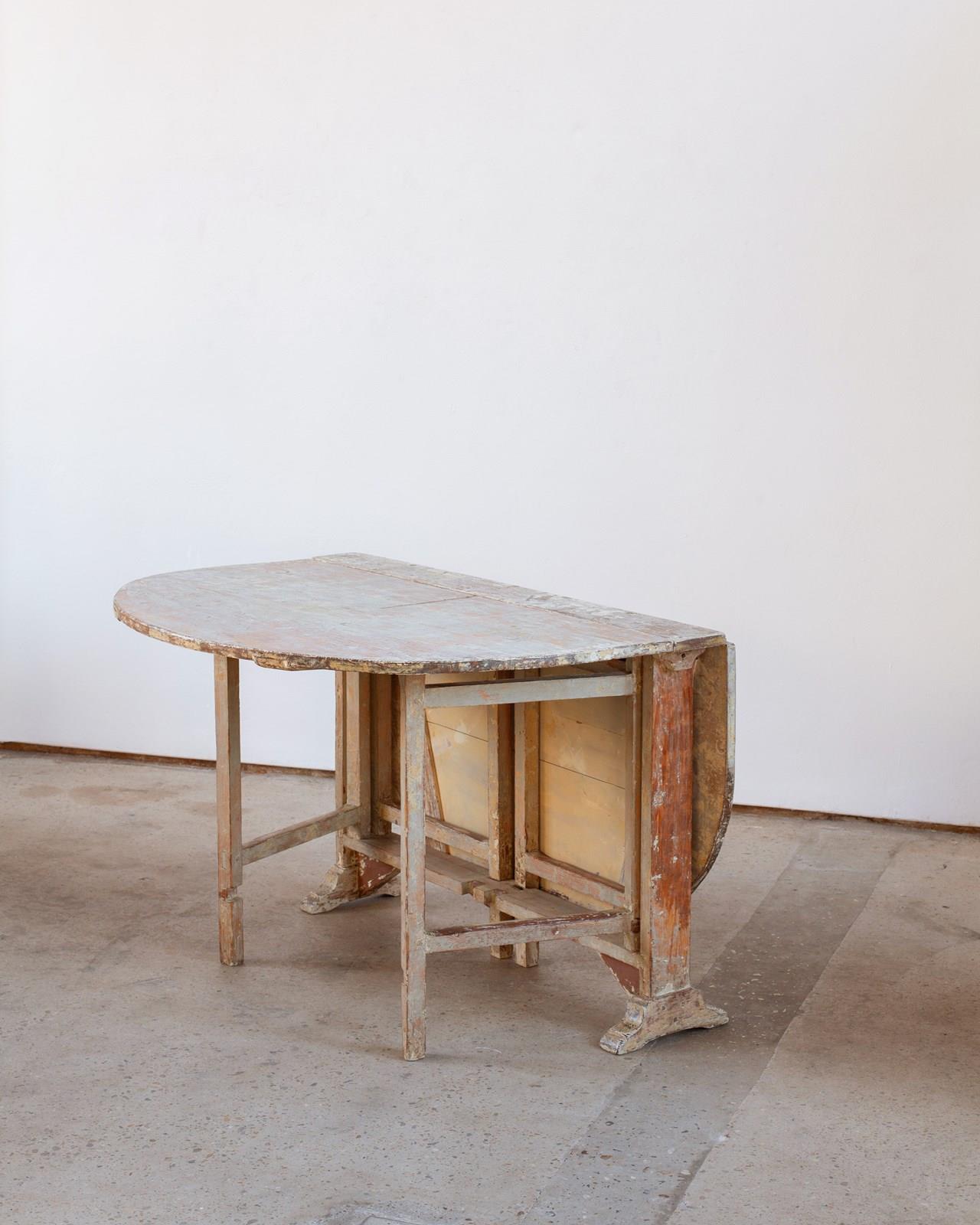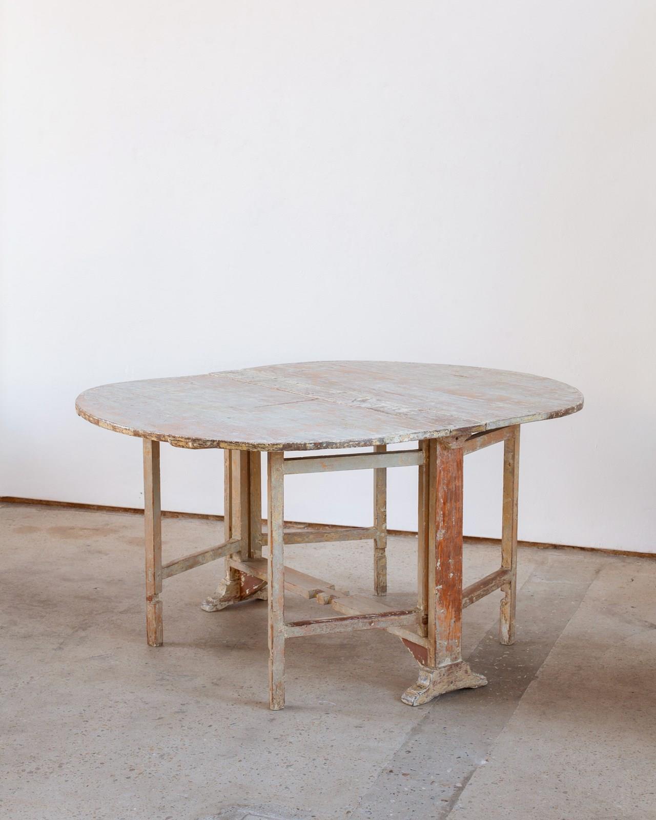 A 19th-century drop-leaf table from Sweden with its historical painted pine surface in tones of off-white and blue-toned grey.  It is in very good antique condition and sits sturdily when extended.  It would comfortably seat 6 people.