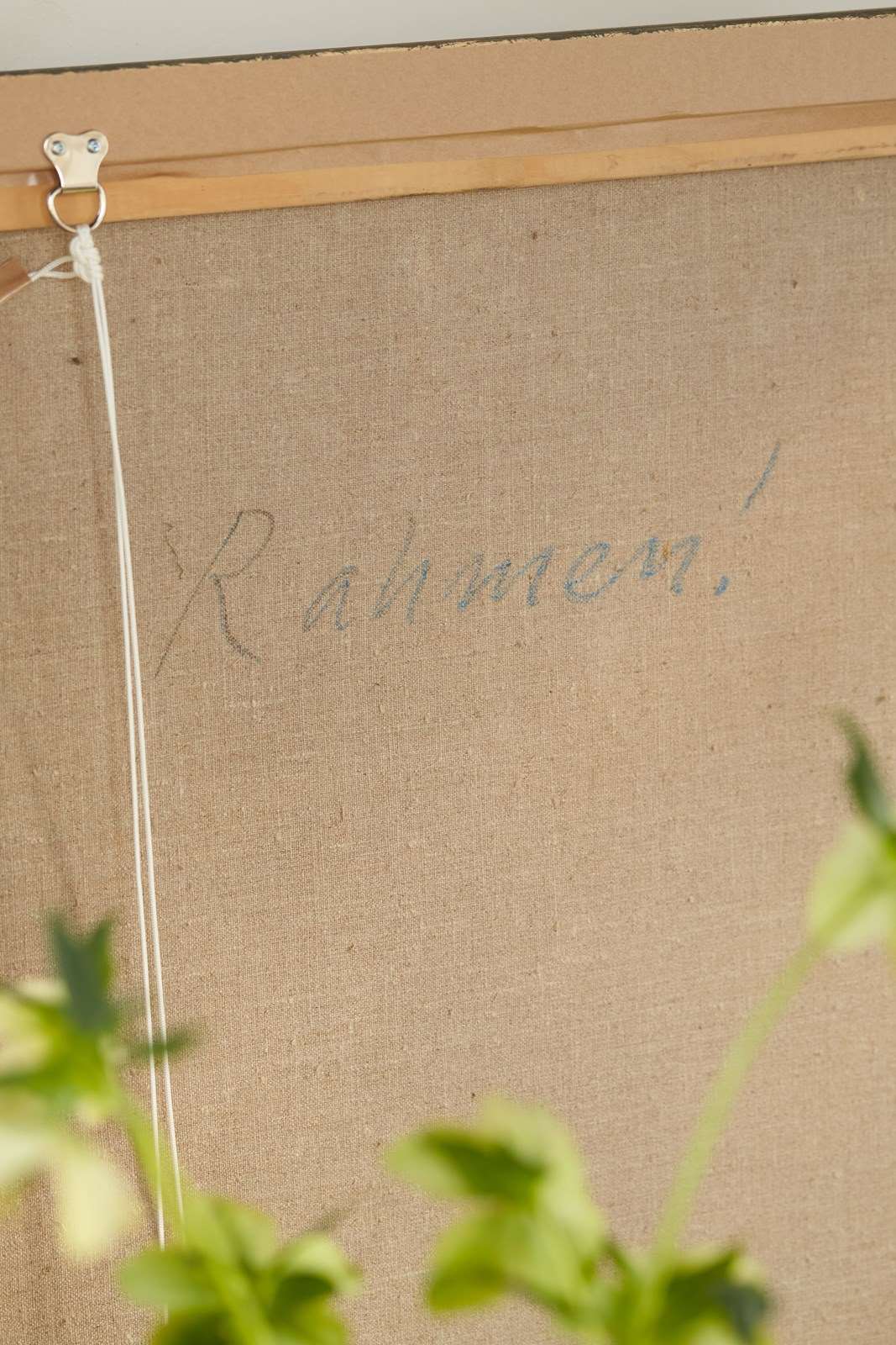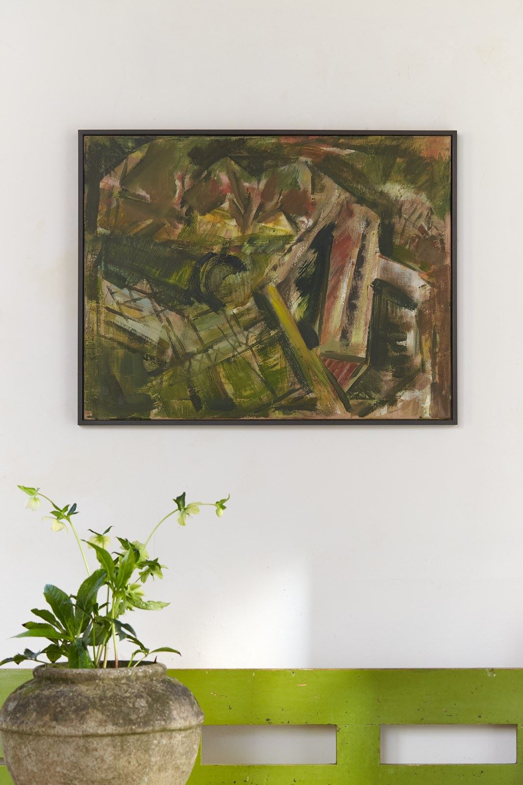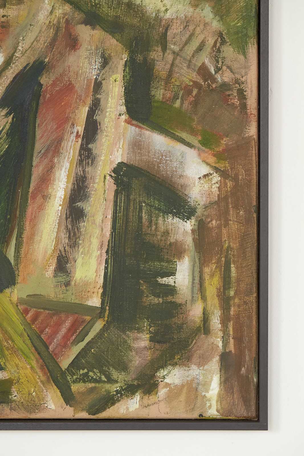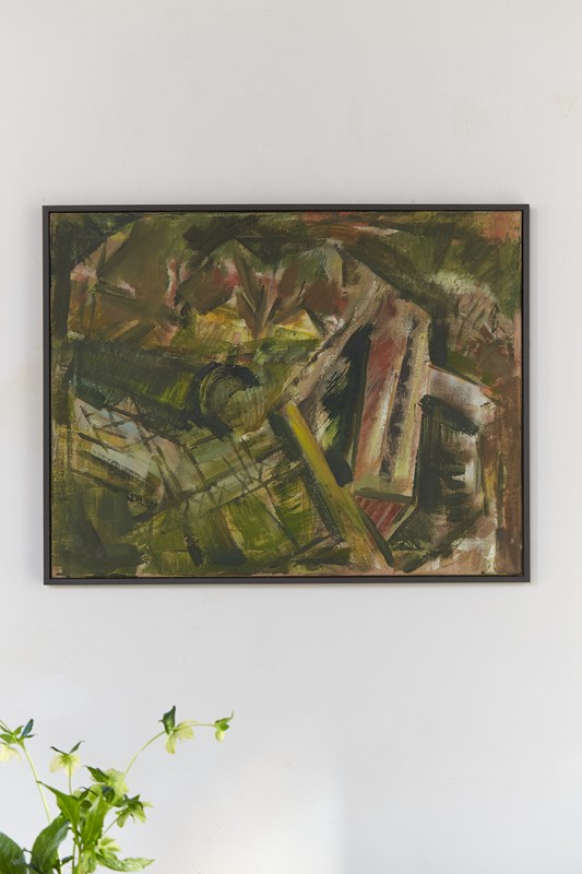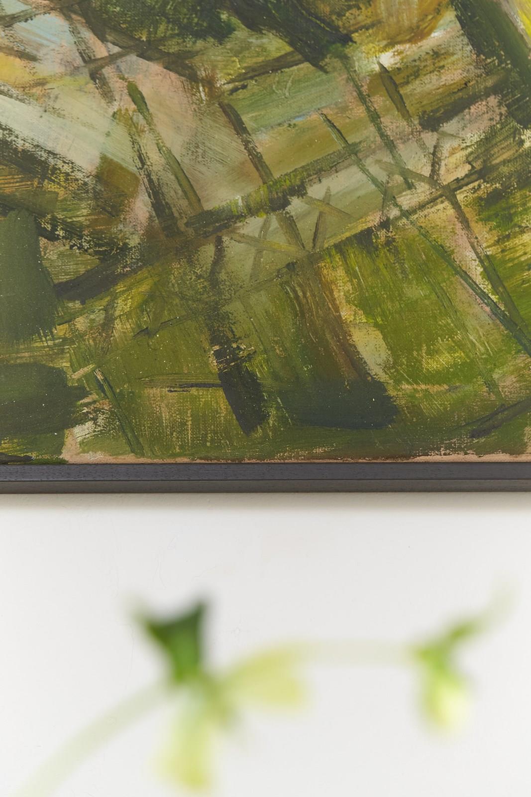 A 20th-century German abstract artwork painted in acrylic on canvas by an anonymous artist.   The work uses a palette of greens and reddish-pink, applied in bold brushstrokes, depicting a rural farmstead.  The piece is presented in a hand-painted wooden tray frame.