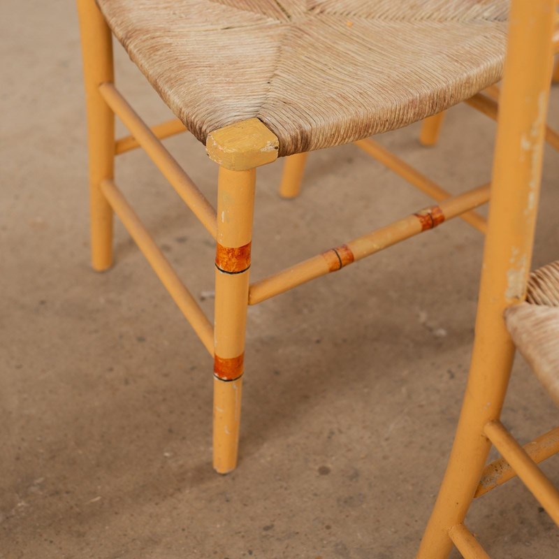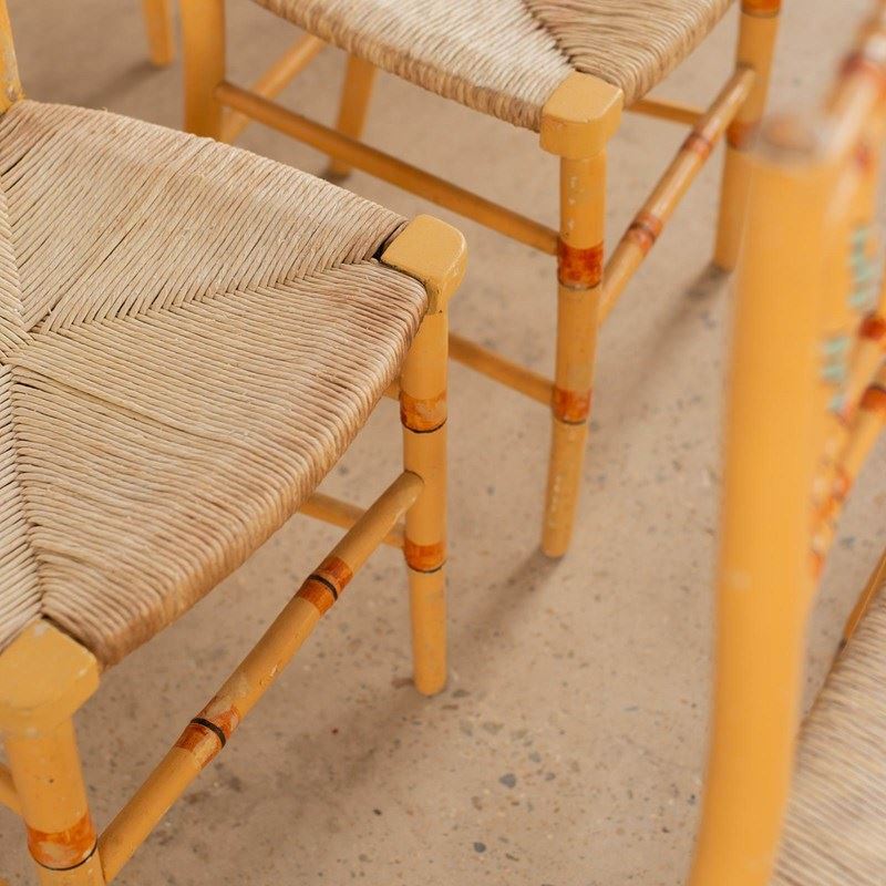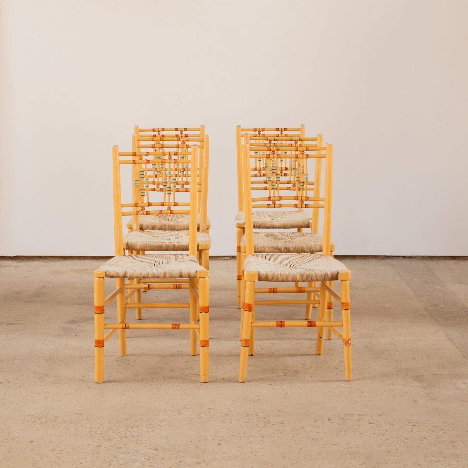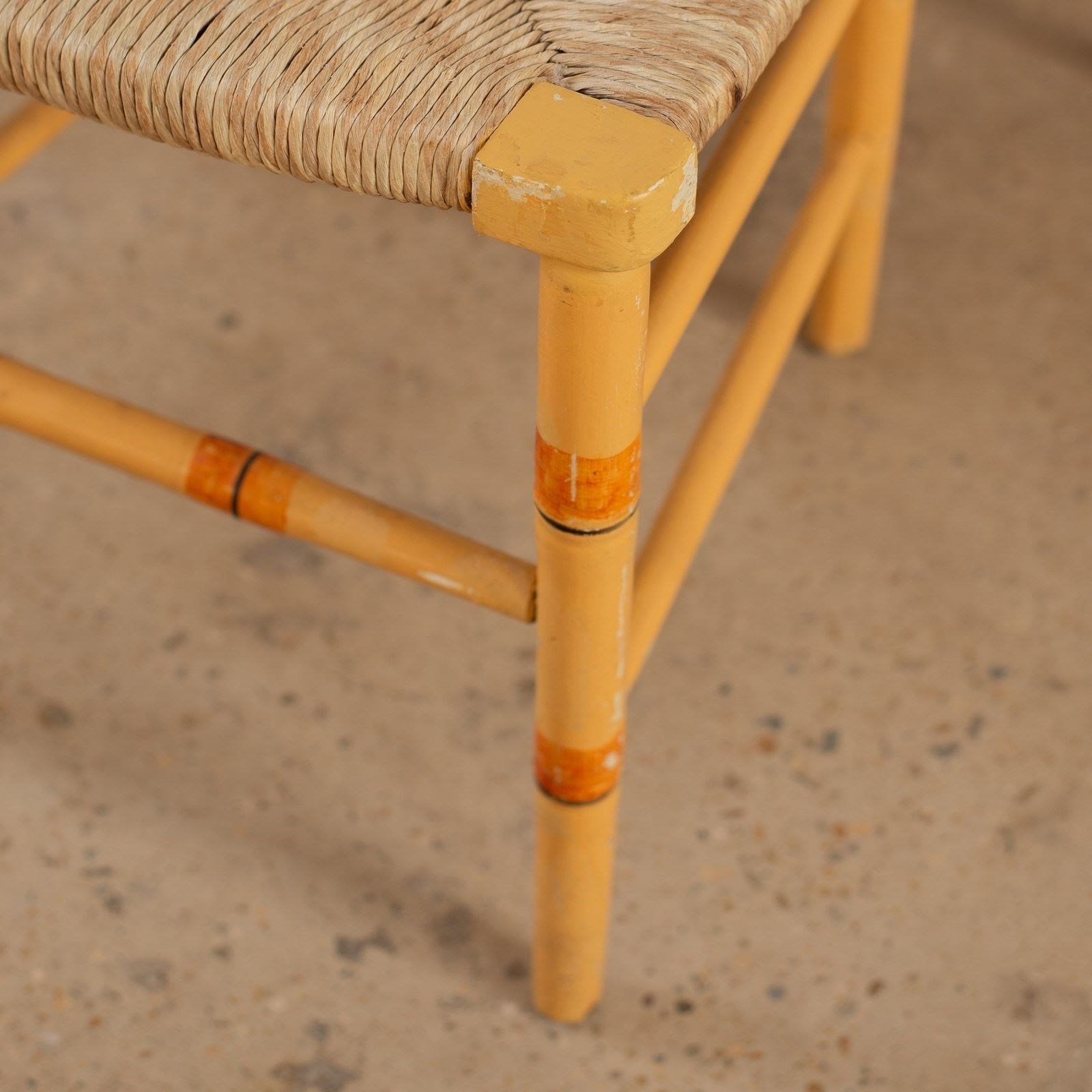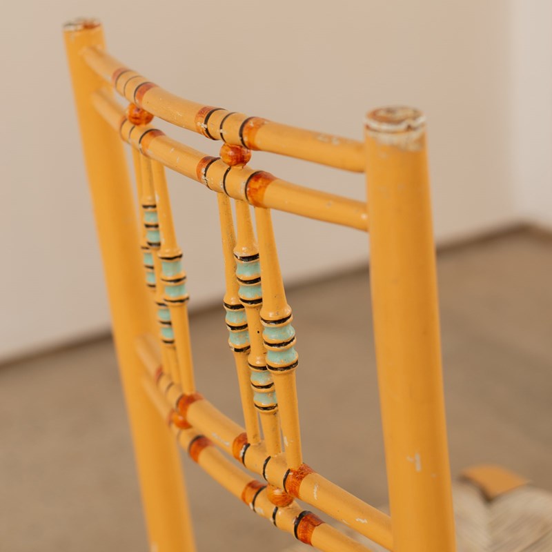A French faux bamboo regency chair which have been historically painted with jaunty stripes in brick, blue and black against a rich biscuit coloured base. They have their original rush seats in tact and are in good condition.
