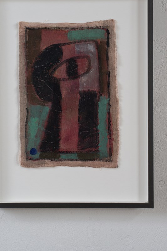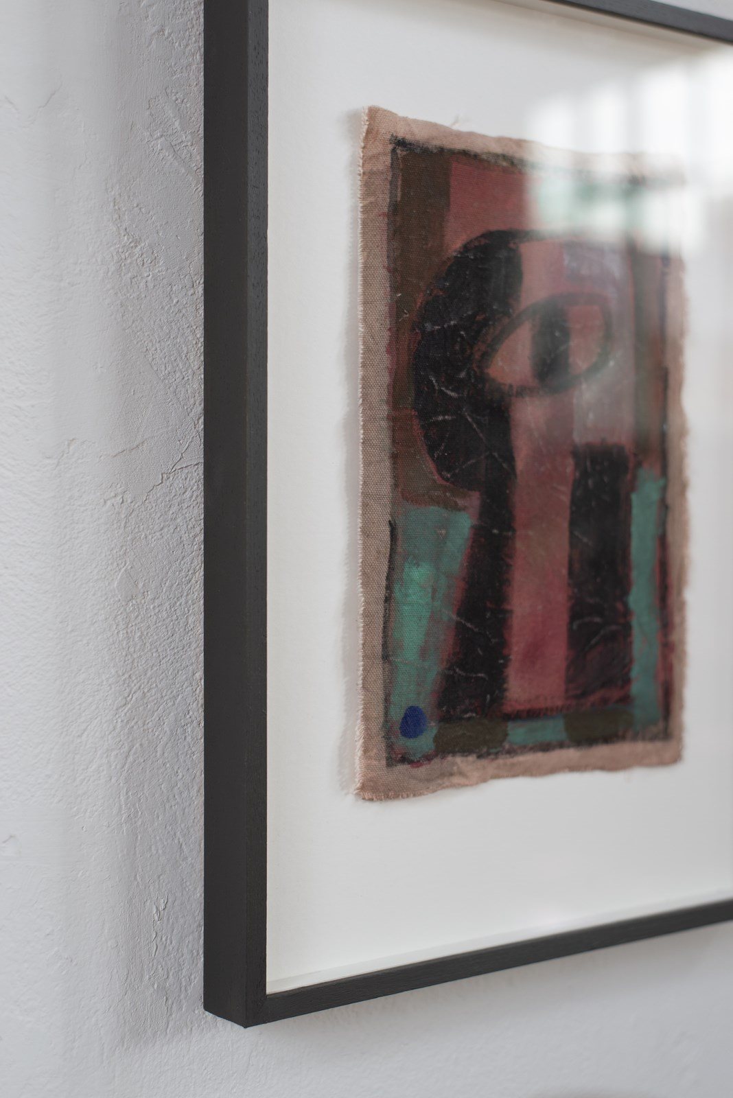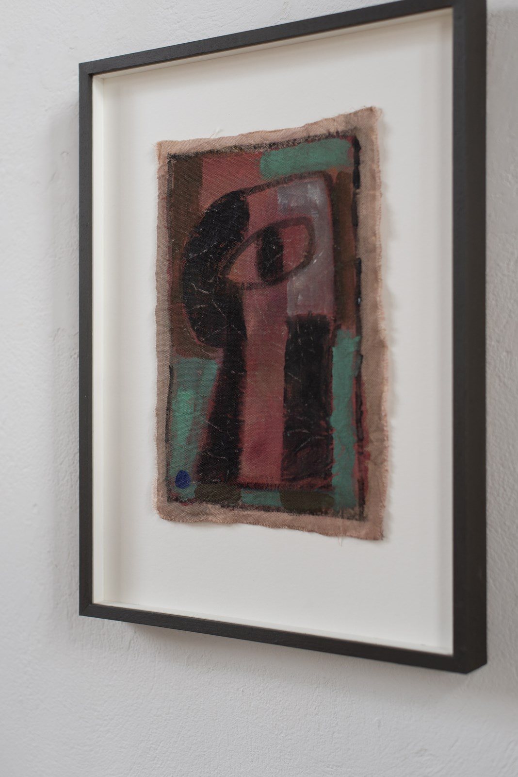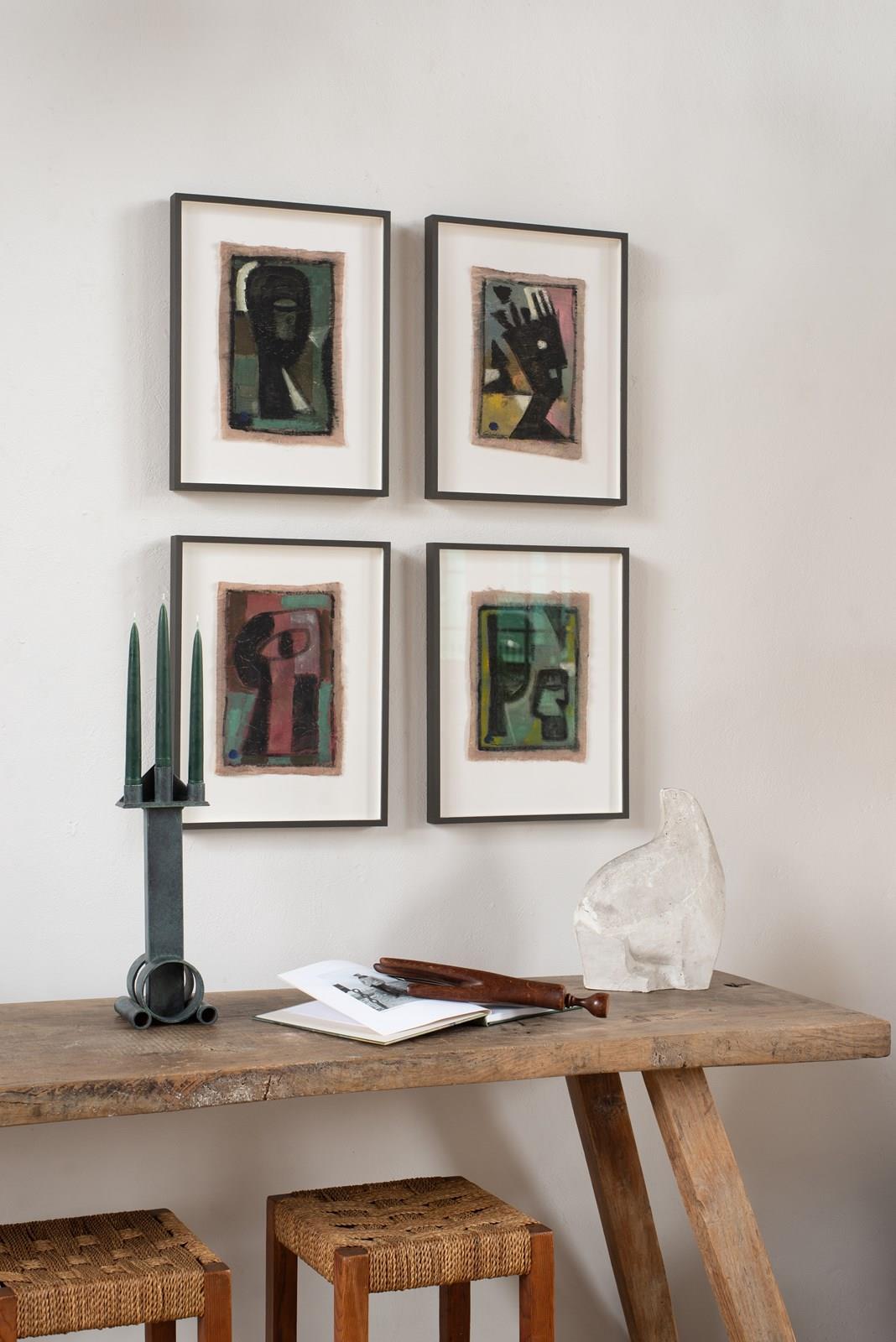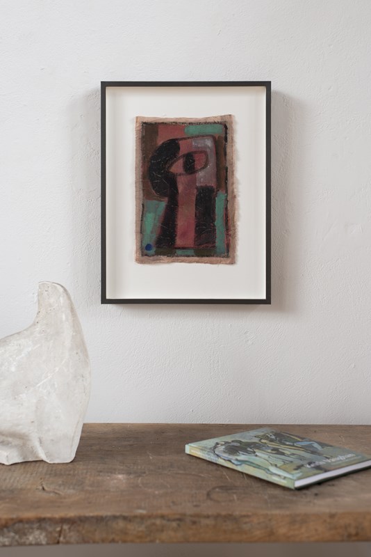 An abstract figurative composition rendered in muted earth tones, painted in acrylic on canvas by Florentine artist Giacomo C1980.  Blocks of colour and uncomplicated brush strokes create a stylised mix of totemic portrait and graphic pattern.  Presented in a hand-painted wooden frame.