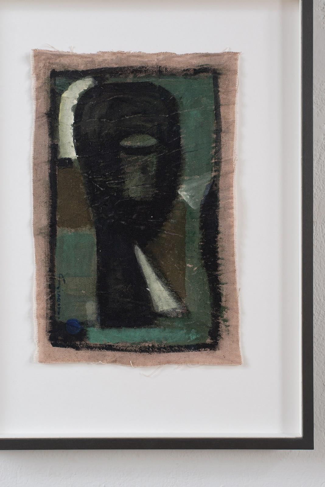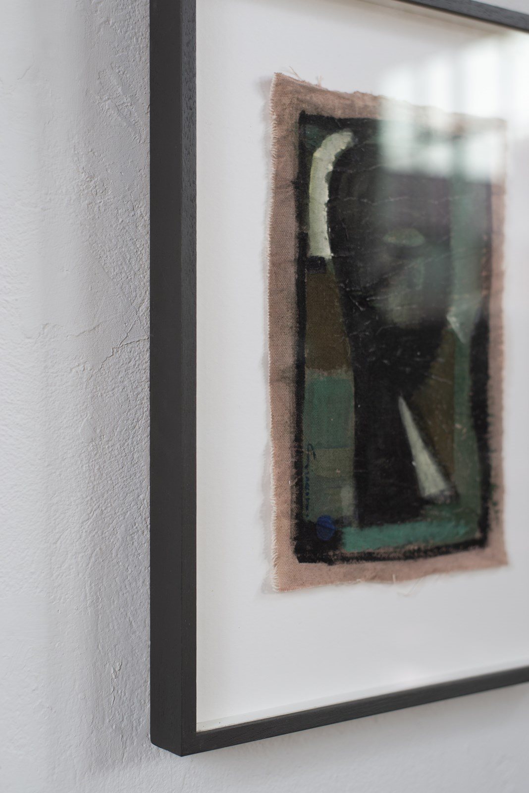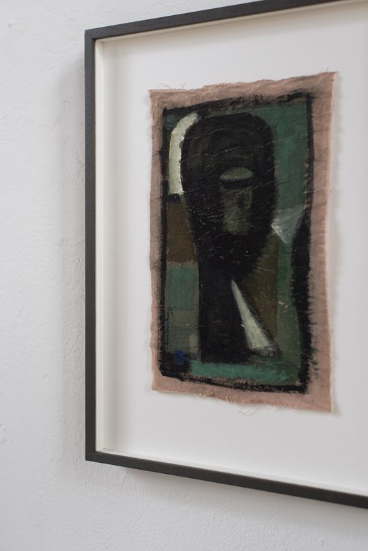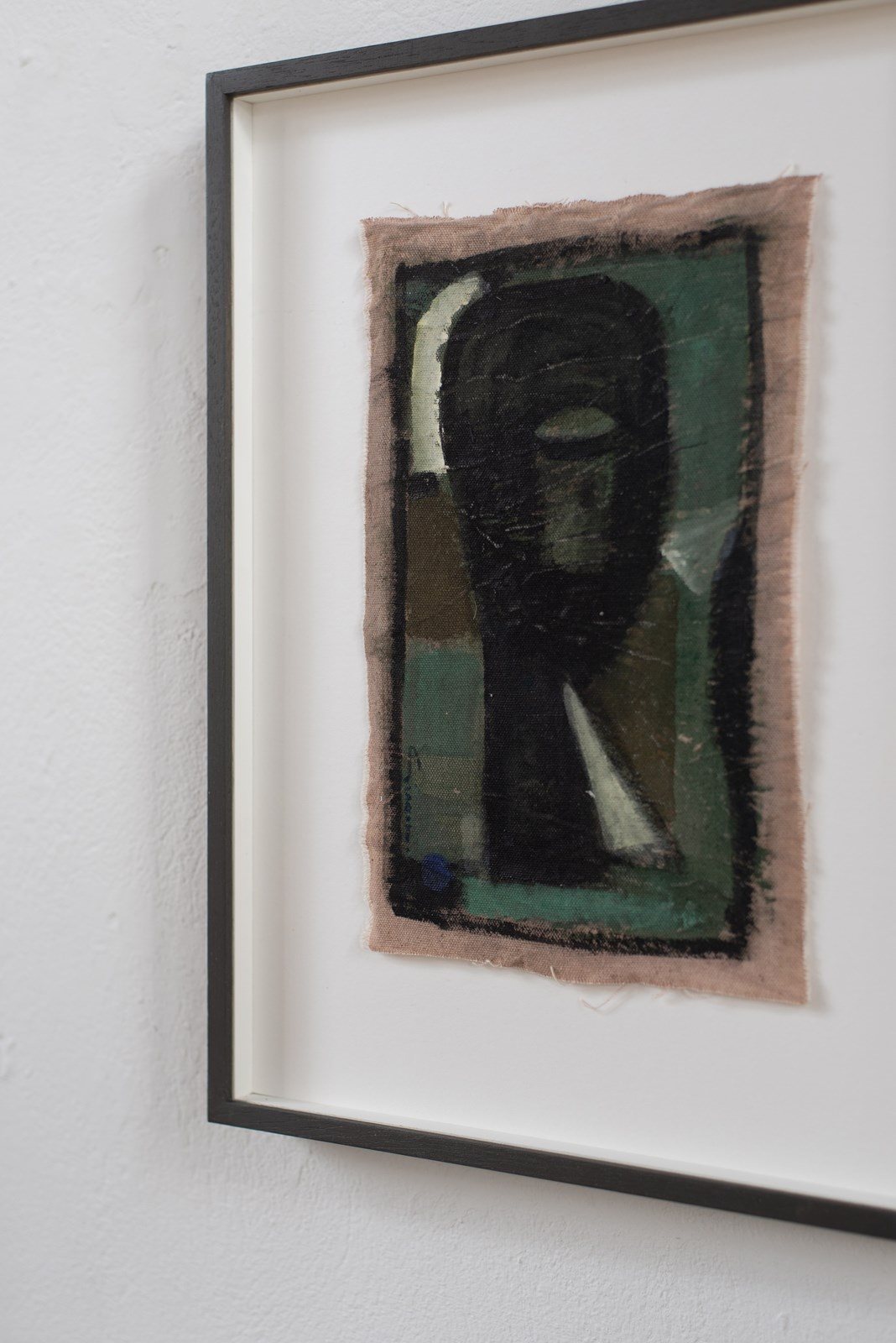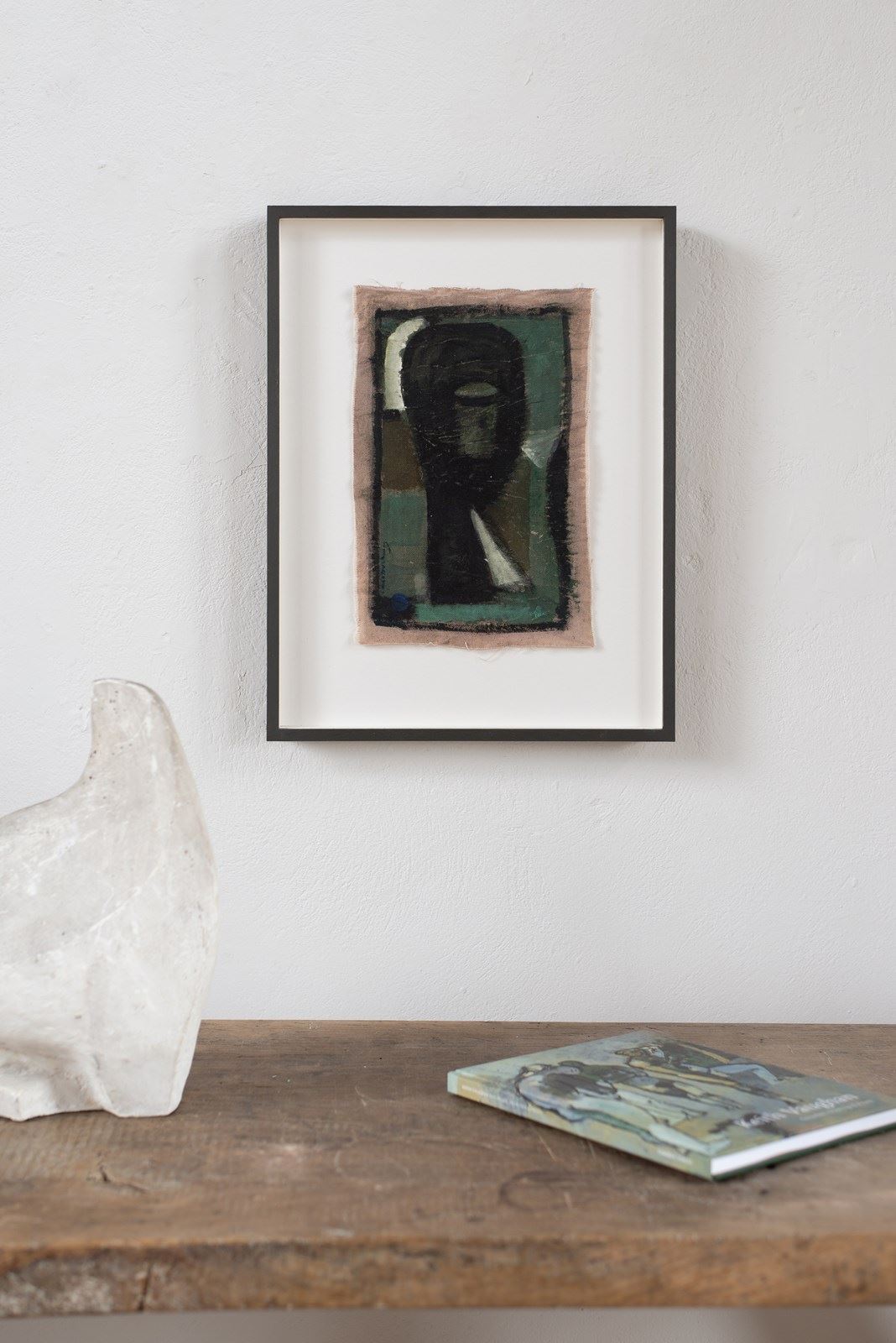 An abstract figurative composition rendered in tones of earthen green alongside charcoal, painted in acrylic on canvas by Florentine artist Giacomo, C1980. Blocks of colour and uncomplicated brush strokes create a stylised mix of totemic portrait and graphic pattern. Presented in a hand-painted wooden frame.