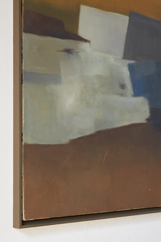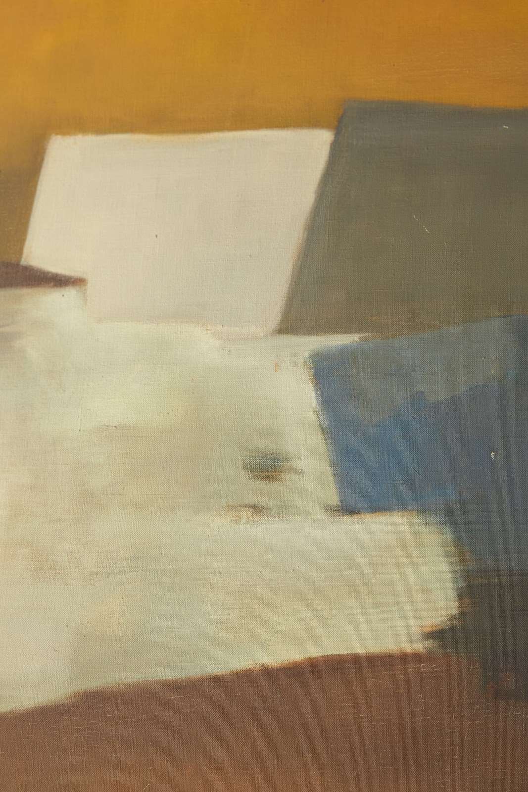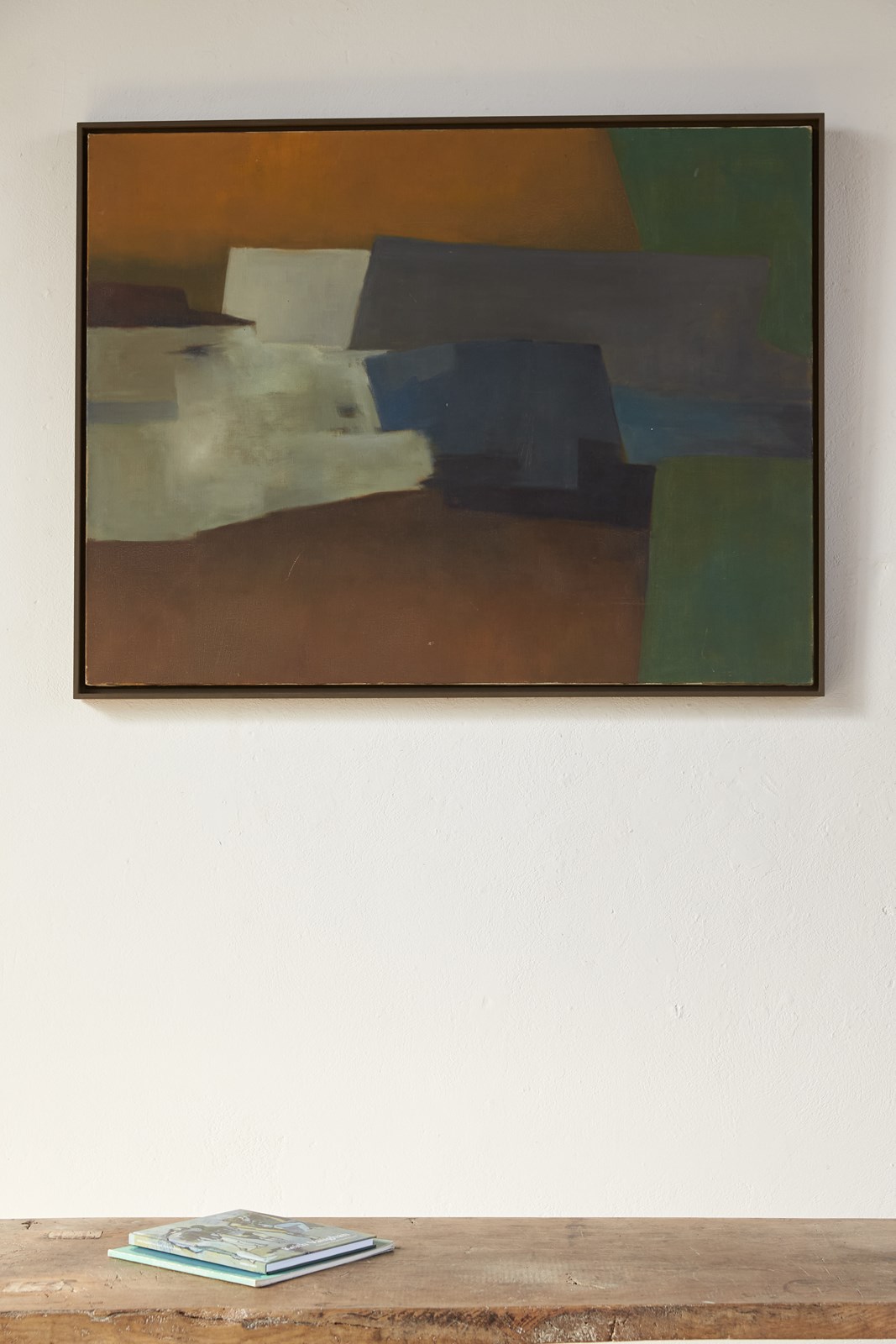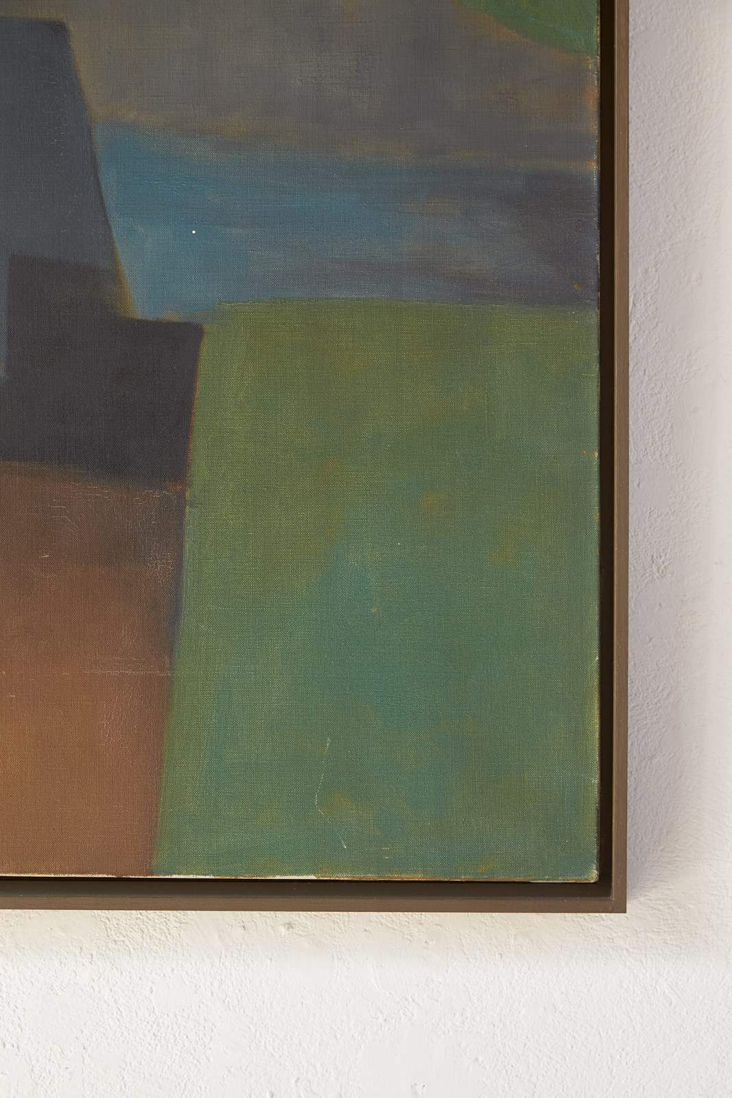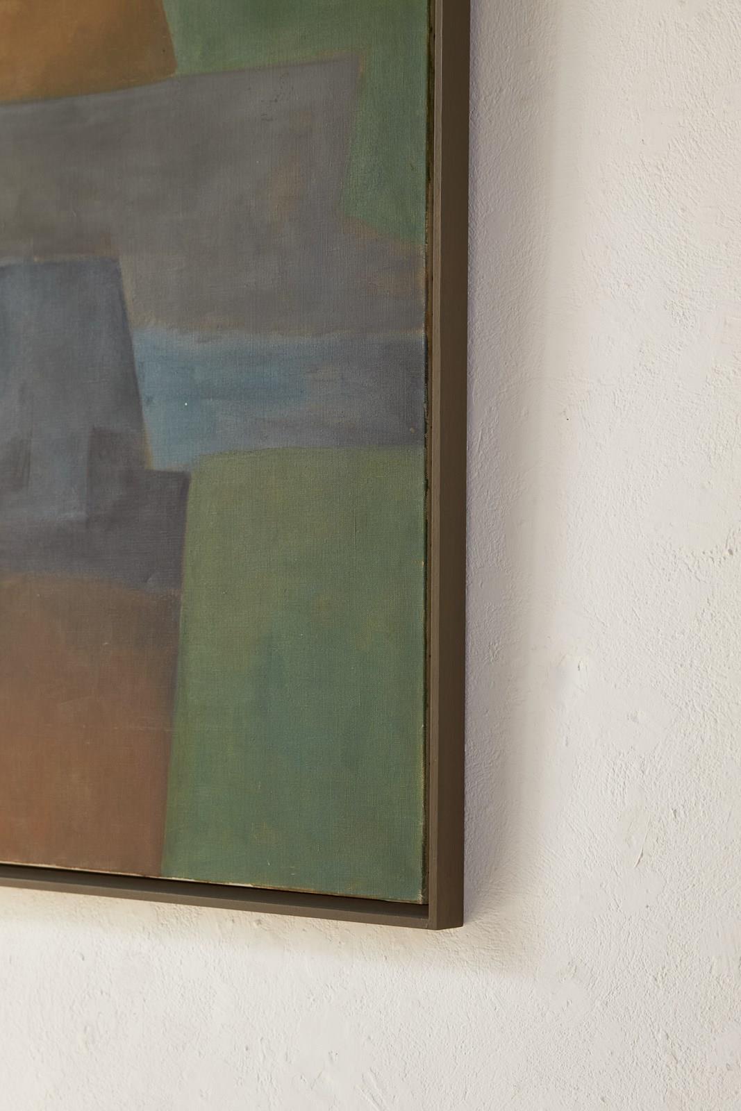 A large-scale graphic abstract landscape in oil on canvas by French artist Marie-Louise Hardy (1911-1987), of the Atelier Goetz. Hardy worked alongside Henri Goetz, becoming meister of his atelier during the mid-20th-century.  Her work is characterised by strong abstract compositions in oil and pastel.