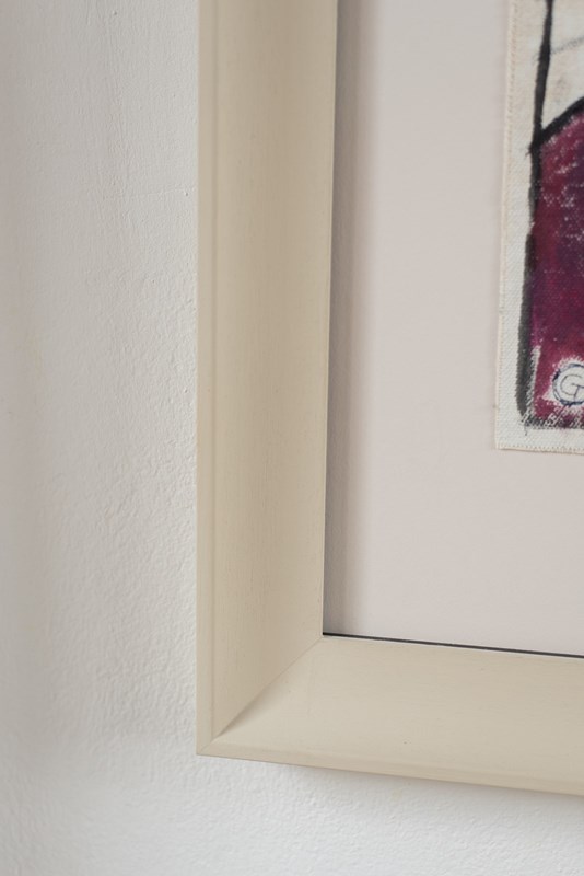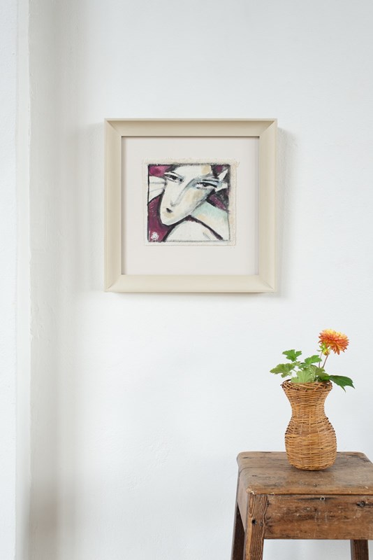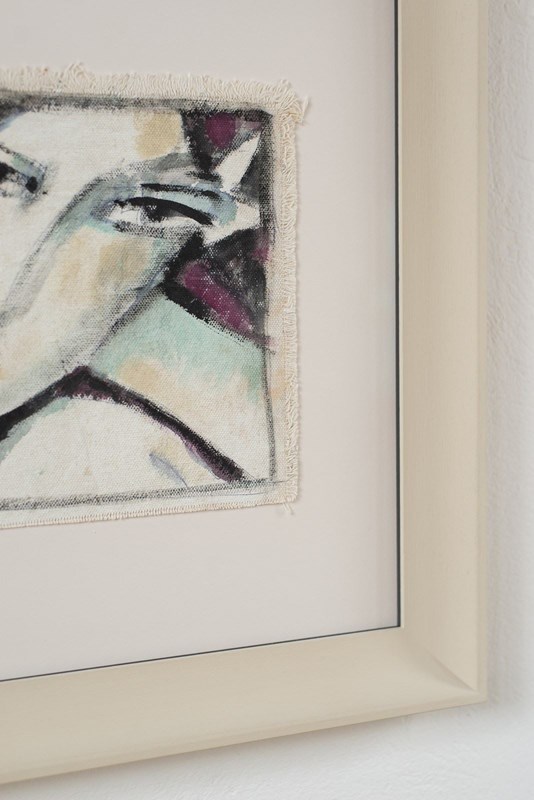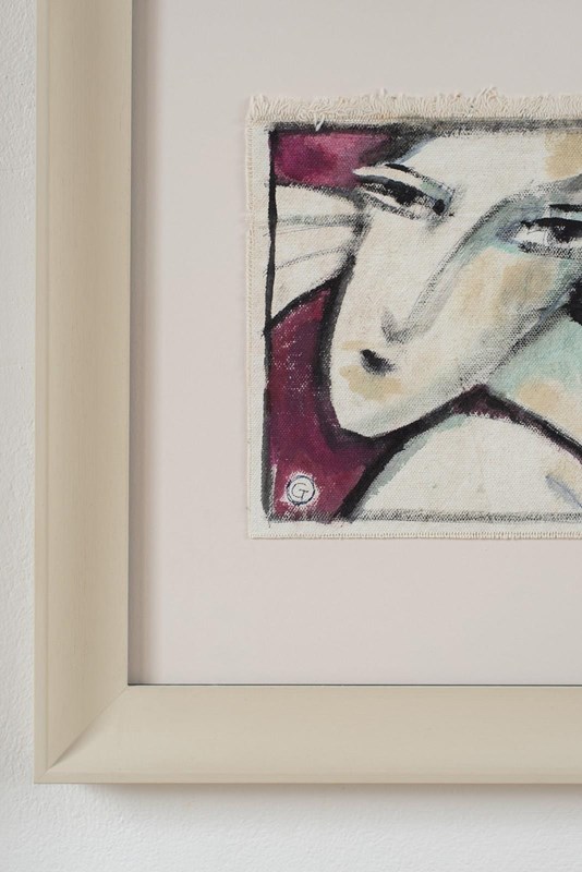 A Florentine abstract portrait in acrylic on canvas, signed by the artist, C1980. The artist uses bold colour on white, and a few confident brushstrokes to define the sitter. The artwork is presented in a hand-painted frame with contrast-painted fillet and gallery-grade glass.