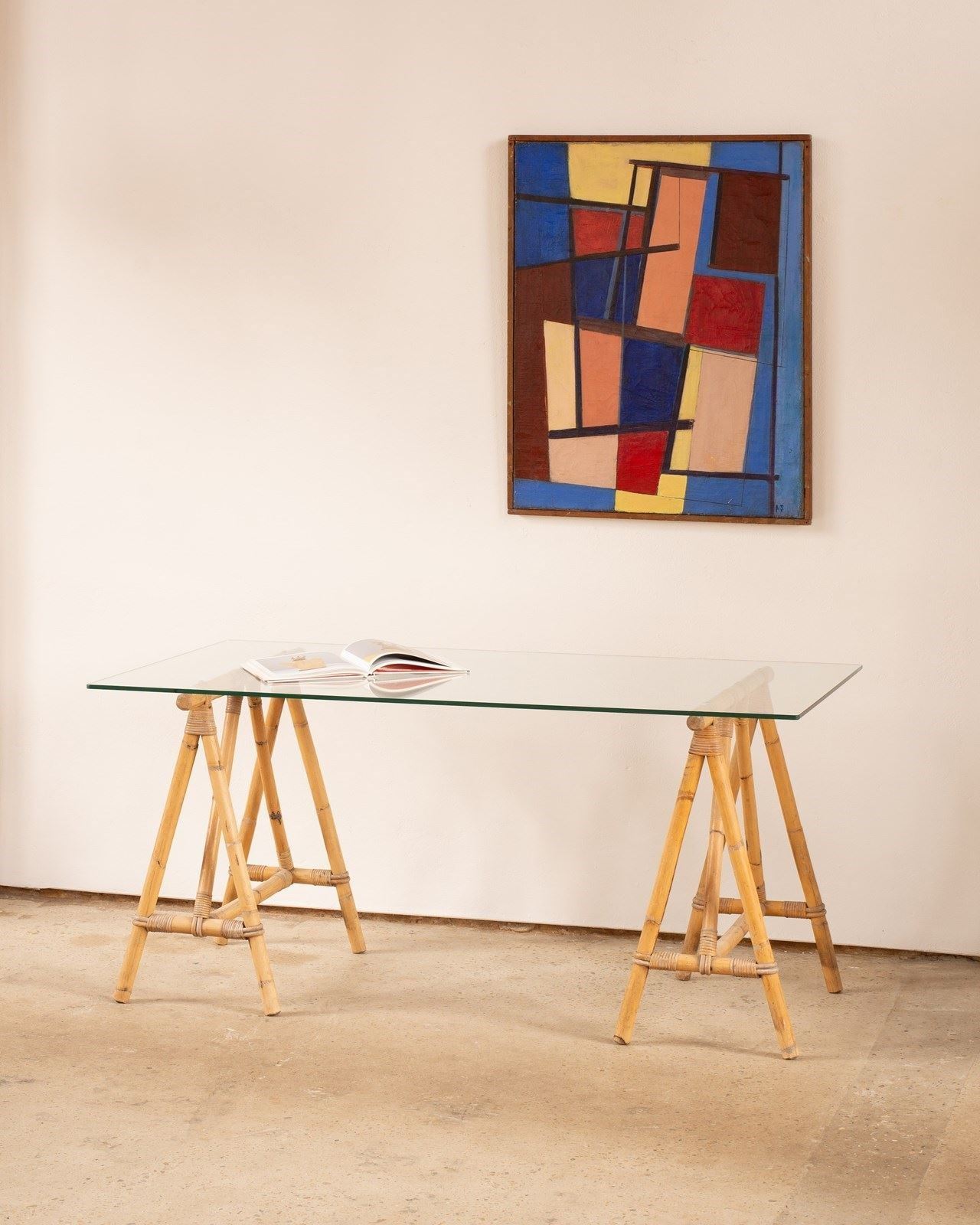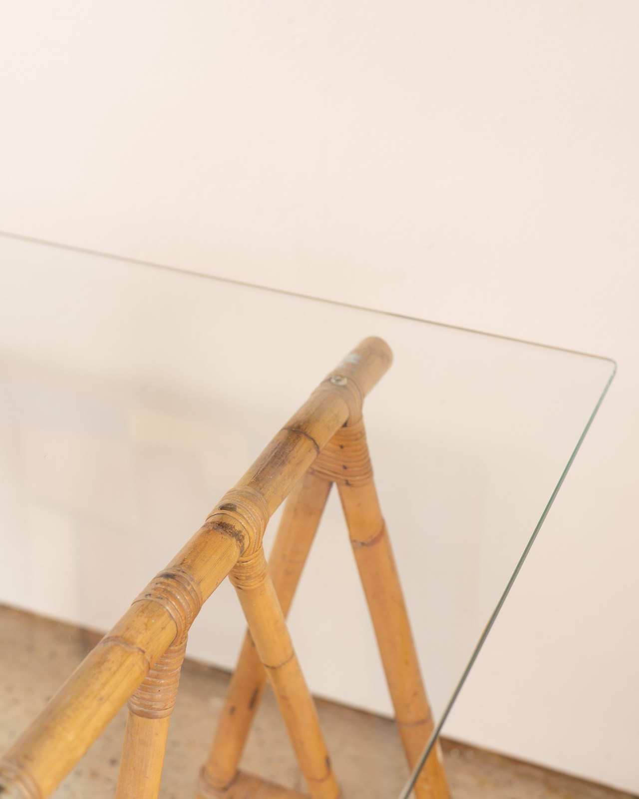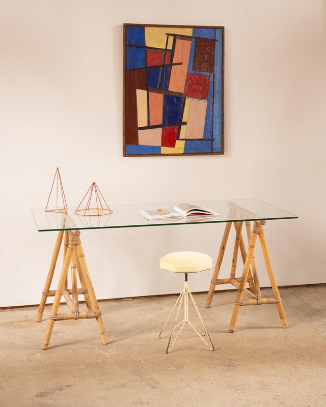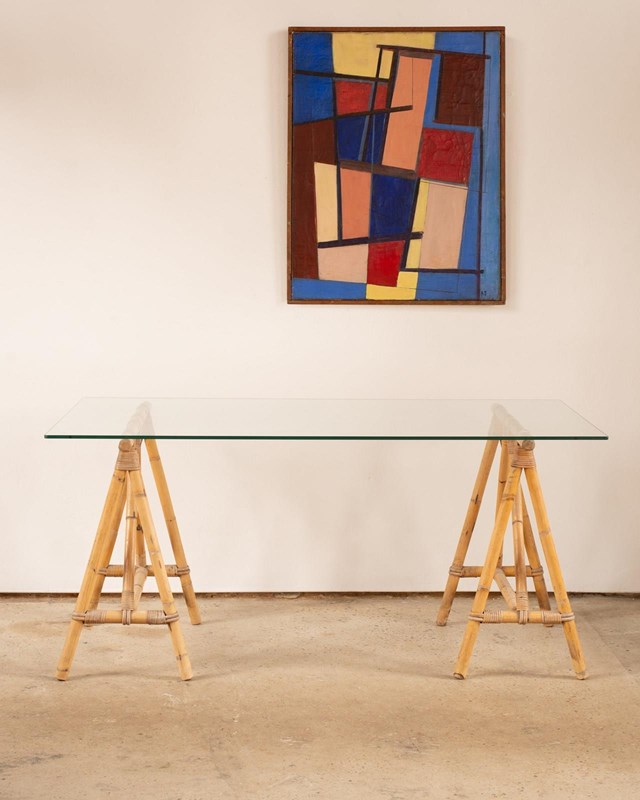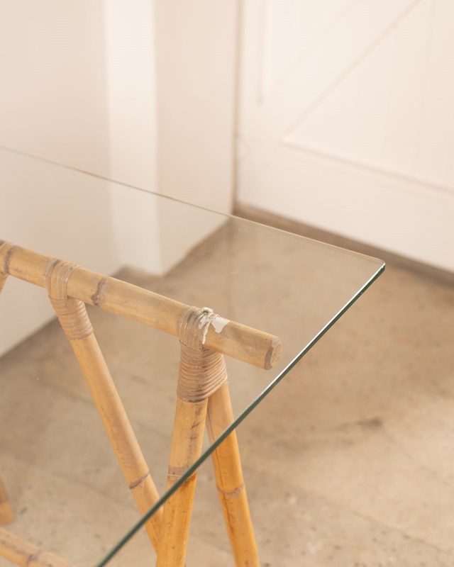 We have paired this wonderful pair of antique French bamboo trestle legs C1920 with a bespoke clear glass top, thick cut with polished radius edges. The bamboo legs, bound with split bamboo lengths at the joints are beautiful to look at and incredibly sturdy. We have styled this as a desk but it would also make a great dressing table.