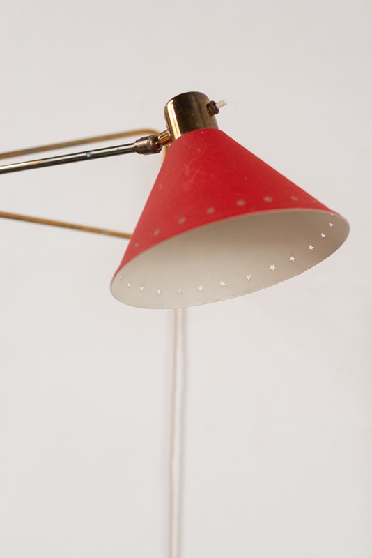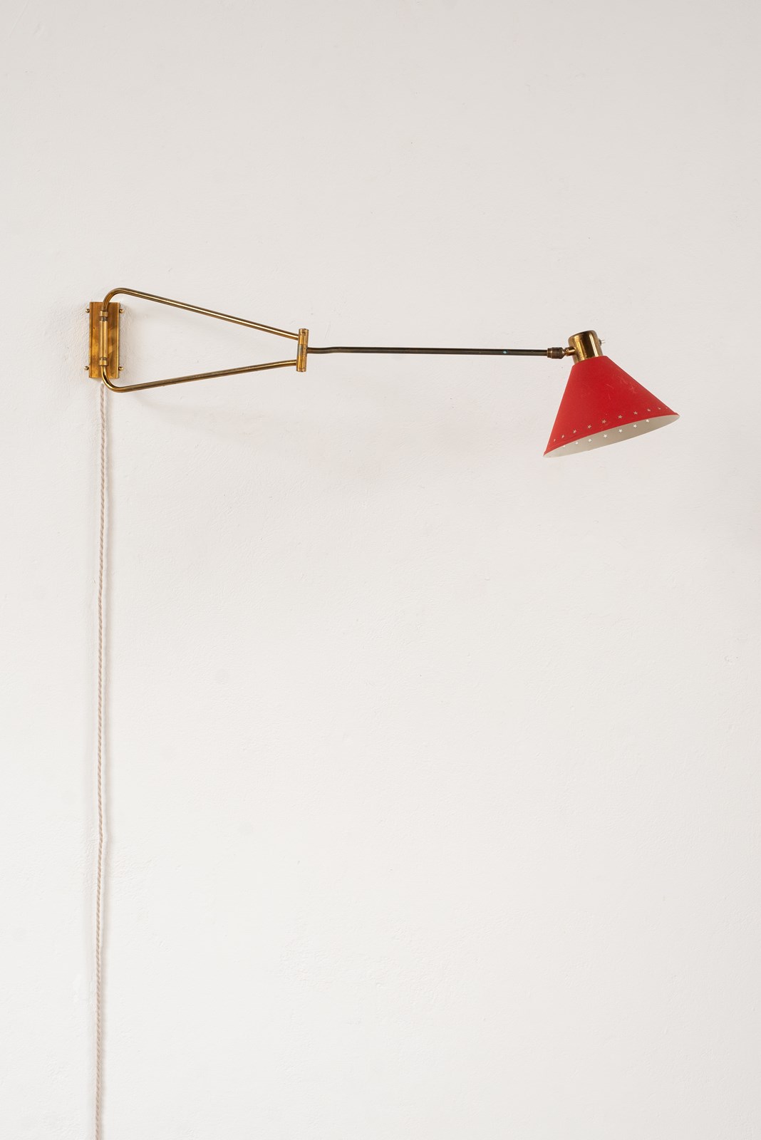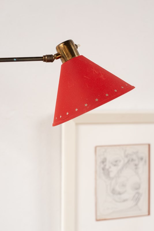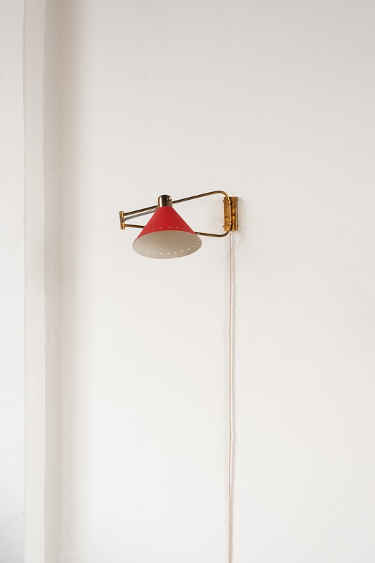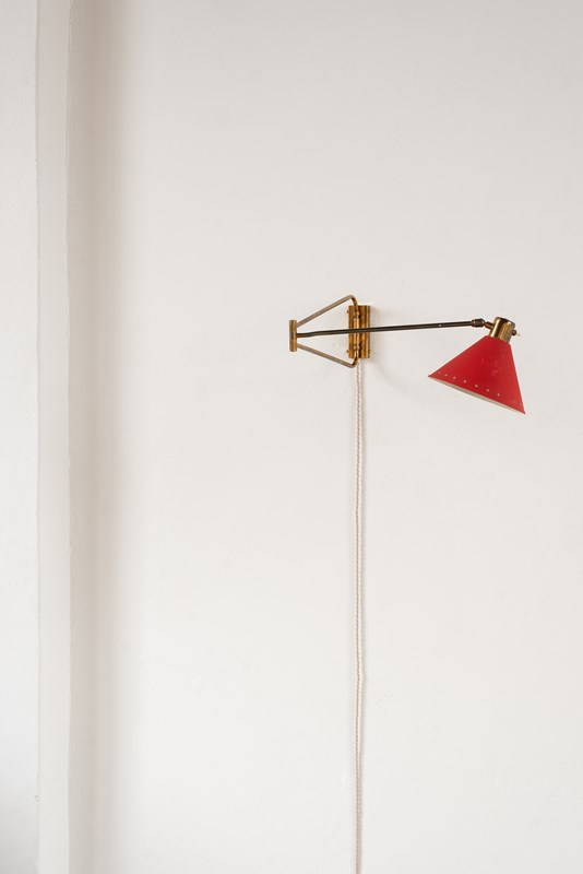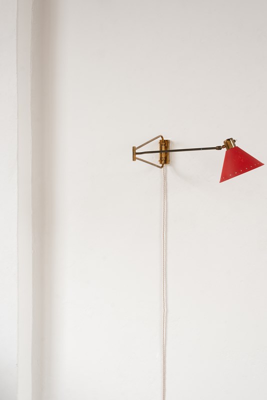 An extending brass and spun aluminium wall light from prominent French lighting manufacturer Maison Lunel, C1950.   The arm articulates on the wall fitting and along its pole, as does the tomato-red painted shade.    In good vintage condition with some light wear and oxidation to the surface.
