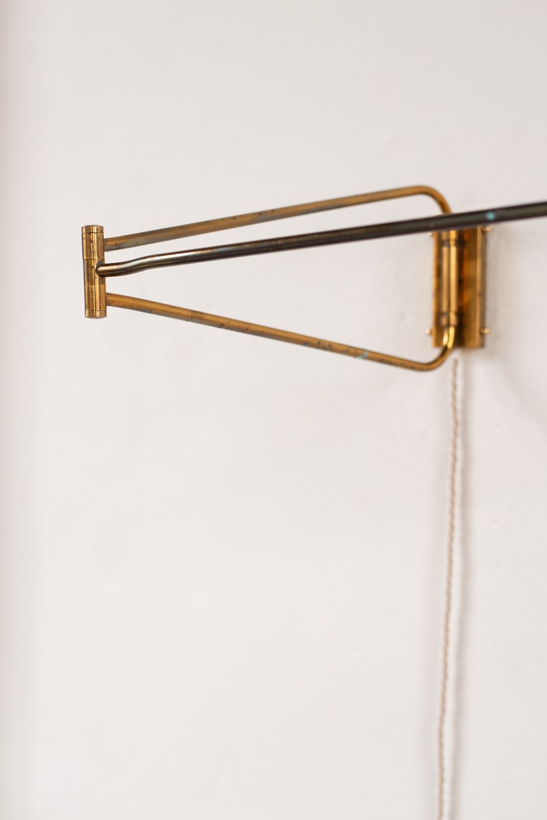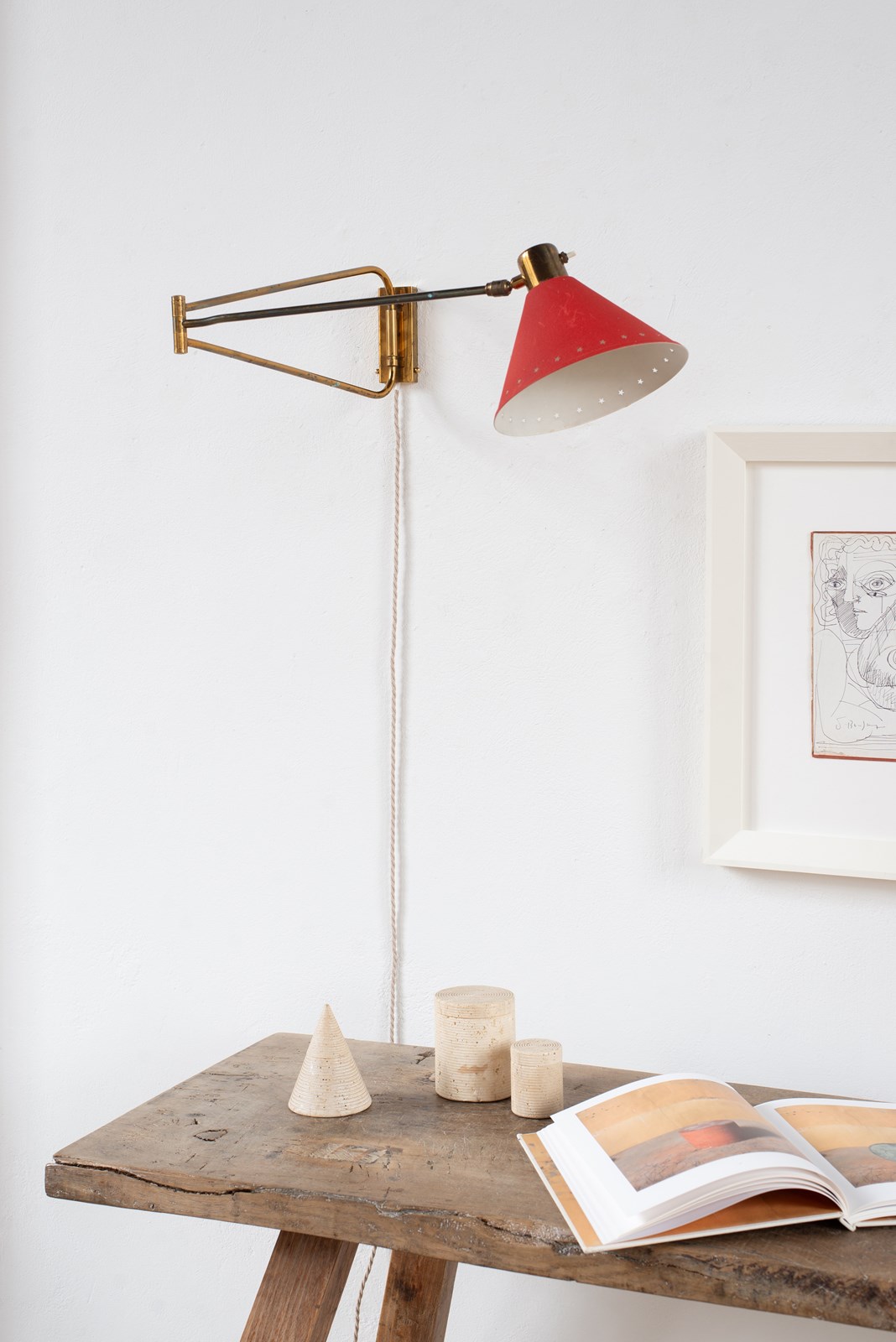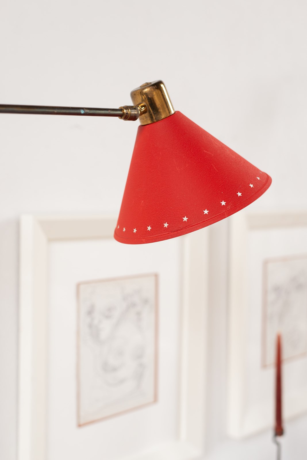 An extending brass and spun aluminium wall light from prominent French lighting manufacturer Maison Lunel, C1950.   The arm articulates on the wall fitting and along its pole, as does the tomato-red painted shade.    In good vintage condition with some light wear and oxidation to the surface.