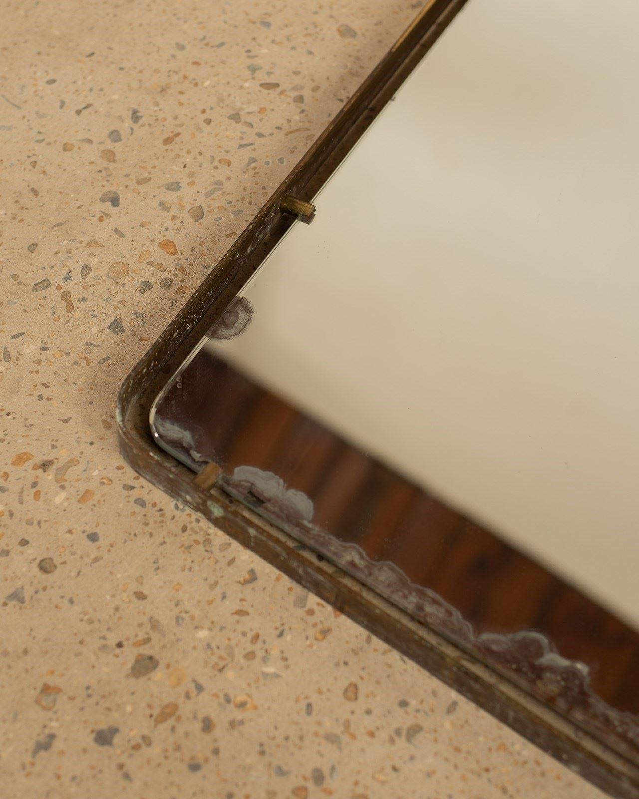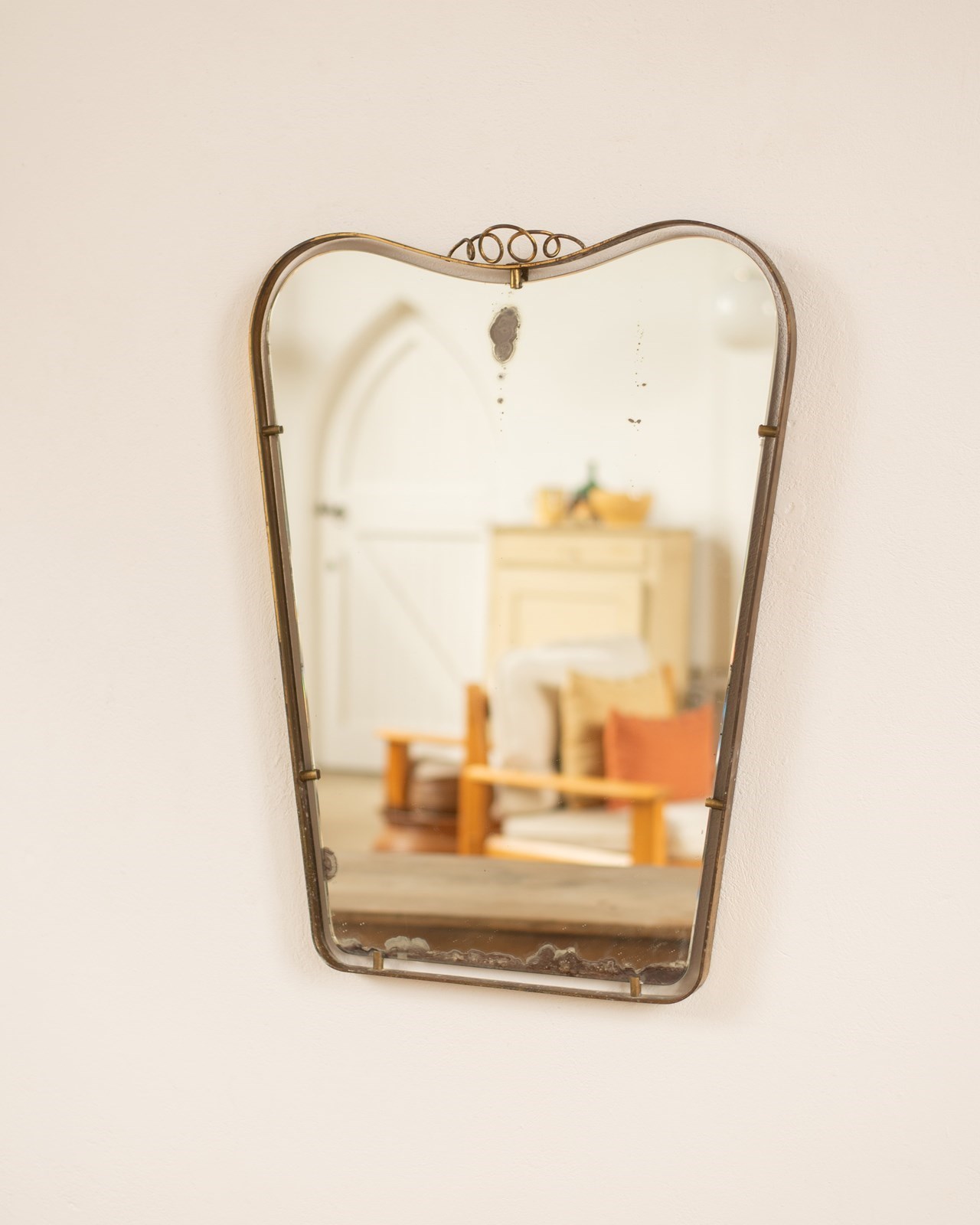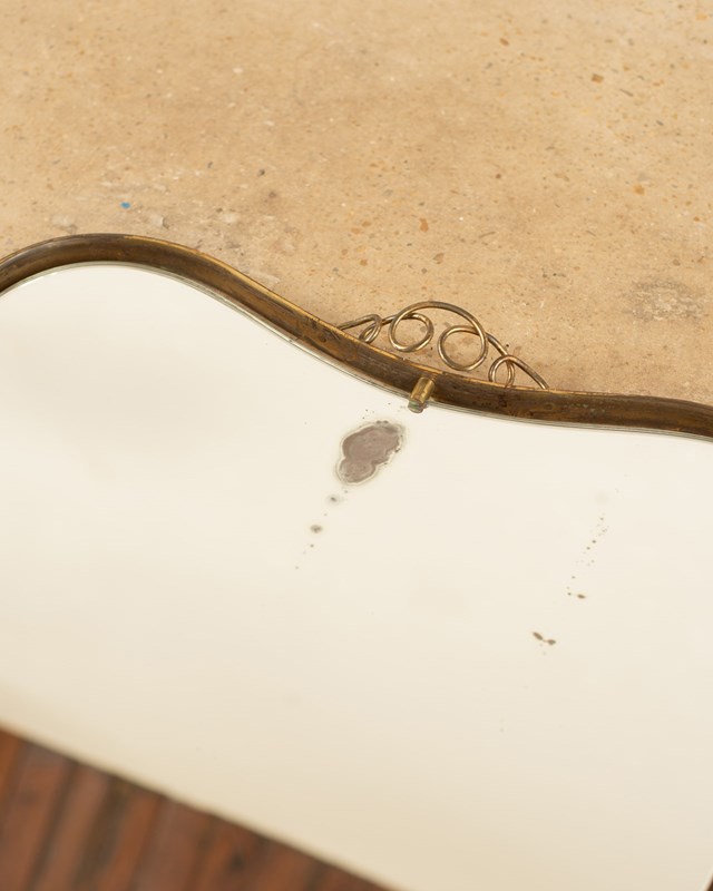 A fabulous 1950's Italian brass framed mirror attributed to Fontana Arte. The original glass floats within the torso shaped frame which is decorated with a simple fine scrolled brass detail at its head. Showing some foxing to the glass and oxidisation of the brass which we always feel adds even more appeal.