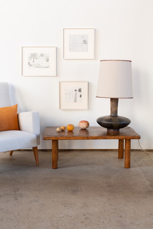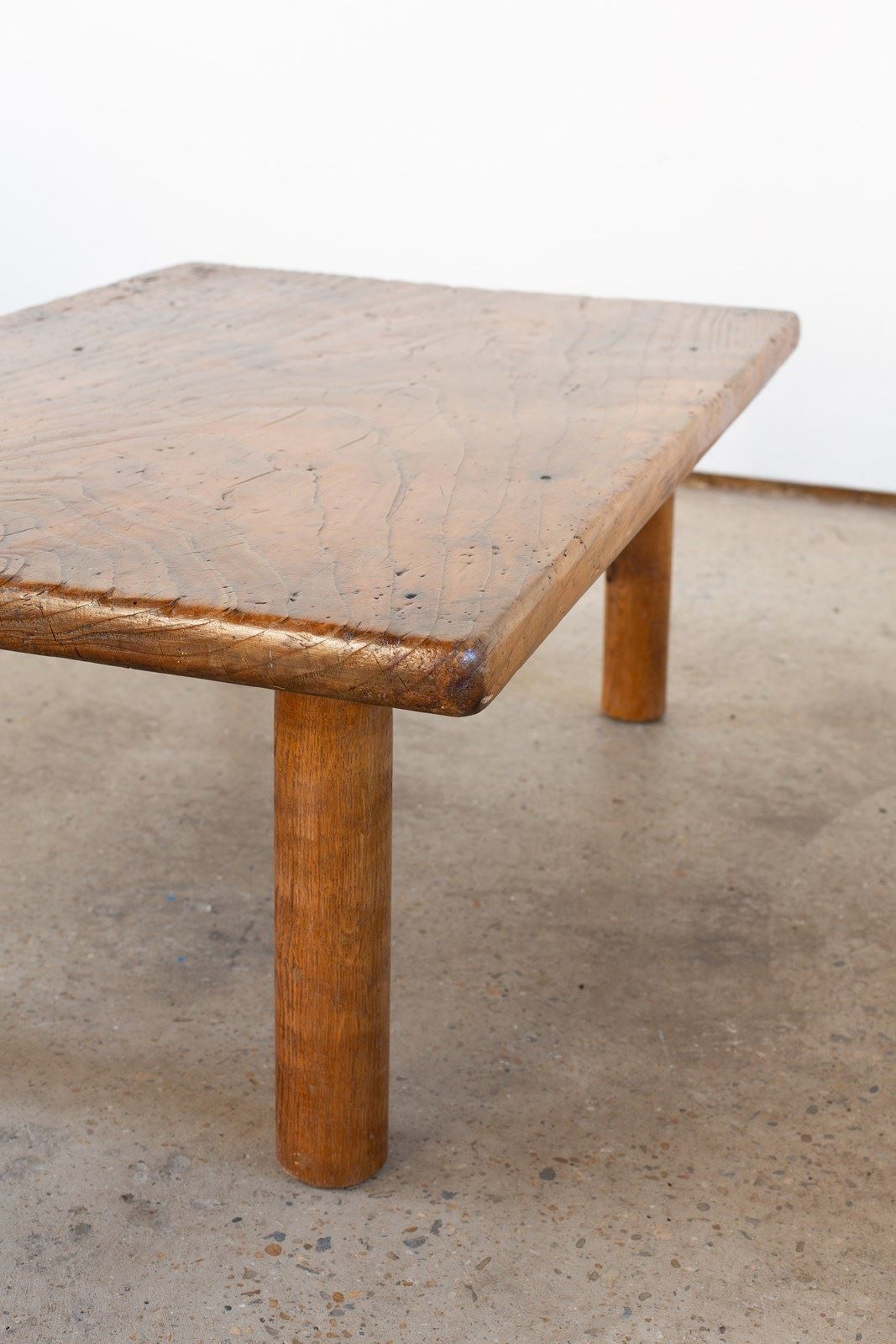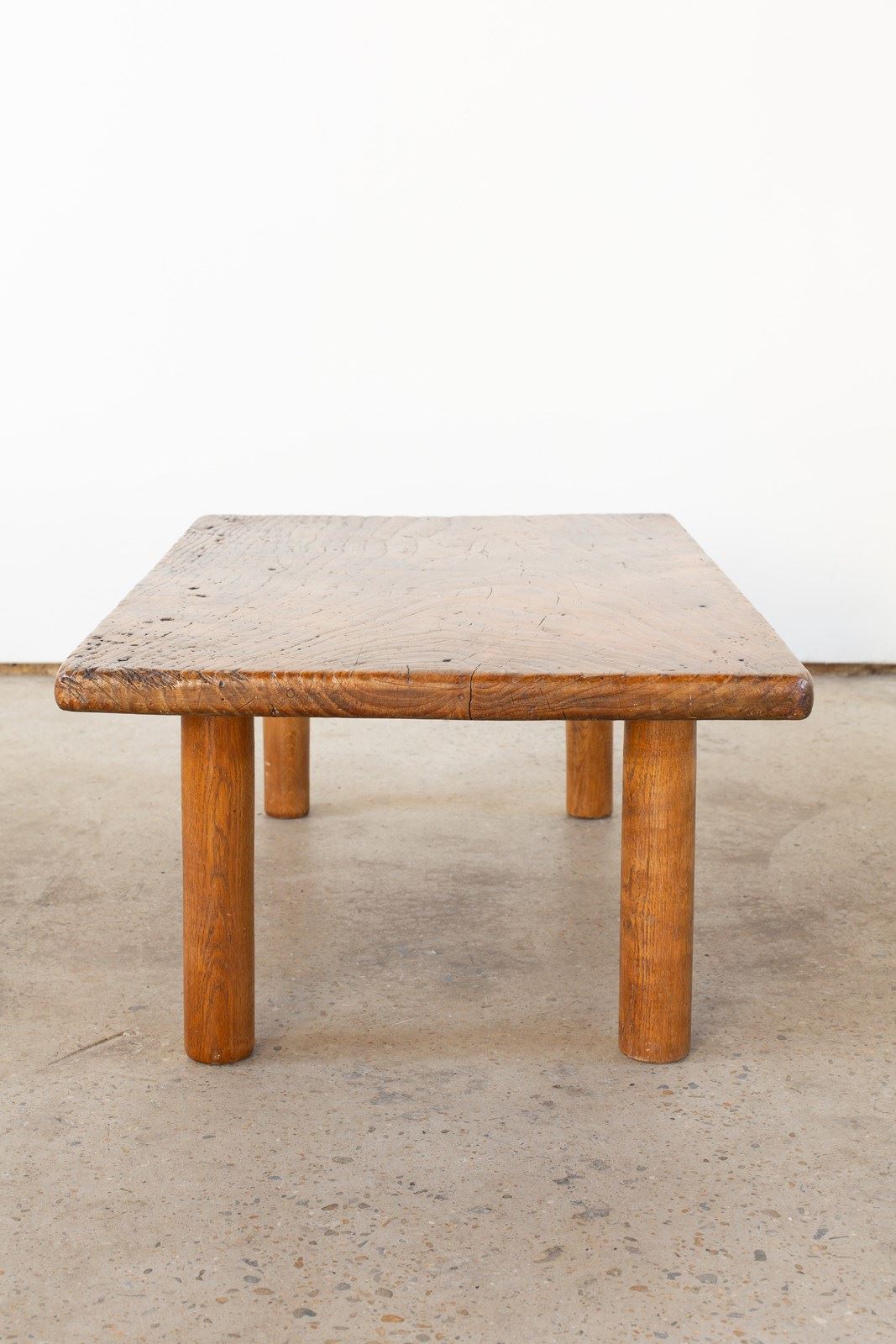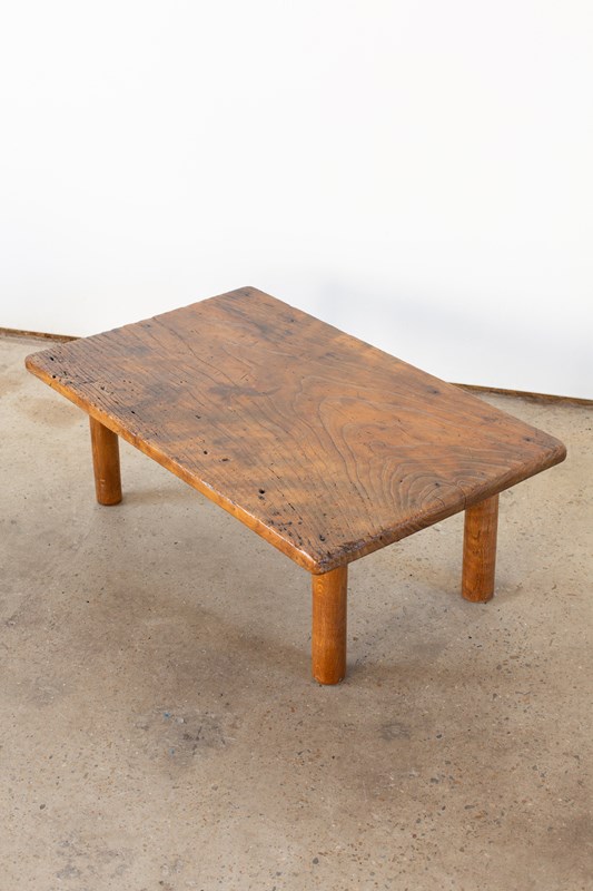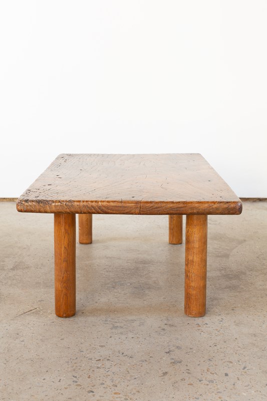 A brutalist wooden coffee table, with a rectangular top and circular legs, from Italy C1960. Handcrafted from wood with a heavily grained surface which has been beautifully buffed.  It is rich in tone, and is in good vintage condition.