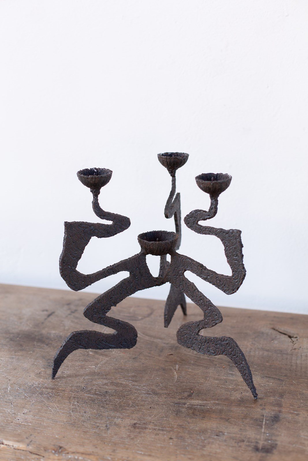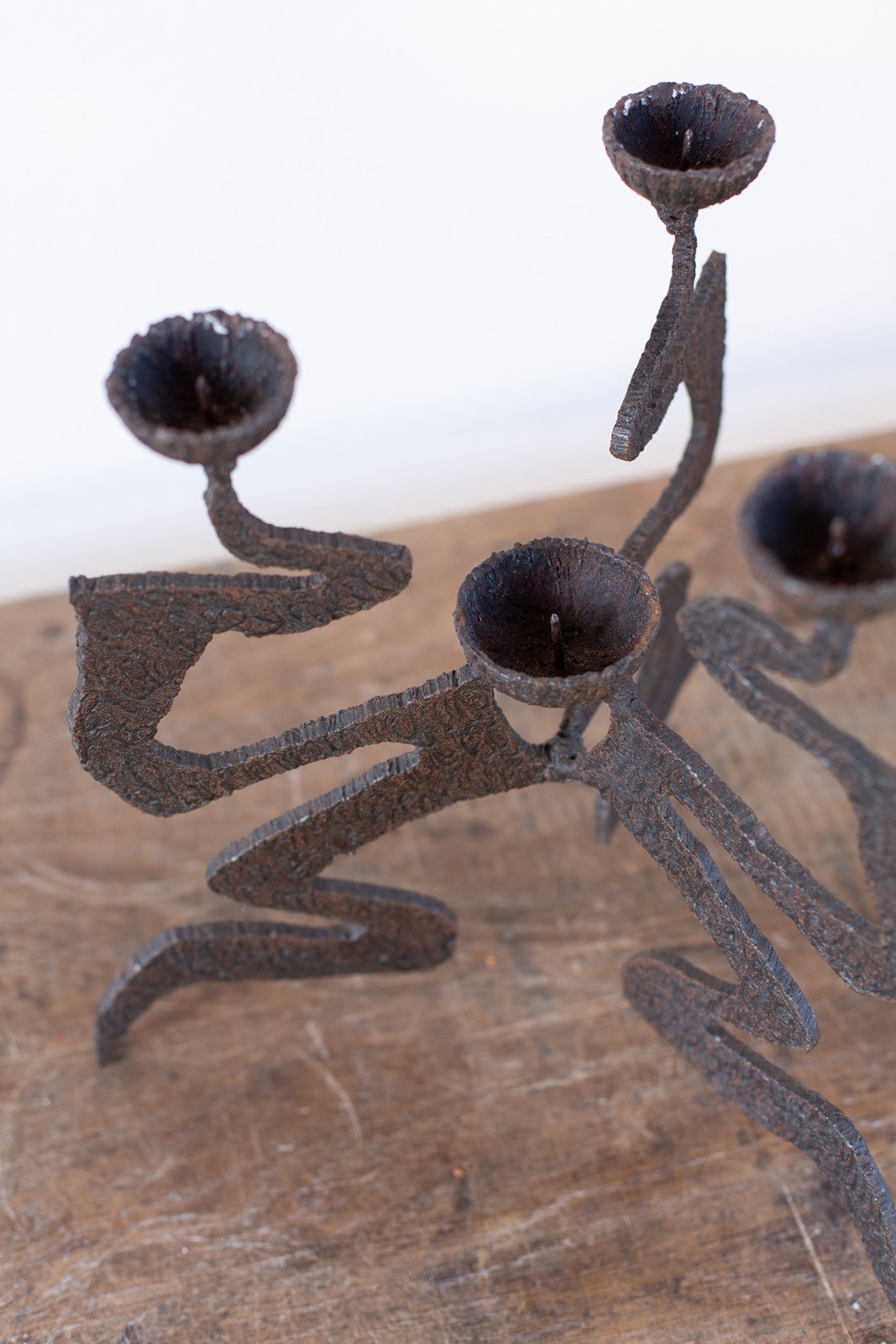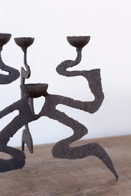 Hand forged  Brutalist candleabra from Spain, C1960.  Made from solid iron, with mark-making adding texture across the surface, these have a sculptural feel. Priced individually.